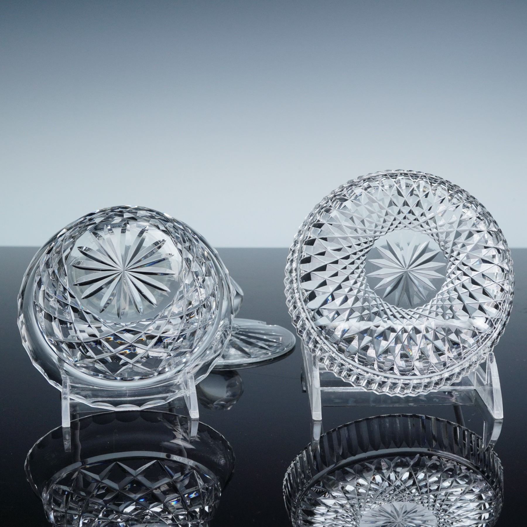 This 3-piece cut crystal set includes a lidded condiment jar, faceted finial-topped lid and round dish. The jar showcases a classic combination of crosshatch and vertical fluting, complemented by a sawtooth rim and scalloped foot. The accompanying plate echoes the jar's design in a matching radiant cut pattern. The lid features a deep starburst cut and a spoon notch, and is crowned with a bold faceted knob. Largest piece 5" dia.