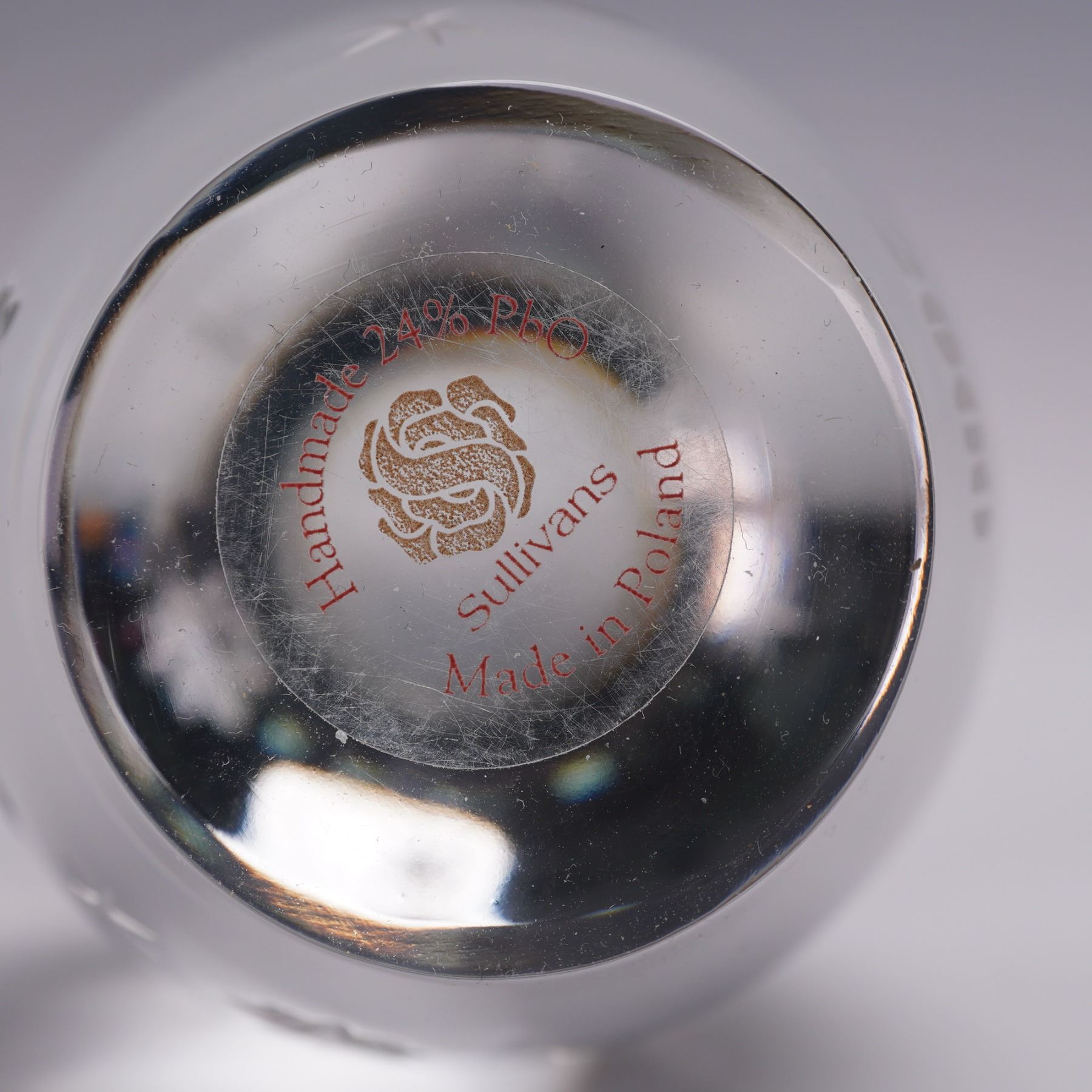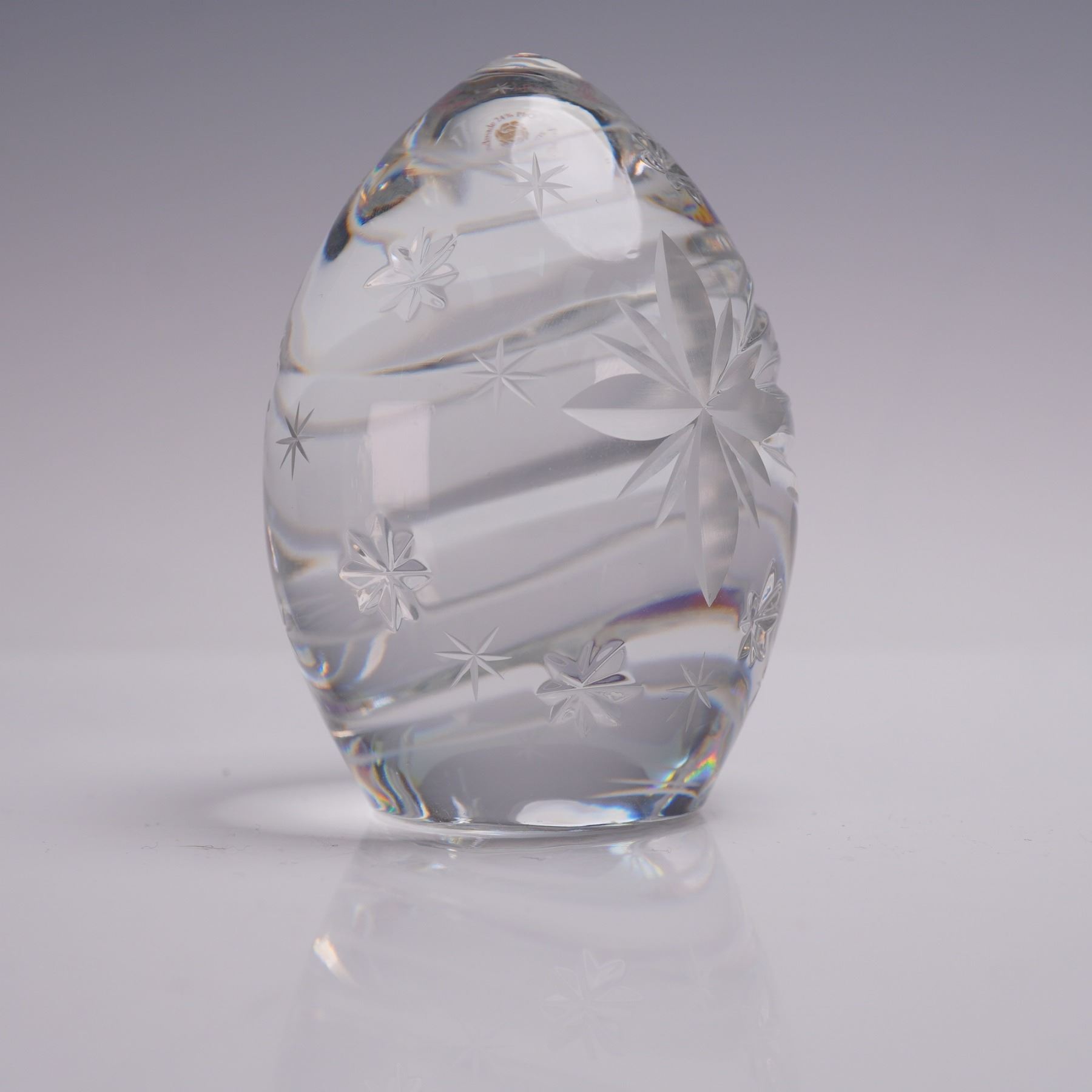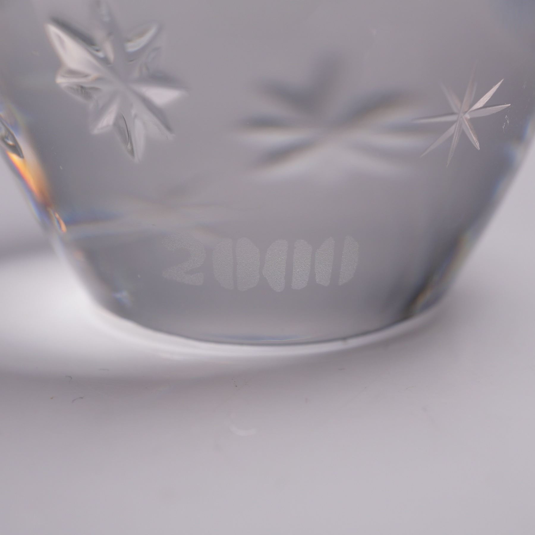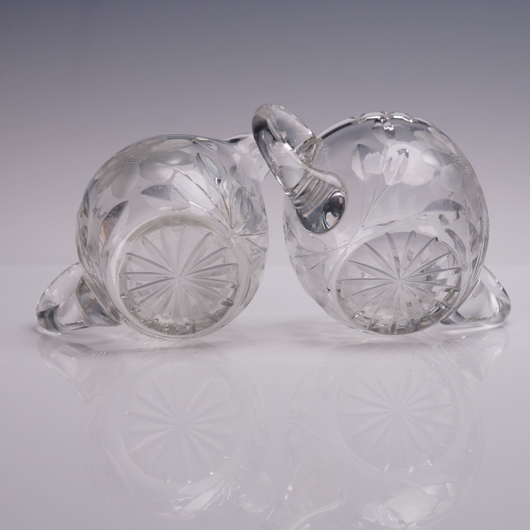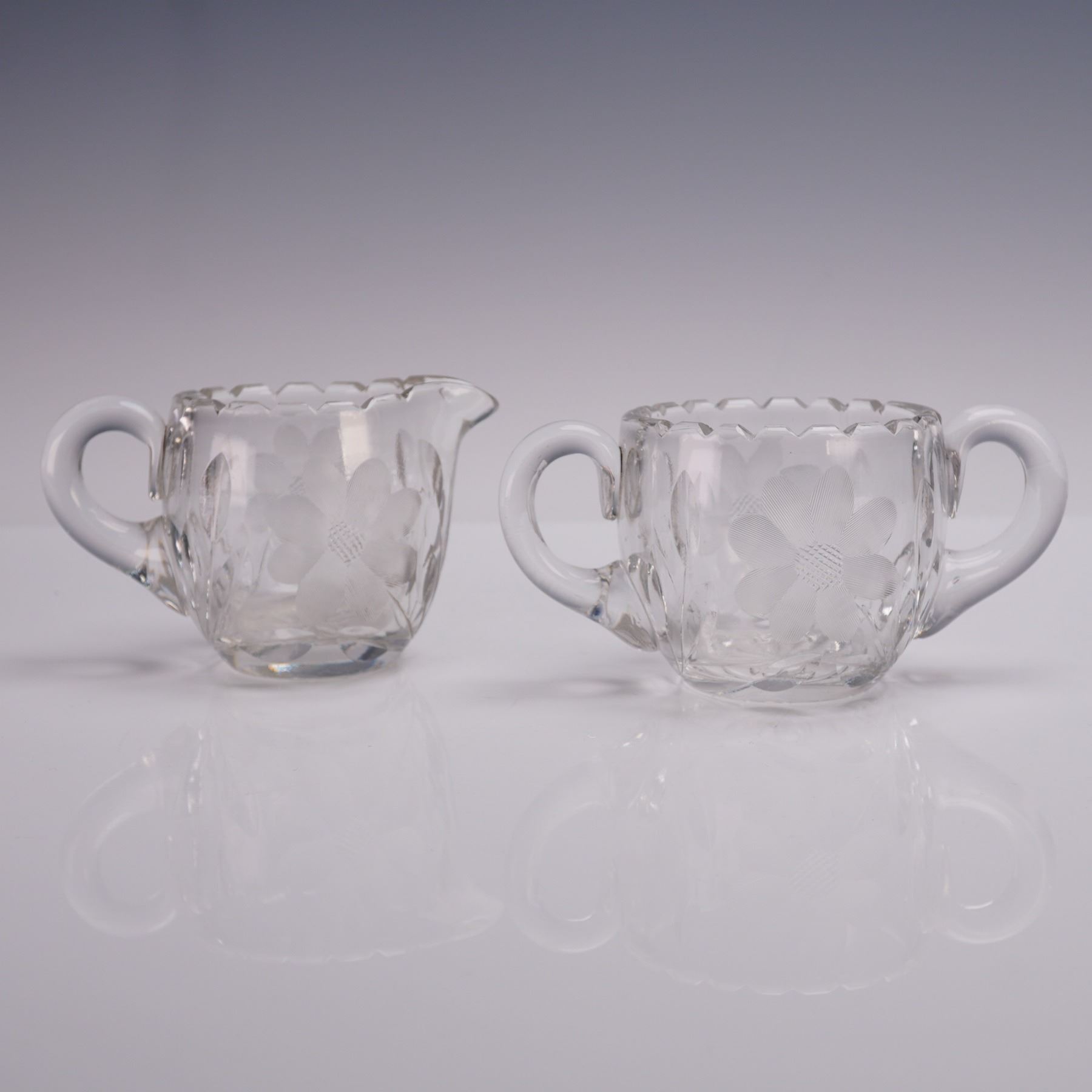 Clear glass creamer and sugar bowl set, each featuring a cut glass floral pattern with scalloped rims and white applied handles. The creamer has a single handle and spout, while the sugar bowl includes dual handles. Accompanied by a handmade glass paperweight in the shape of an egg, designed by Polish manufacturer Sullivans. The paperweight is decorated with cut glass star motifs and etched with "2000" near the base. Creamer: 5"L x 3"W x 3.25"H. Sugar bowl: 6"L x 3.5"W x 2.75"H. Paperweight: 2.25"W x 3.5"H.