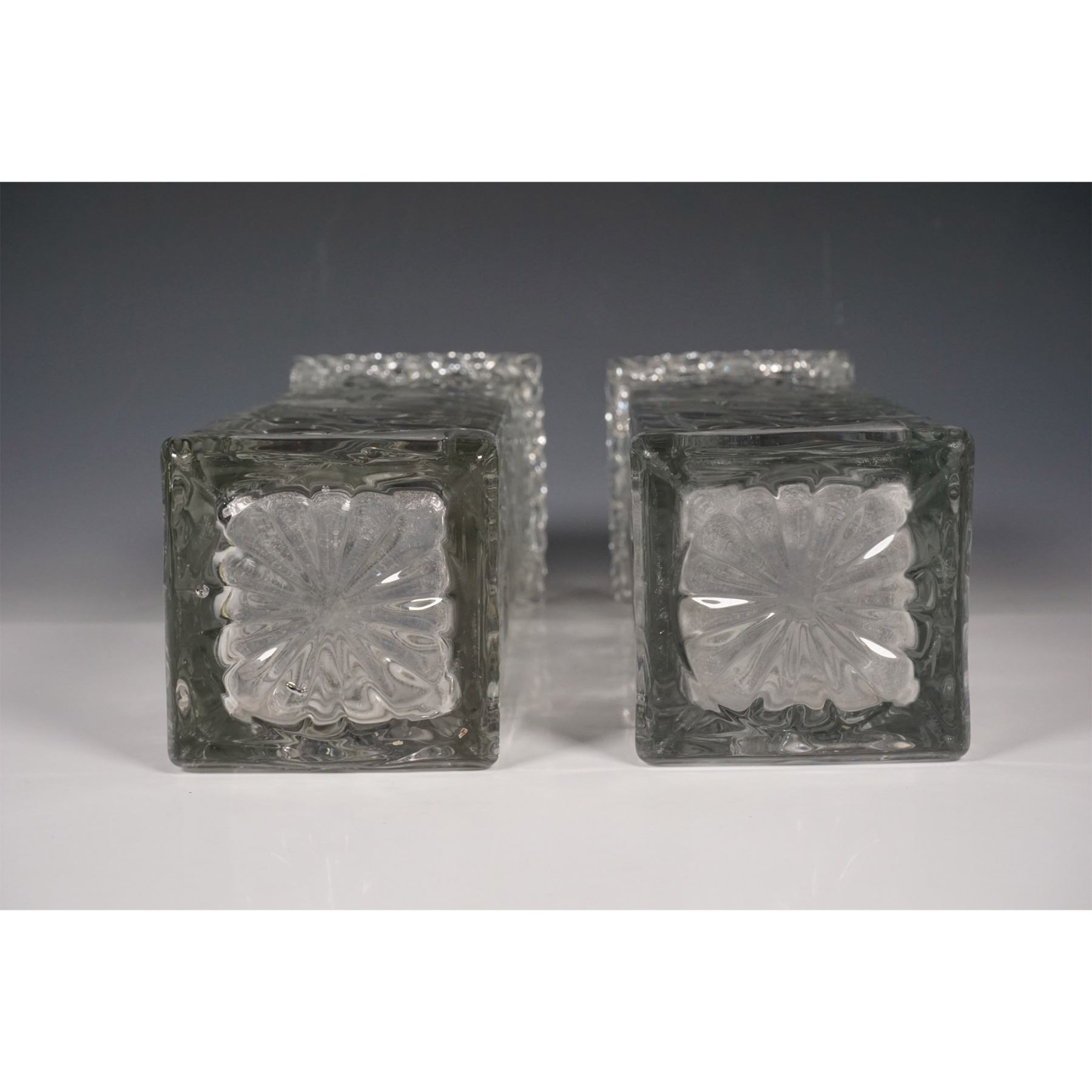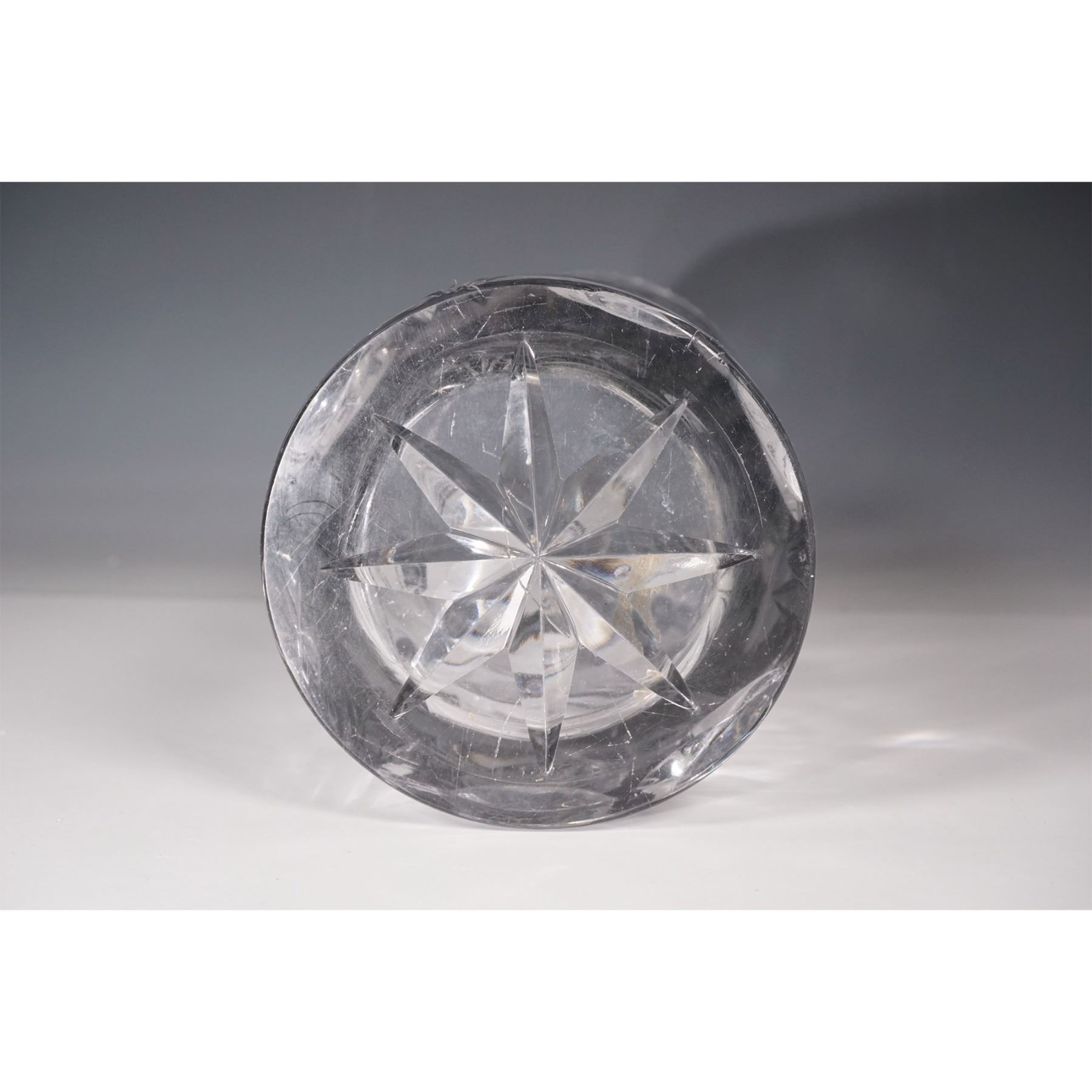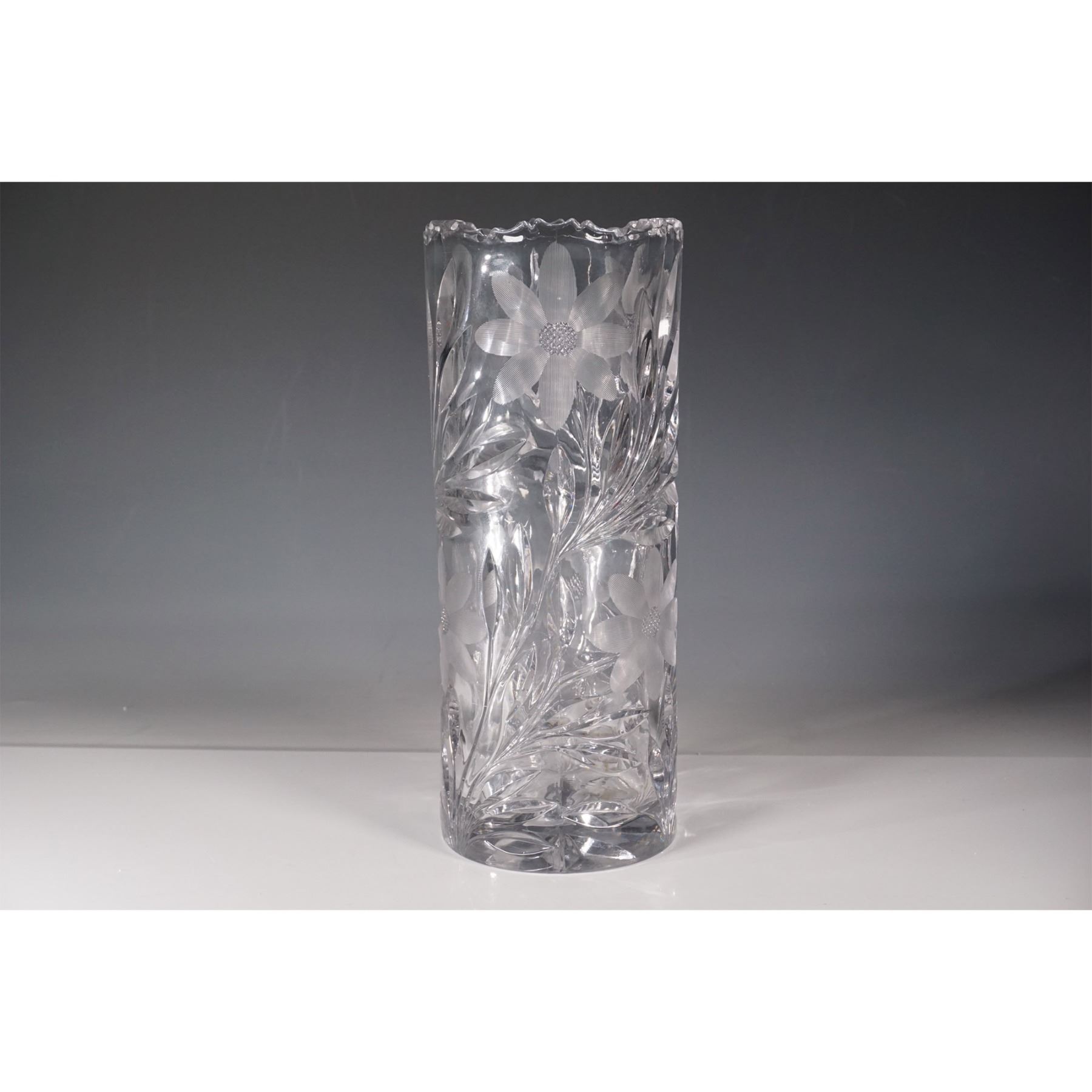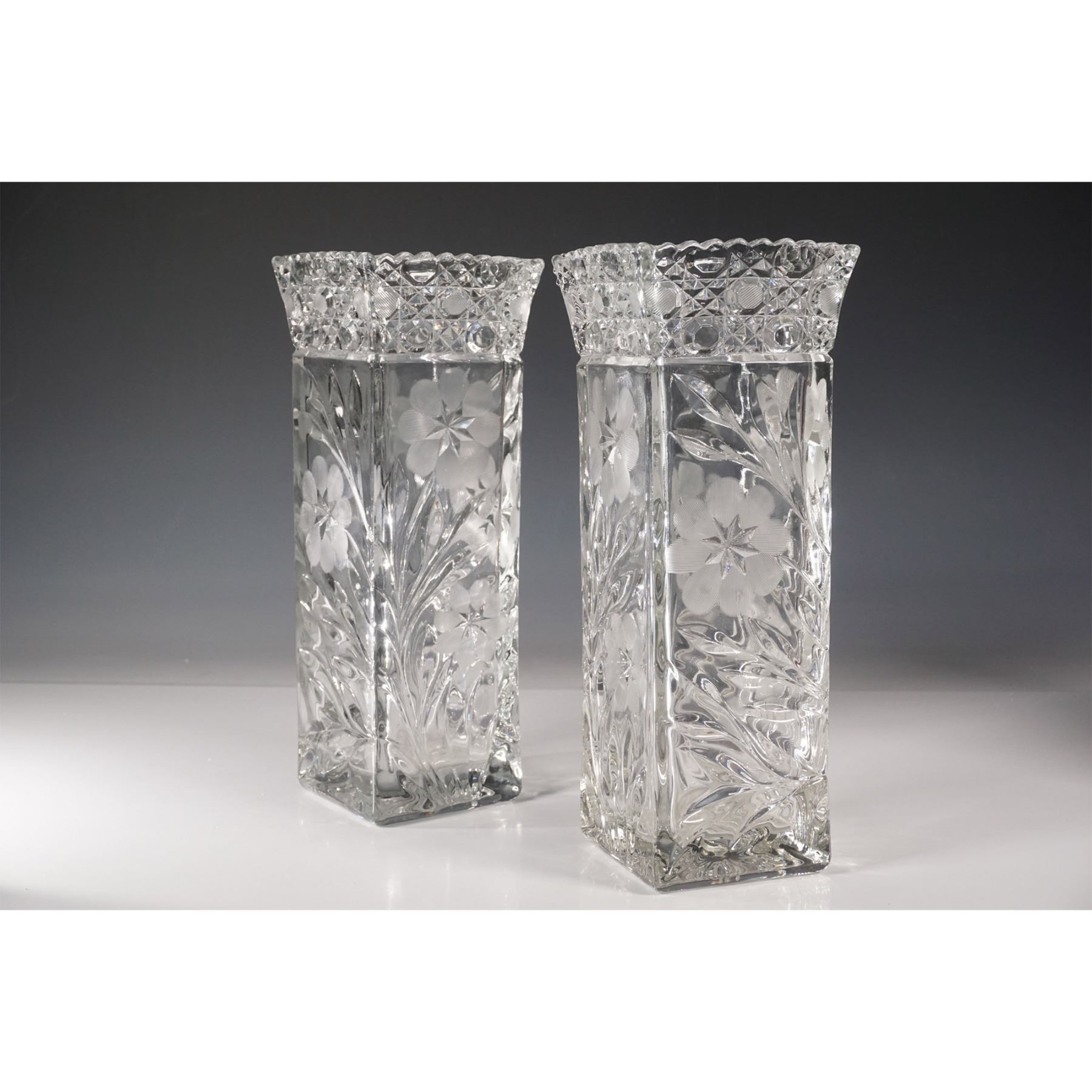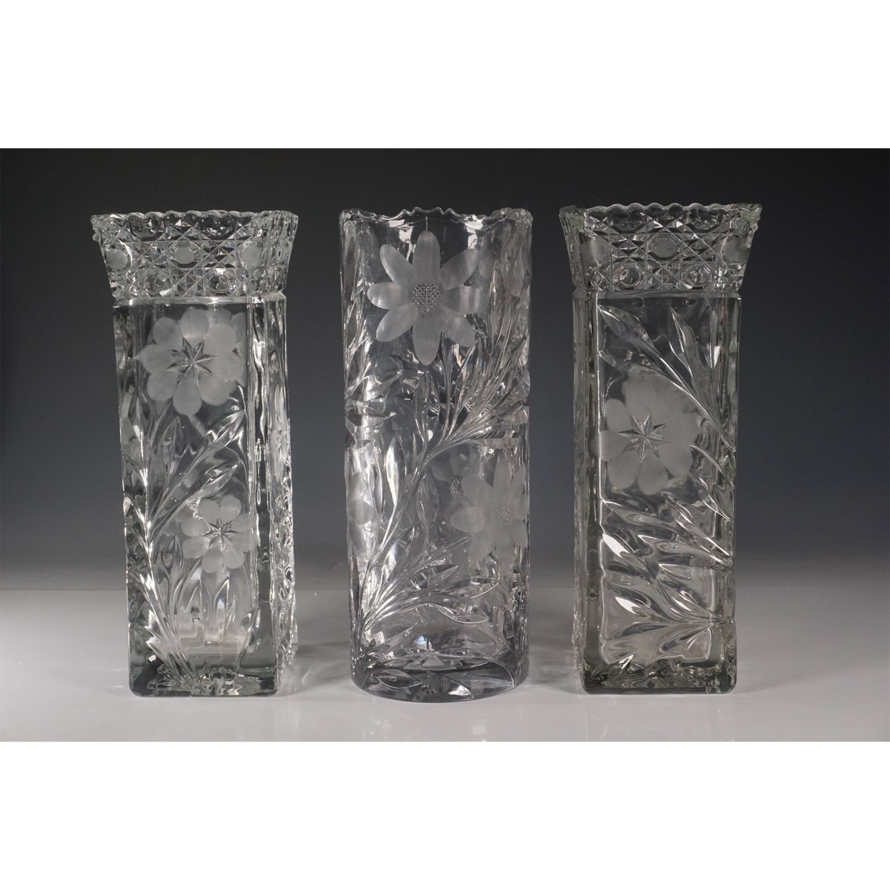 This set includes three exquisite cut glass vases, each showcasing intricate floral and leaf motifs, with delicate star patterns etched into the bases. The top edges feature a charming scalloped design, enhancing their elegant presentation. Each piece is expertly crafted with fine details, making them ideal for collectors or as decorative accent pieces.