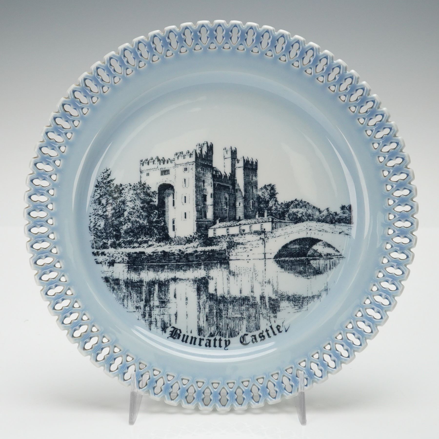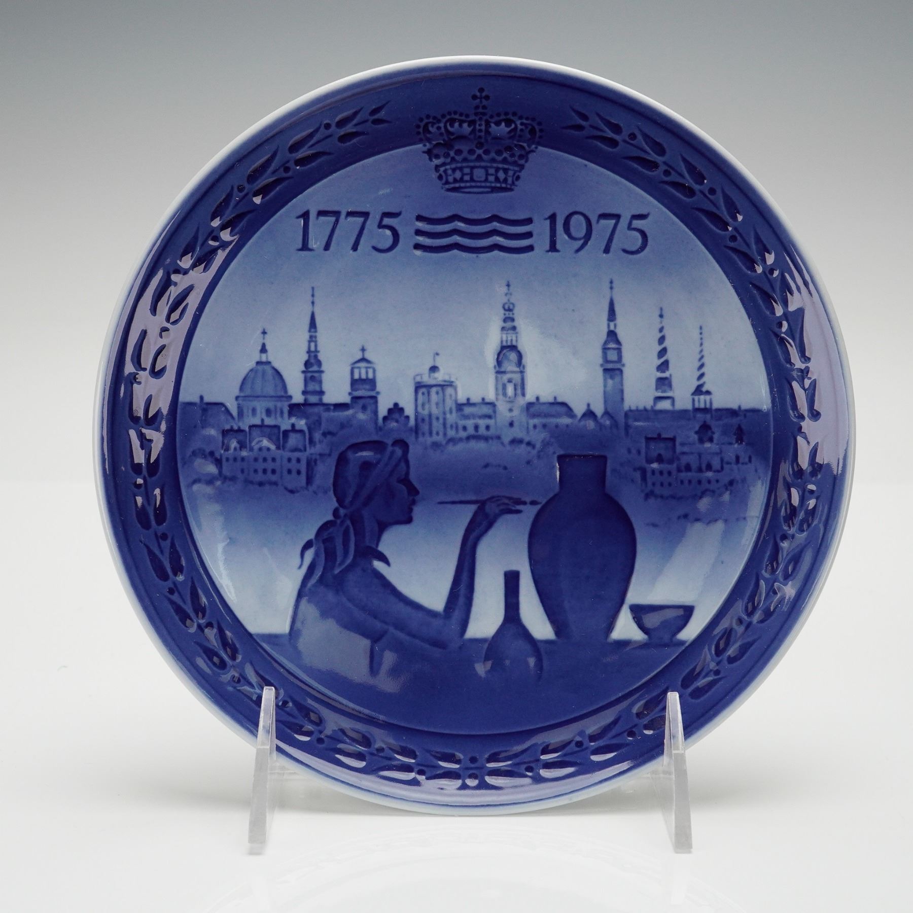 Set of three decorative porcelain collector plates from notable Danish makers. Includes two blue and white plates by Bing & Grøndahl (B&G). The third is a Royal Copenhagen bicentennial plate dated 1775-1975, commemorating the 200th anniversary of the factory with a detailed cityscape and silhouetted figures. All are backstamped and display-ready. Largest plate measures 9.25" dia.