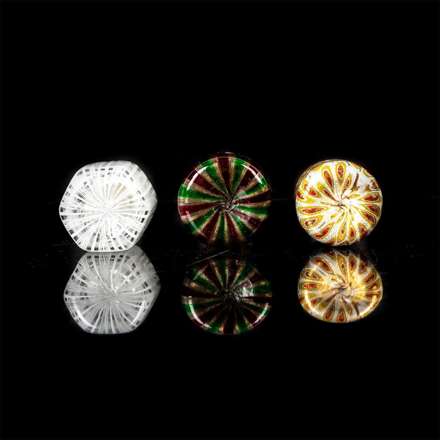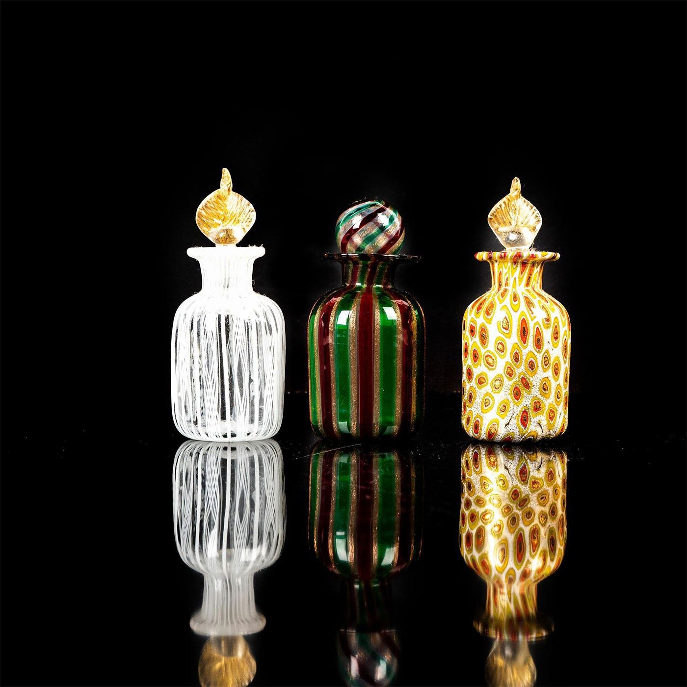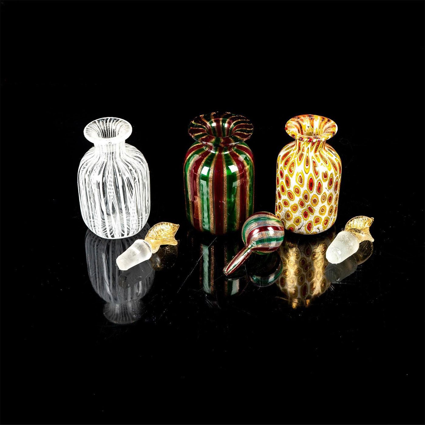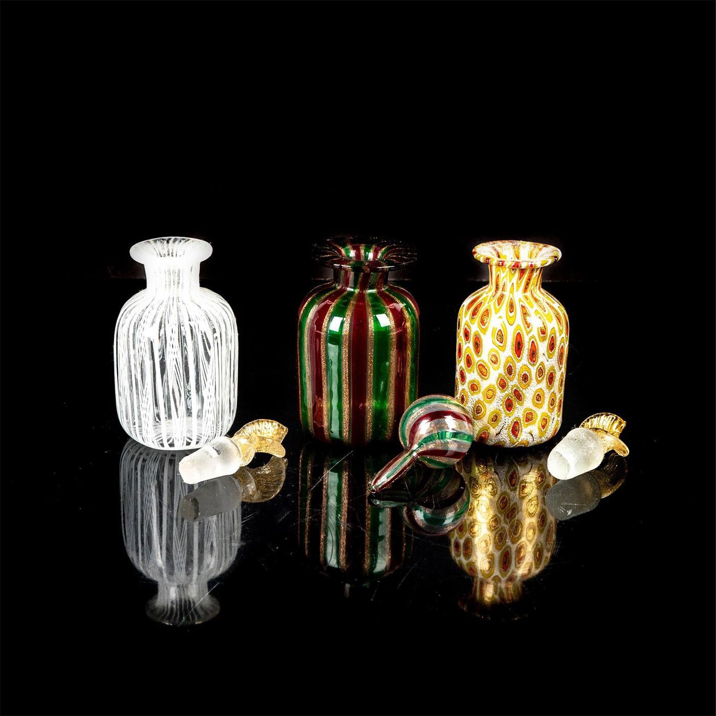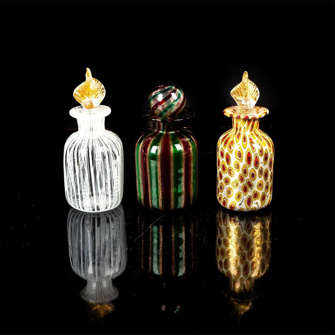 Three small glass bottles with varying designs. one is peppermint and glitter. Second is white and clear. Third is white with yellow and red cells.