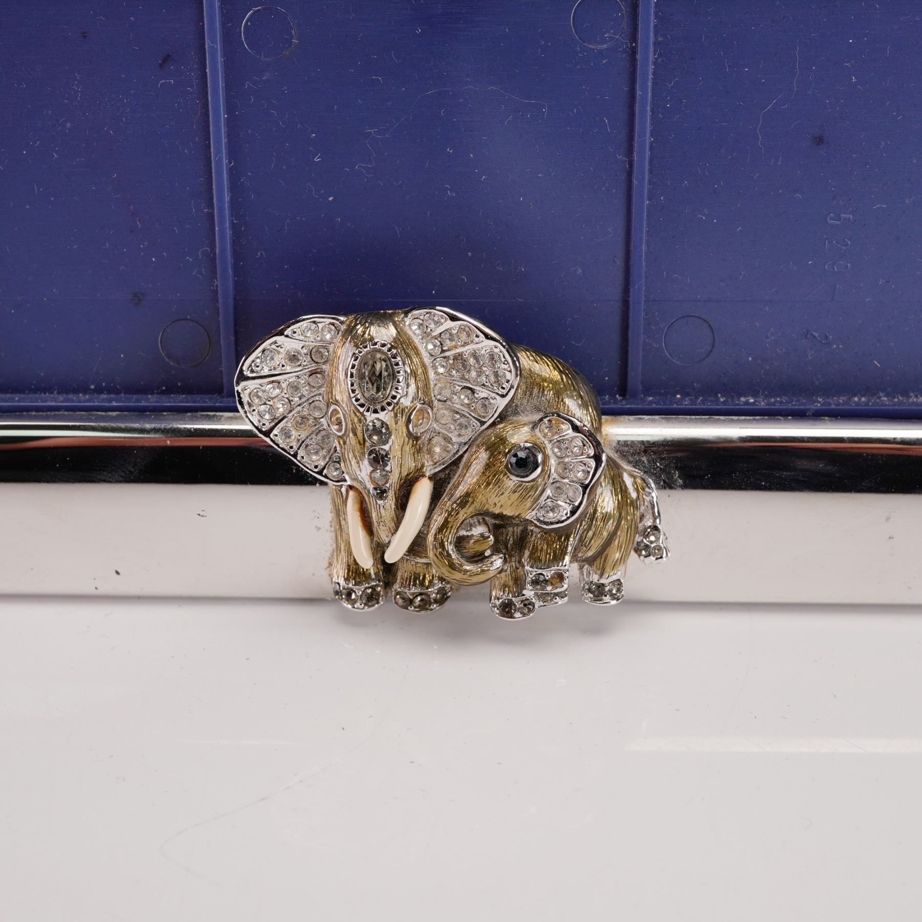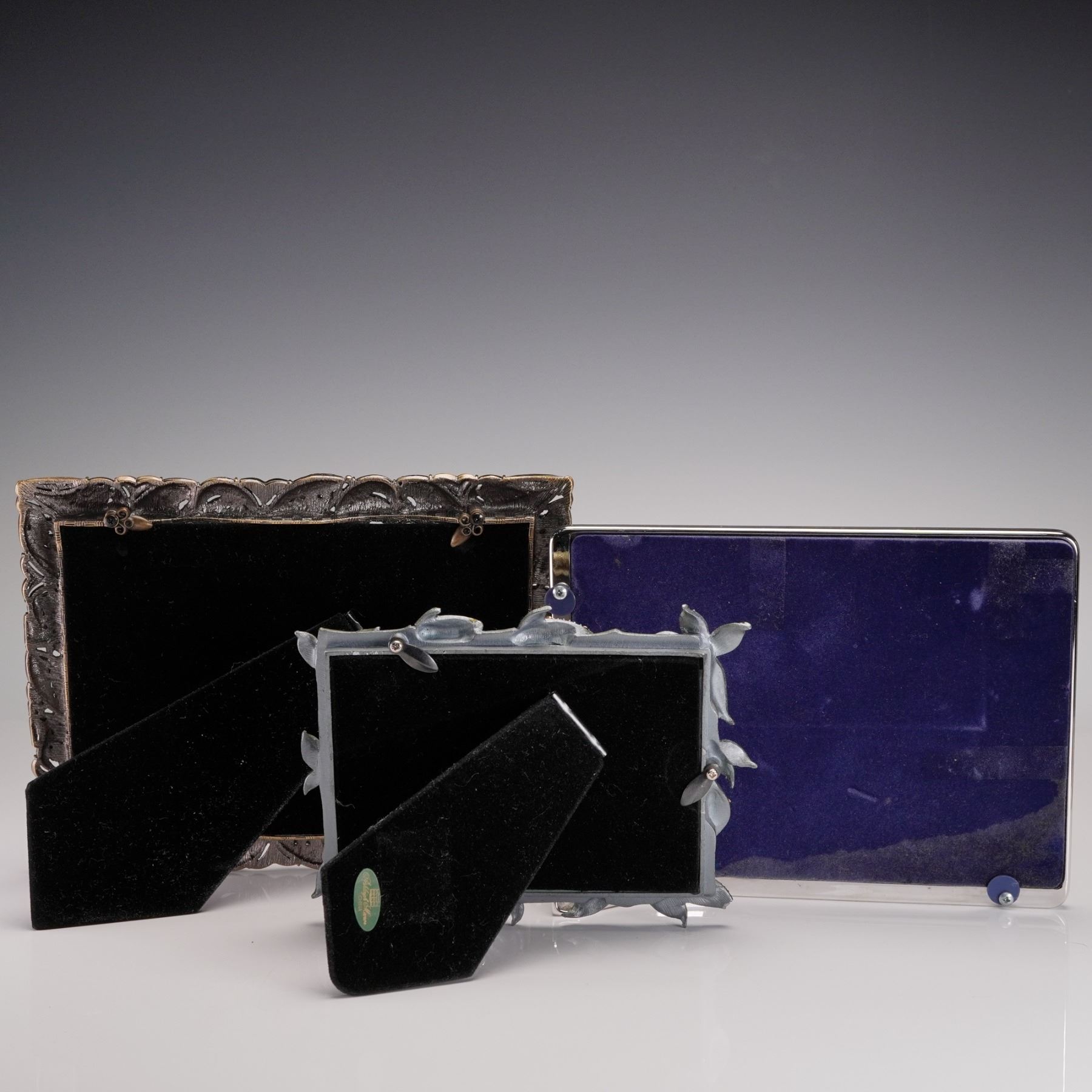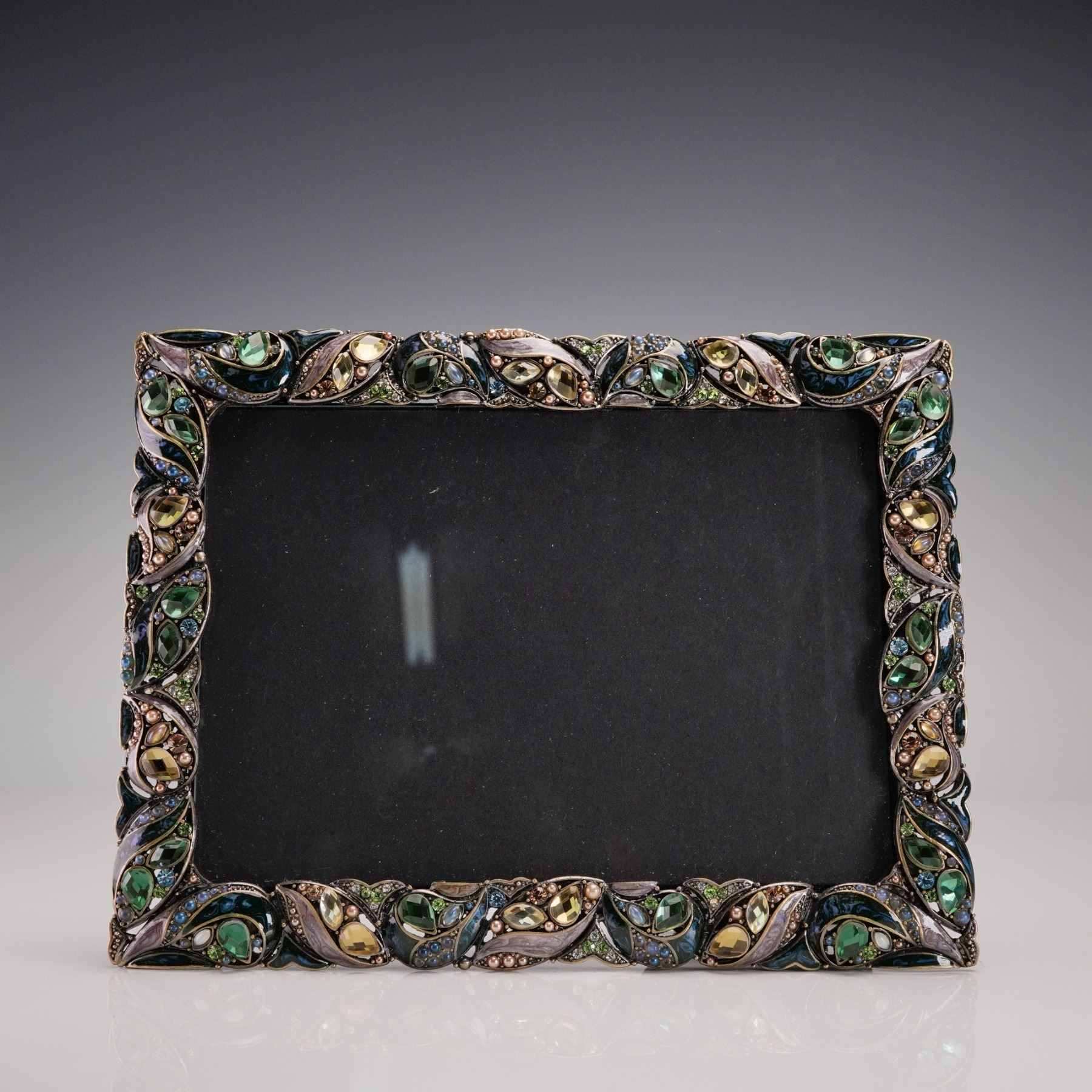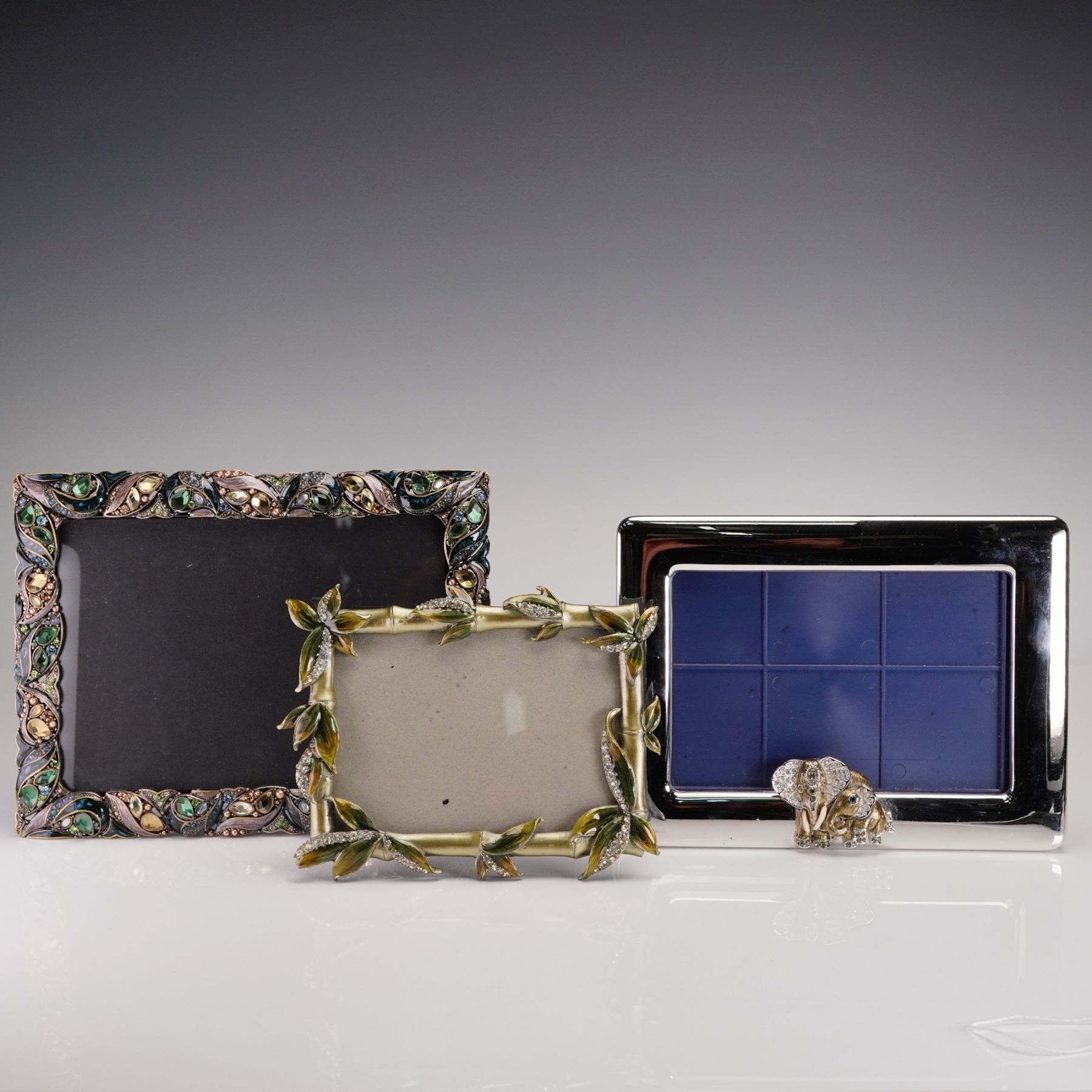 A set of three decorative tabletop picture frames in assorted styles and finishes. One features a heavily embellished border with raised leaf motifs and inset faux gemstones in green, amber, and clear tones, accented by a pewter-like patina. Another is crafted with a naturalistic bamboo-style design adorned with enameled green leaves and clear rhinestone details. The third showcases a polished silver-tone surface with a dimensional elephant figure set with clear rhinestones. Each frame includes a velvet backing and an easel support for tabletop display.