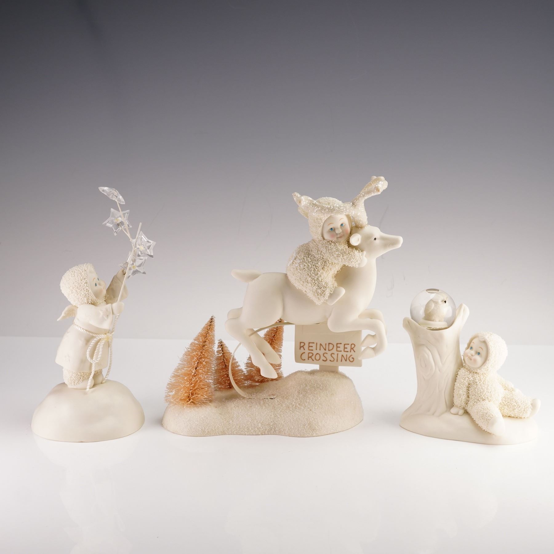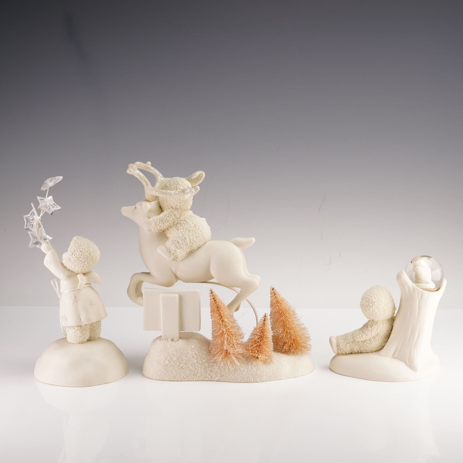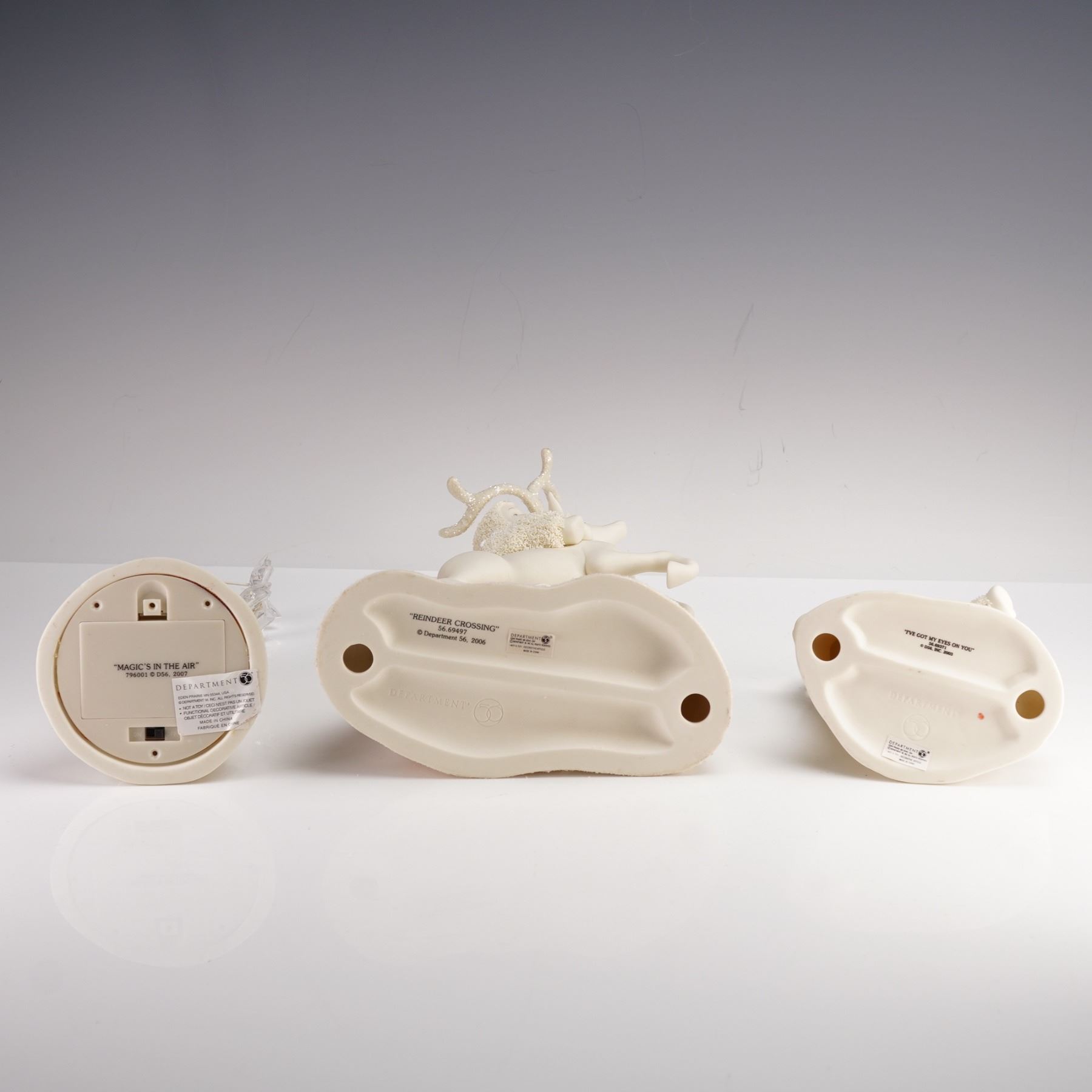 This set of Department 56 Snowbabies figurines includes Ive Got My Eyes on You, Magics in the Air, and Reindeer Crossing. Ive Got My Eyes on You shows a Snowbaby sitting beside a tree trunk watching an owl inside a clear globe. Magics in the Air features a Snowbaby lifting a cluster of clear stars with a look of wonder. Reindeer Crossing captures a joyful Snowbaby riding a leaping reindeer surrounded by soft bottle brush trees. Each figure is finished in creamy tones with textured snowlike surfaces and sweet expressive faces. Department 56 backstamp.
