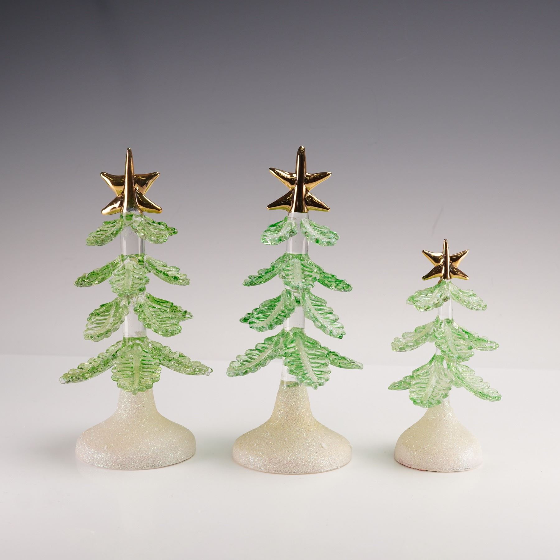This 3 piece Department 56 Snowbabies Glittered Glass Tree set includes two large trees and one small. Each tree features delicate green leaves dusted with glitter that shimmer in the light. The white bases are coated in fine glitter for a soft snowy effect, and each tree is topped with a golden star that adds a warm festive sparkle. One large tree has its original box. Box measures: 8"L x 4.25"W x 4.5"H.