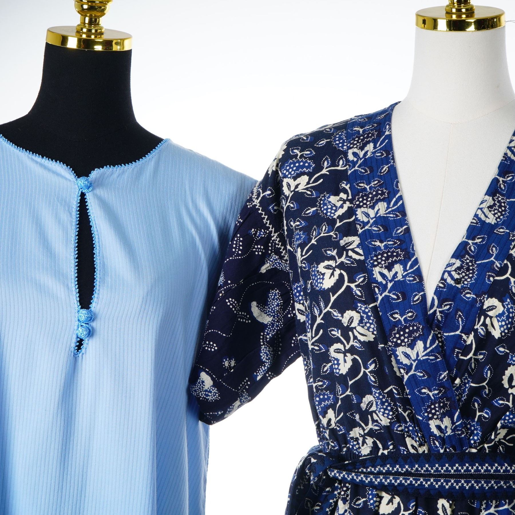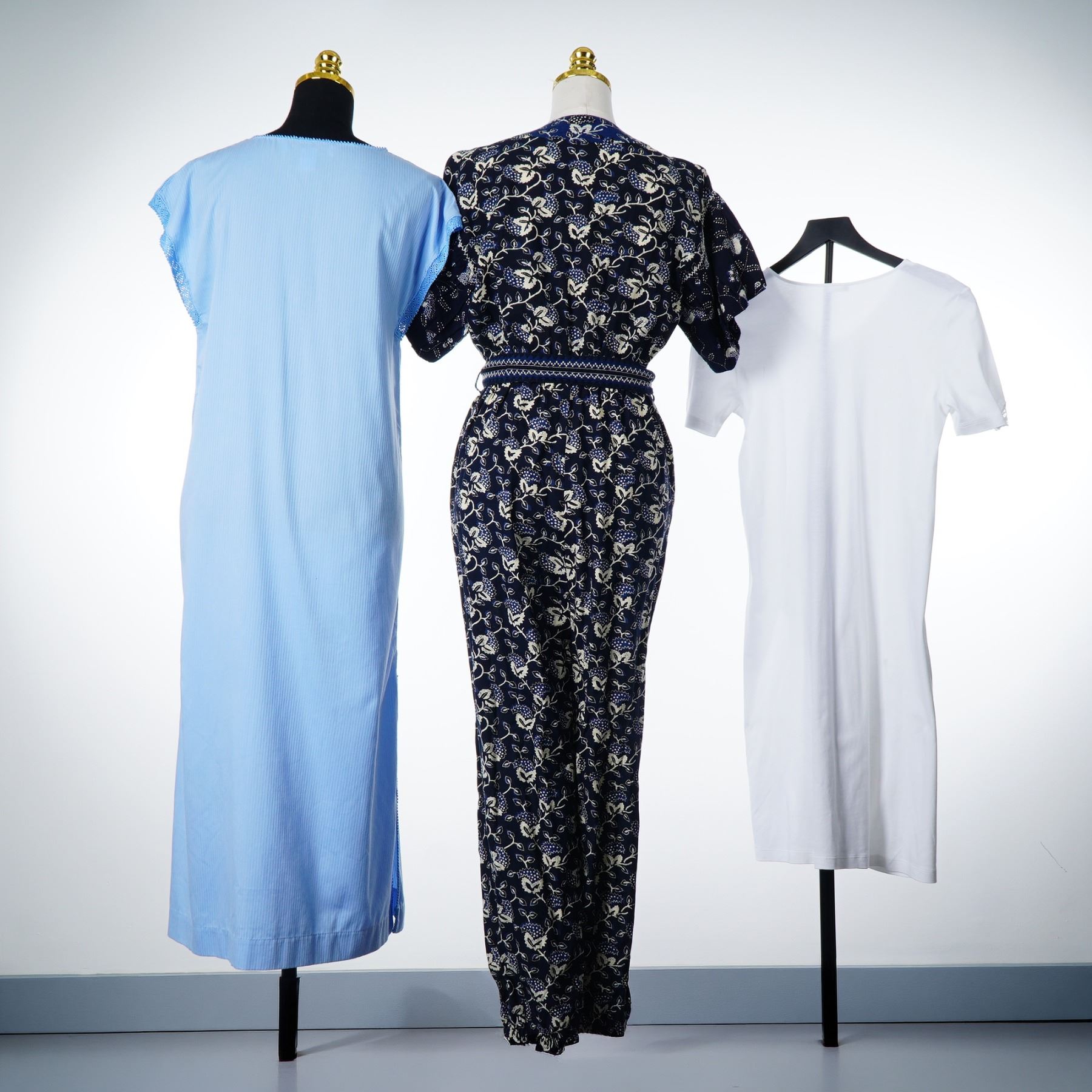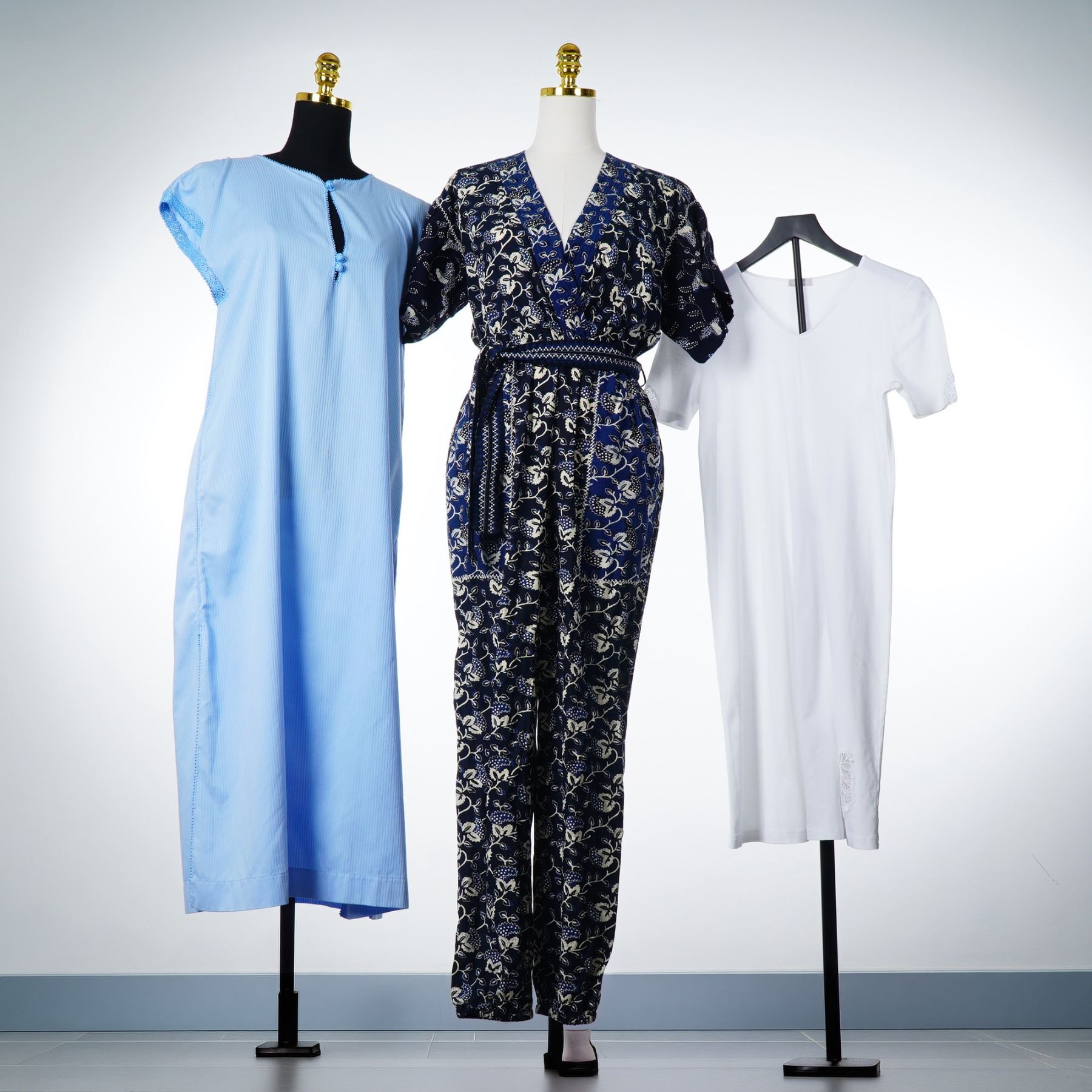 This collection consists of three designer pieces: a vintage kaftan-style dress by Fernando Sanchez, a floral jumpsuit by Ulla Johnson, and a jersey t-shirt dress by Hanro. The Fernando Sanchez garment is a light blue, long, cap-sleeved kaftan constructed from 100 percent cotton. It features a keyhole neckline secured by three knotted frog closures, decorative open-work trim at the collar and sleeves, and a side slit at the hem. The interior white woven label is marked Fernando Sanchez with a red horizontal line and includes a secondary tag stating the item was made in Morocco. The Ulla Johnson jumpsuit is a navy blue V-neck piece with short sleeves and an all-over botanical floral print in white and light blue. It includes a matching self-tie belt at the waist and bears a white fabric label marked Ulla Johnson. The Hanro garment is a white, short-sleeved jersey knit t-shirt dress with a deep V-neckline, featuring a translucent label marked Hanro.