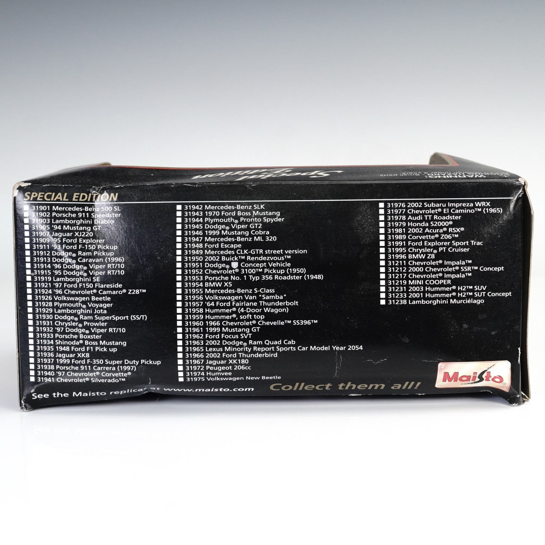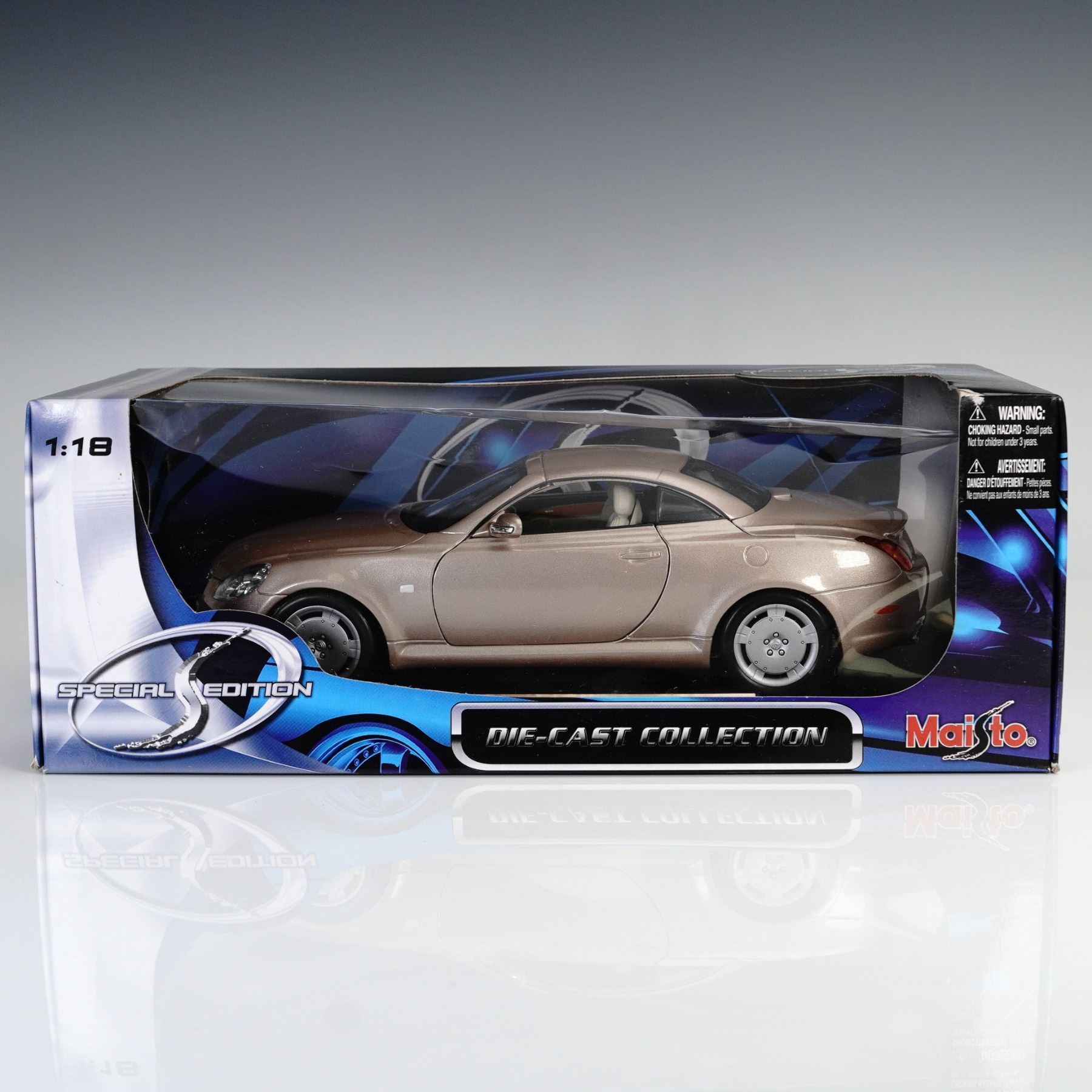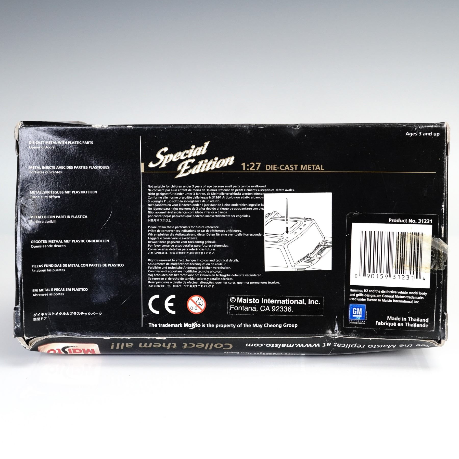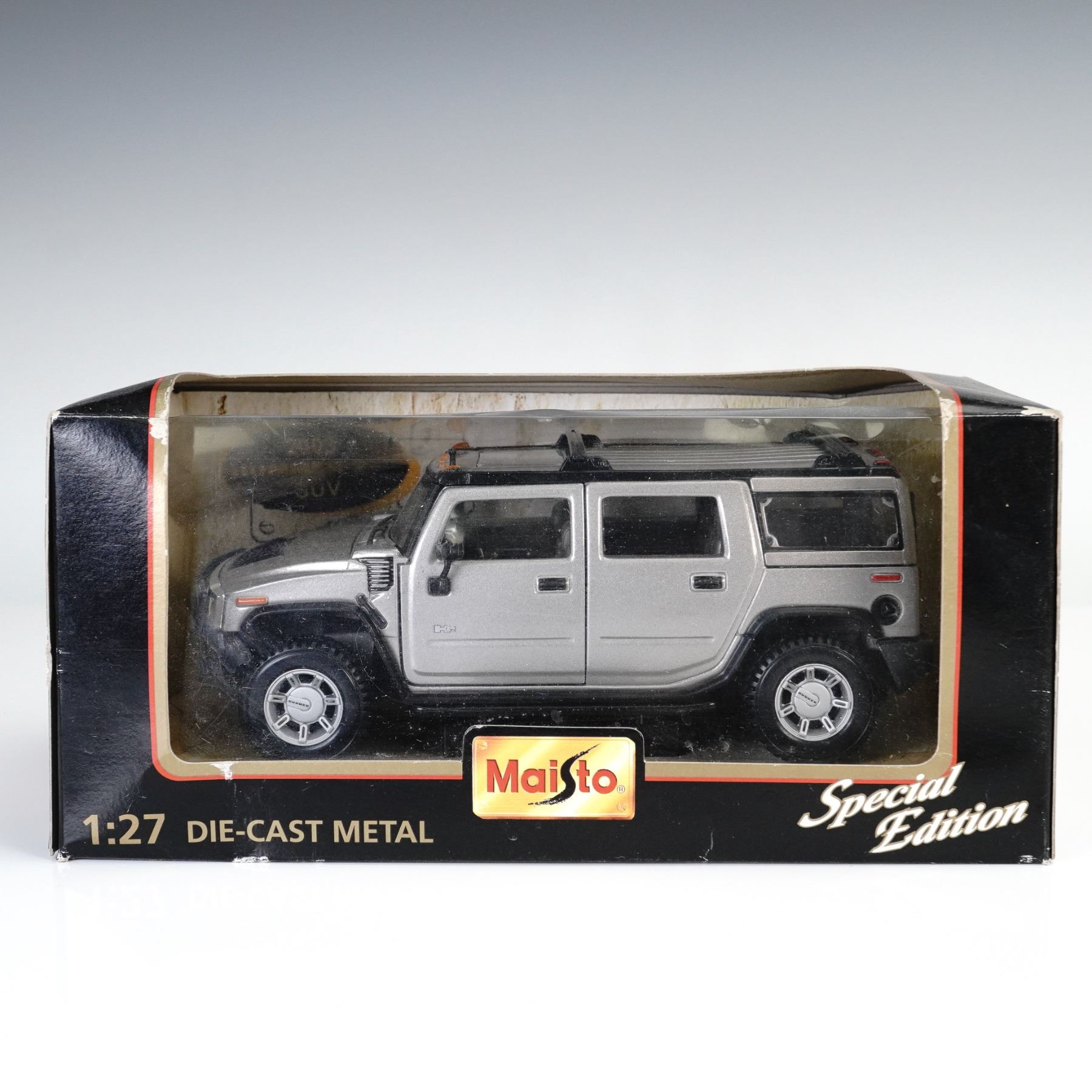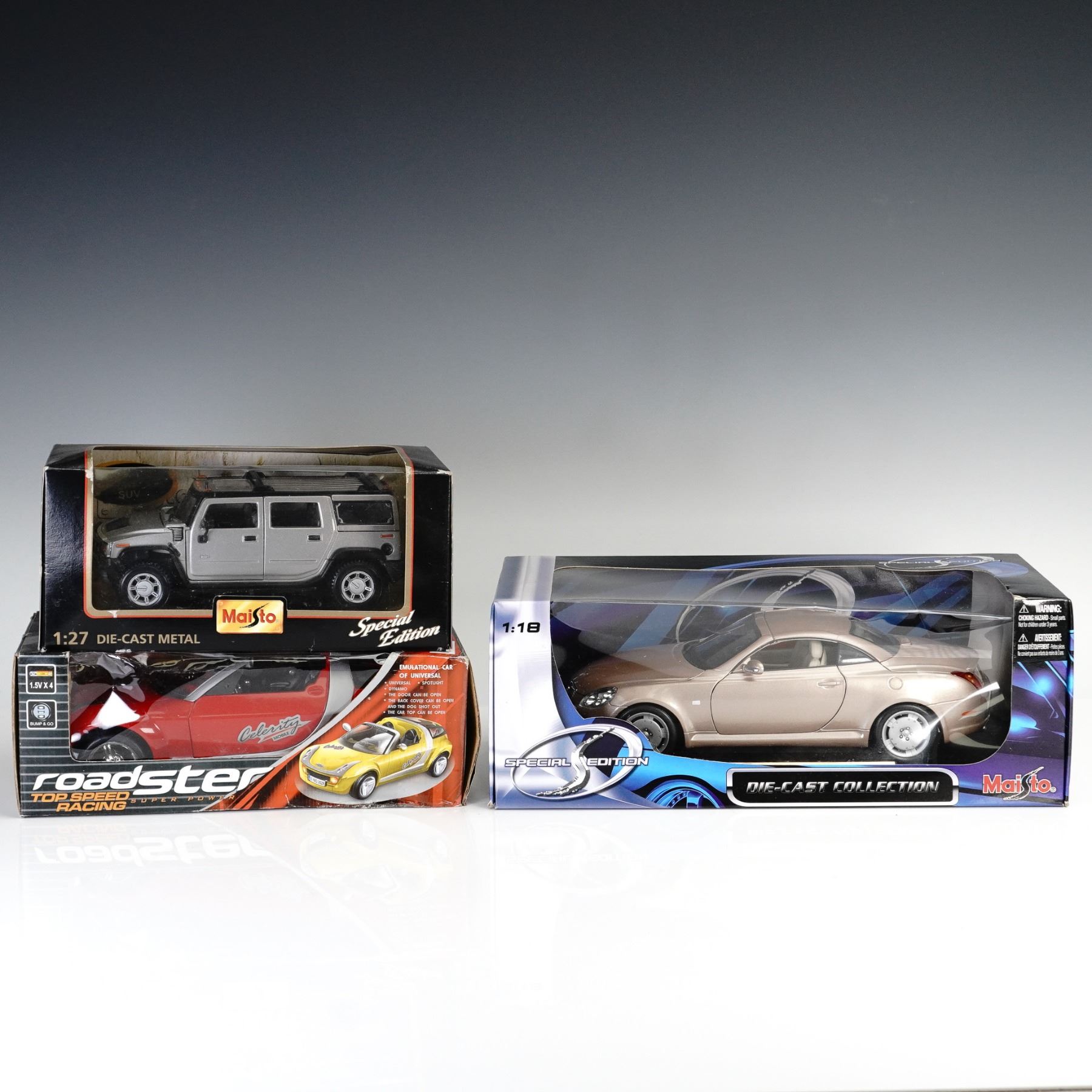 Group of three boxed diecast model vehicles including a 1:27 scale Maisto Special Edition Hummer H2 in silver, a 1:18 scale Maisto Die-Cast Collection convertible coupe in champagne gold, and a battery-operated 1:14 scale Roadster Top Speed Racing Celebrity Mobile in red with bump and go action. Each model is packaged in its original window display box, showcasing design features such as opening doors, realistic detailing, and manufacturer logos. Produced by Maisto International and other manufacturers under May Cheong Group, these pieces offer both collectible appeal and display quality. This item has its original box.
