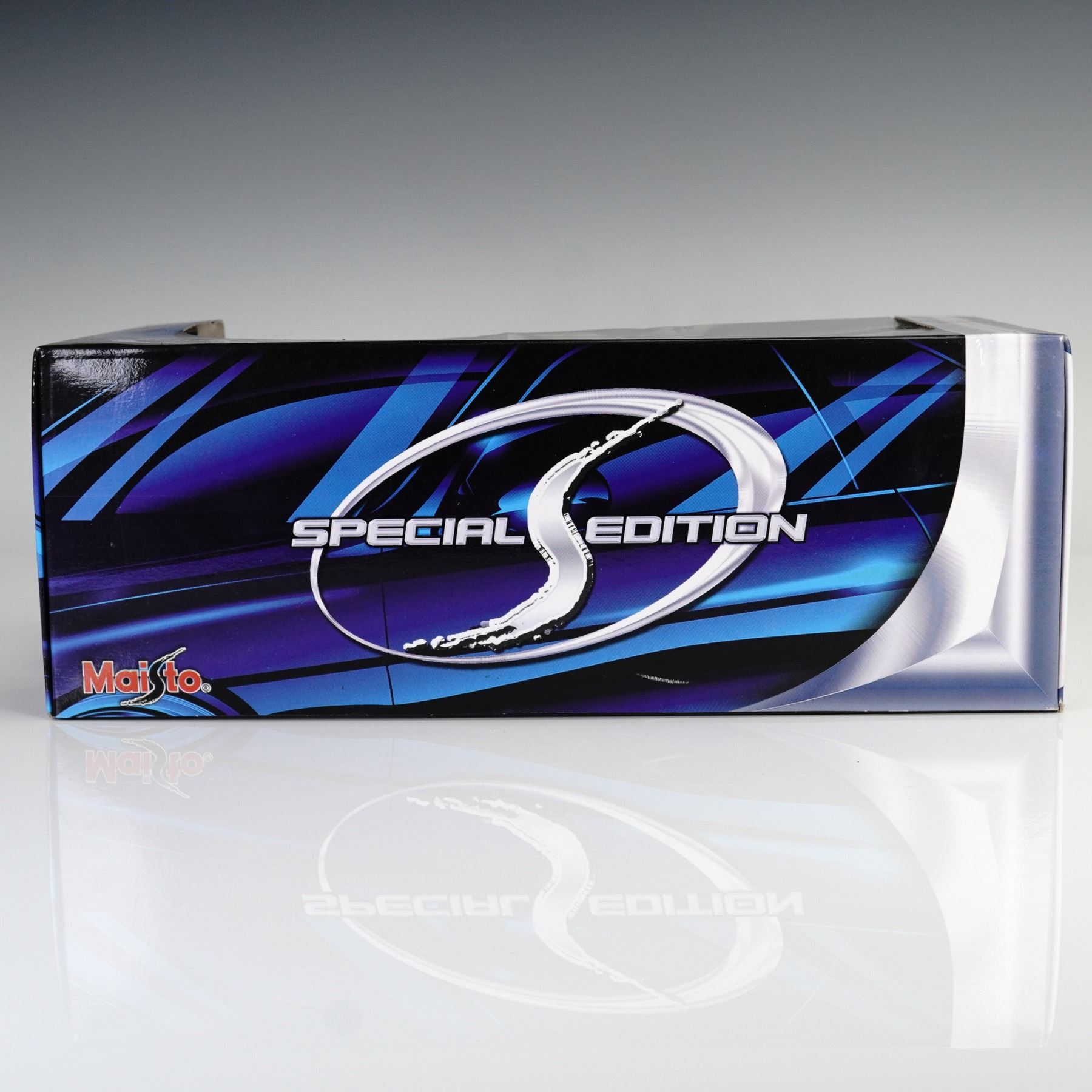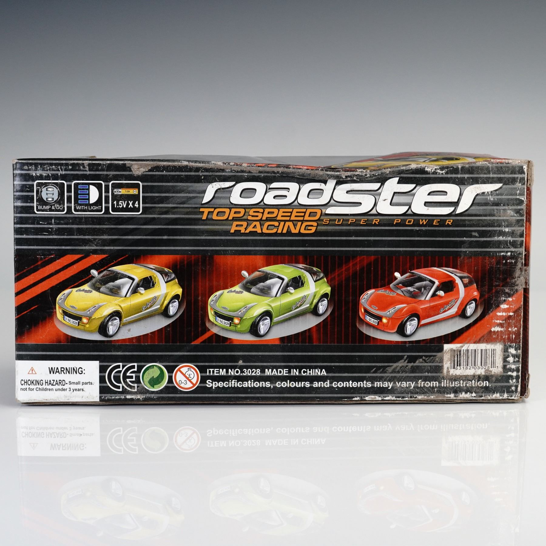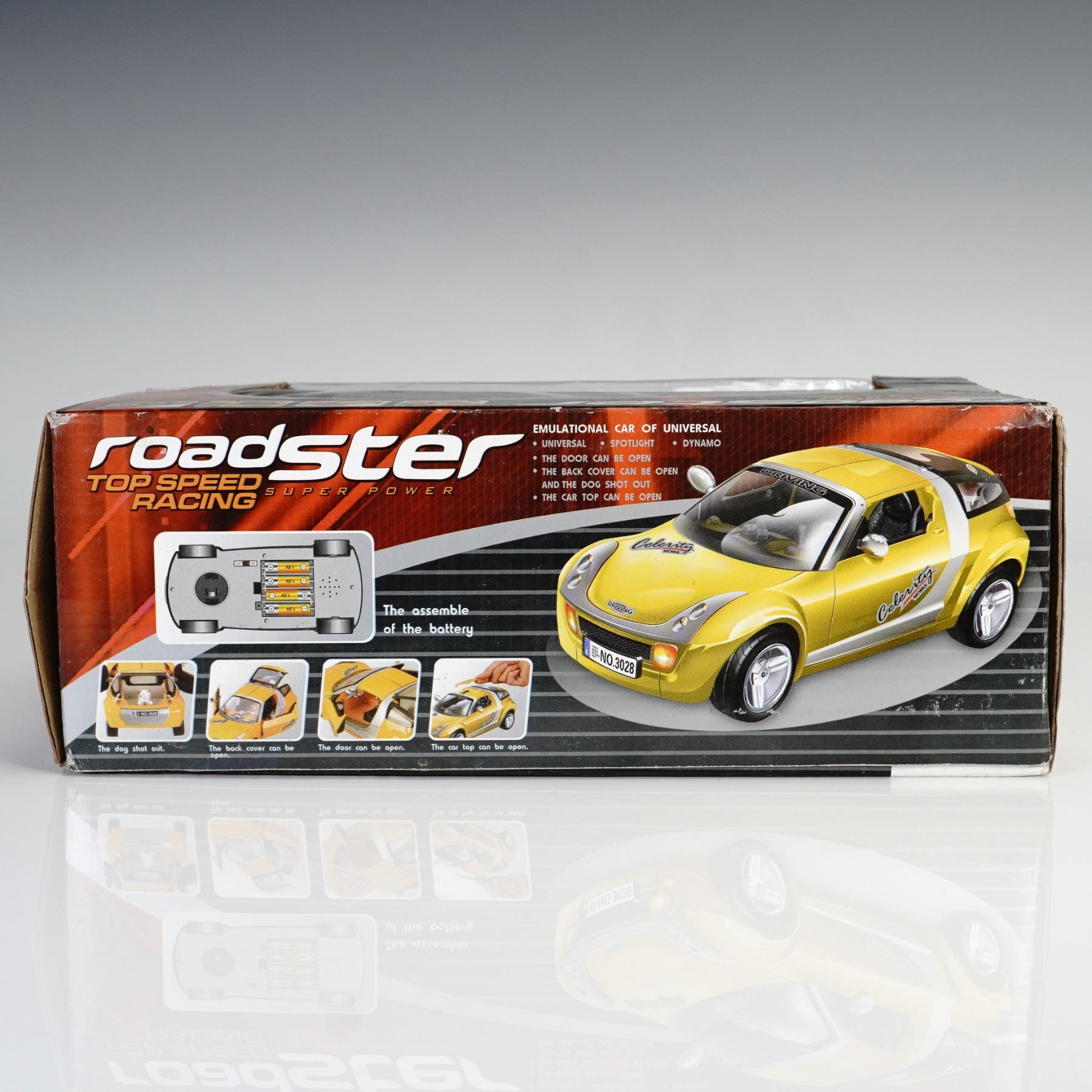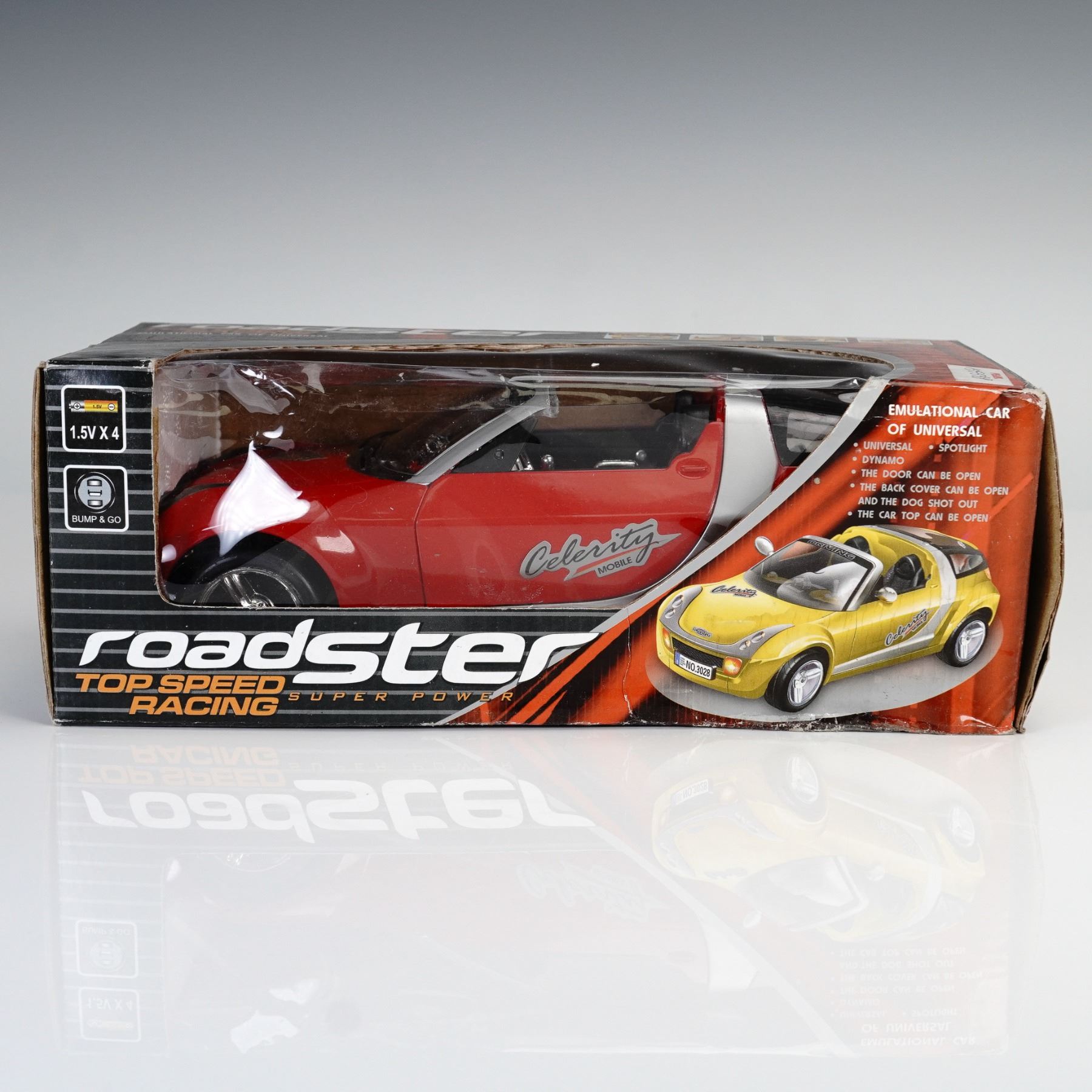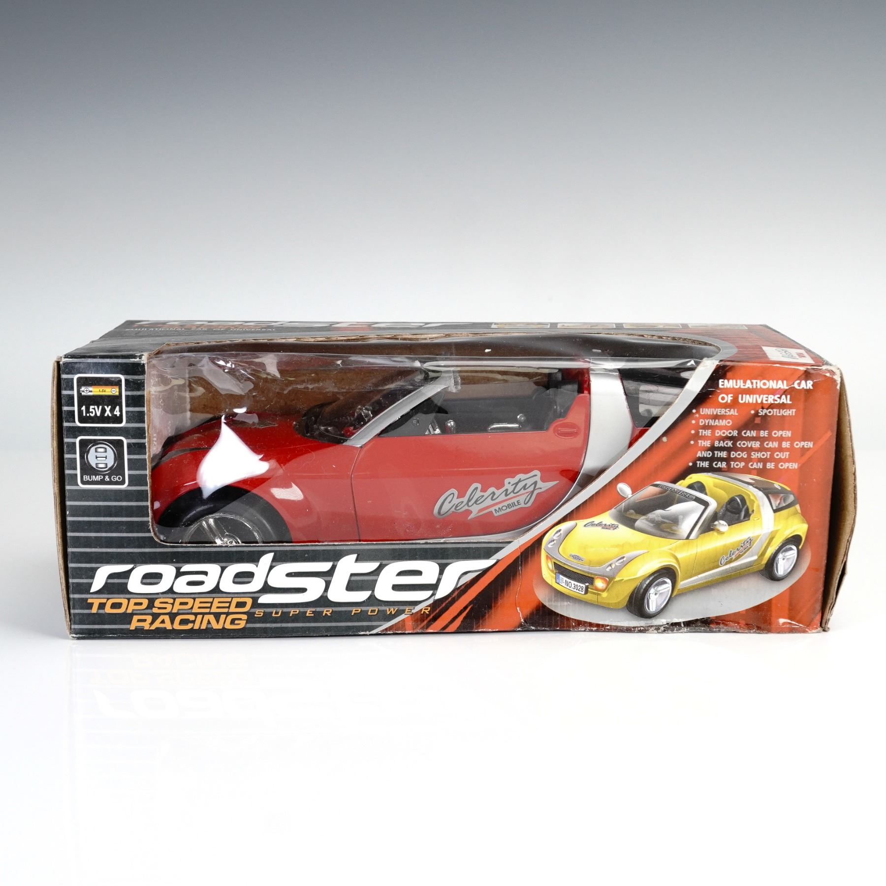 Group of three boxed diecast model vehicles including a 1:27 scale Maisto Special Edition Hummer H2 in silver, a 1:18 scale Maisto Die-Cast Collection convertible coupe in champagne gold, and a battery-operated 1:14 scale Roadster Top Speed Racing Celebrity Mobile in red with bump and go action. Each model is packaged in its original window display box, showcasing design features such as opening doors, realistic detailing, and manufacturer logos. Produced by Maisto International and other manufacturers under May Cheong Group, these pieces offer both collectible appeal and display quality. This item has its original box.
