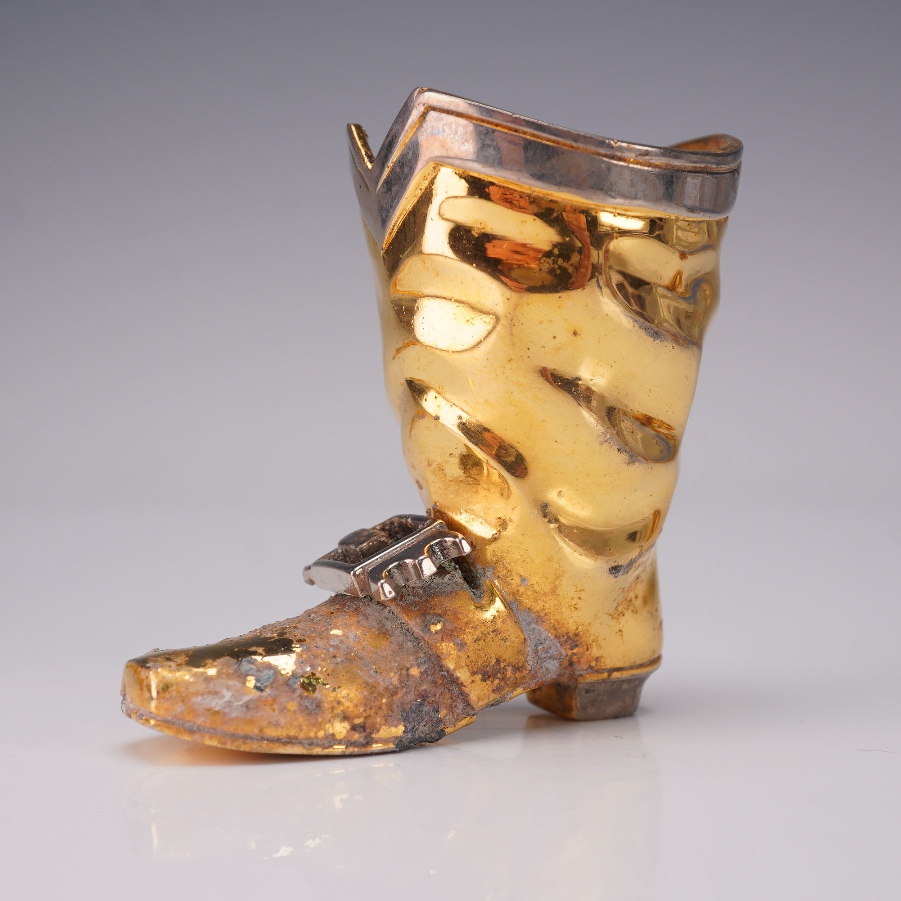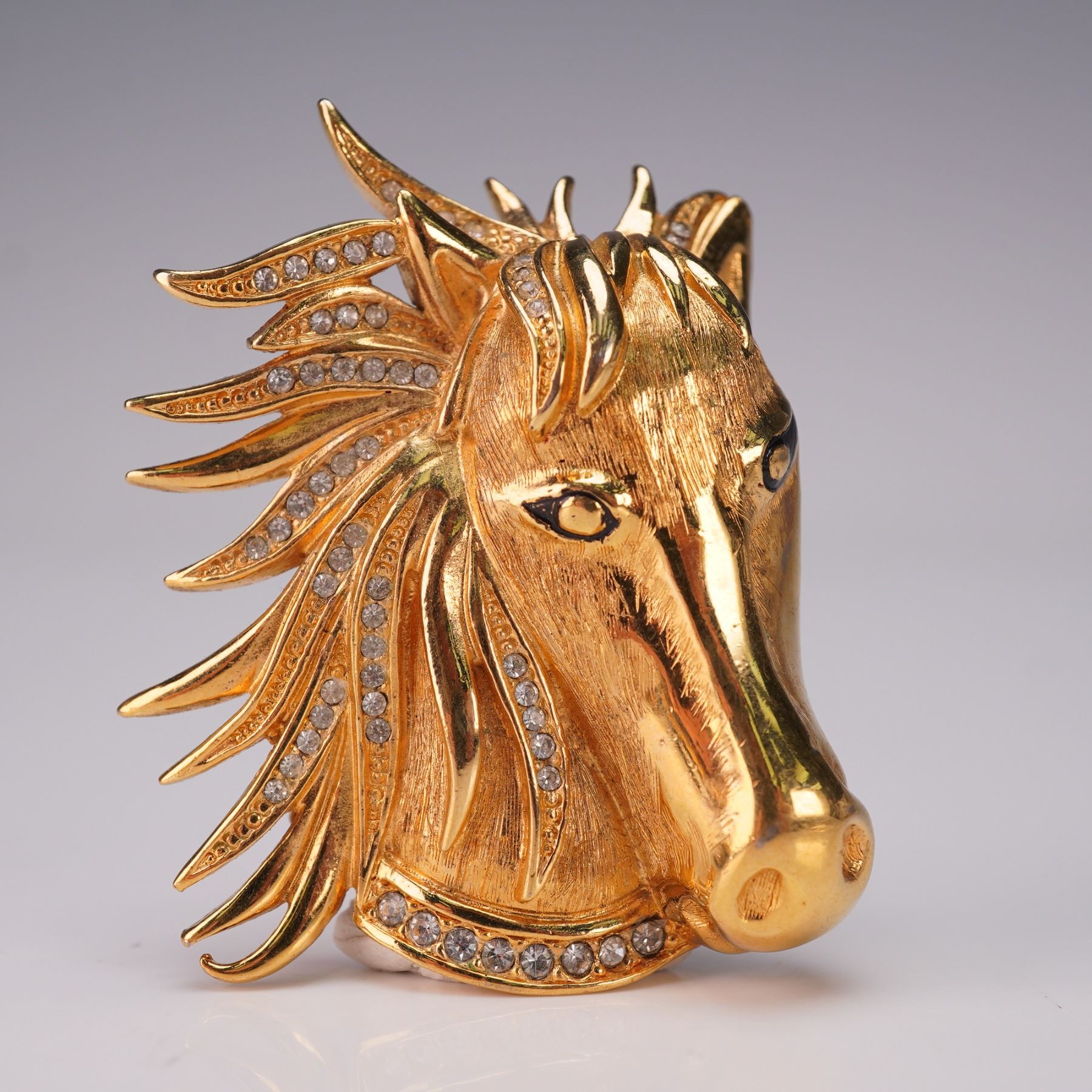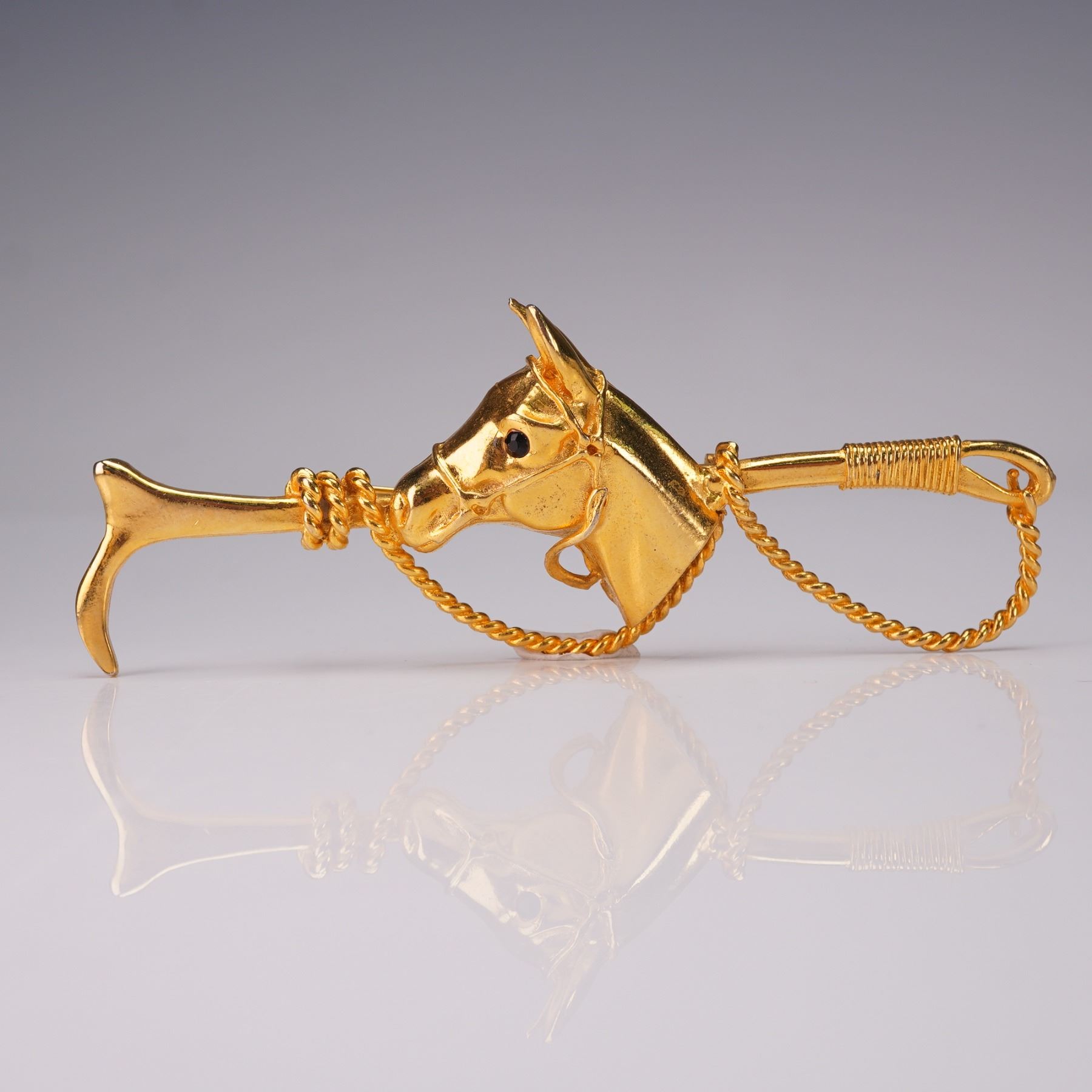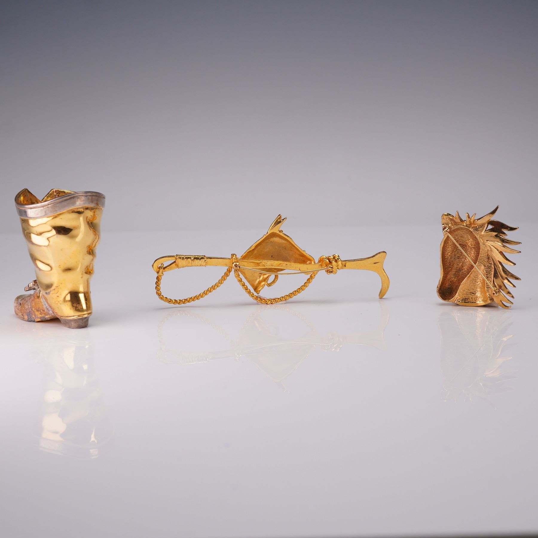 Trio of equestrian themed decorative and wearable pieces. Includes a small goldtone boot ashtray with silver accents and spur detail, showing patina from age and use. Accompanying it is a figural brooch styled as a horse head with riding crop and rope motif, finished in bright goldtone metal with black rhinestone eyes. Completing the group is a dramatic horse head brooch with flowing rhinestone-set mane and collar, capturing bold movement and sparkle. Together, these pieces celebrate equestrian flair in both functional object and costume jewelry form.