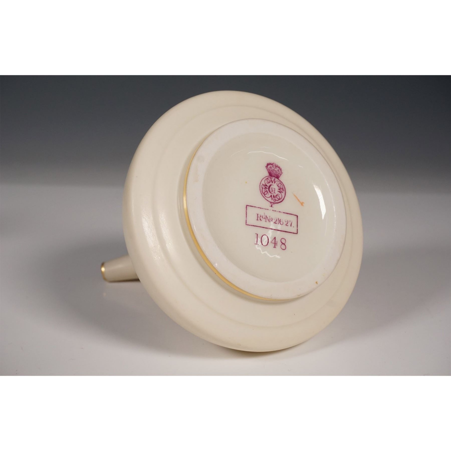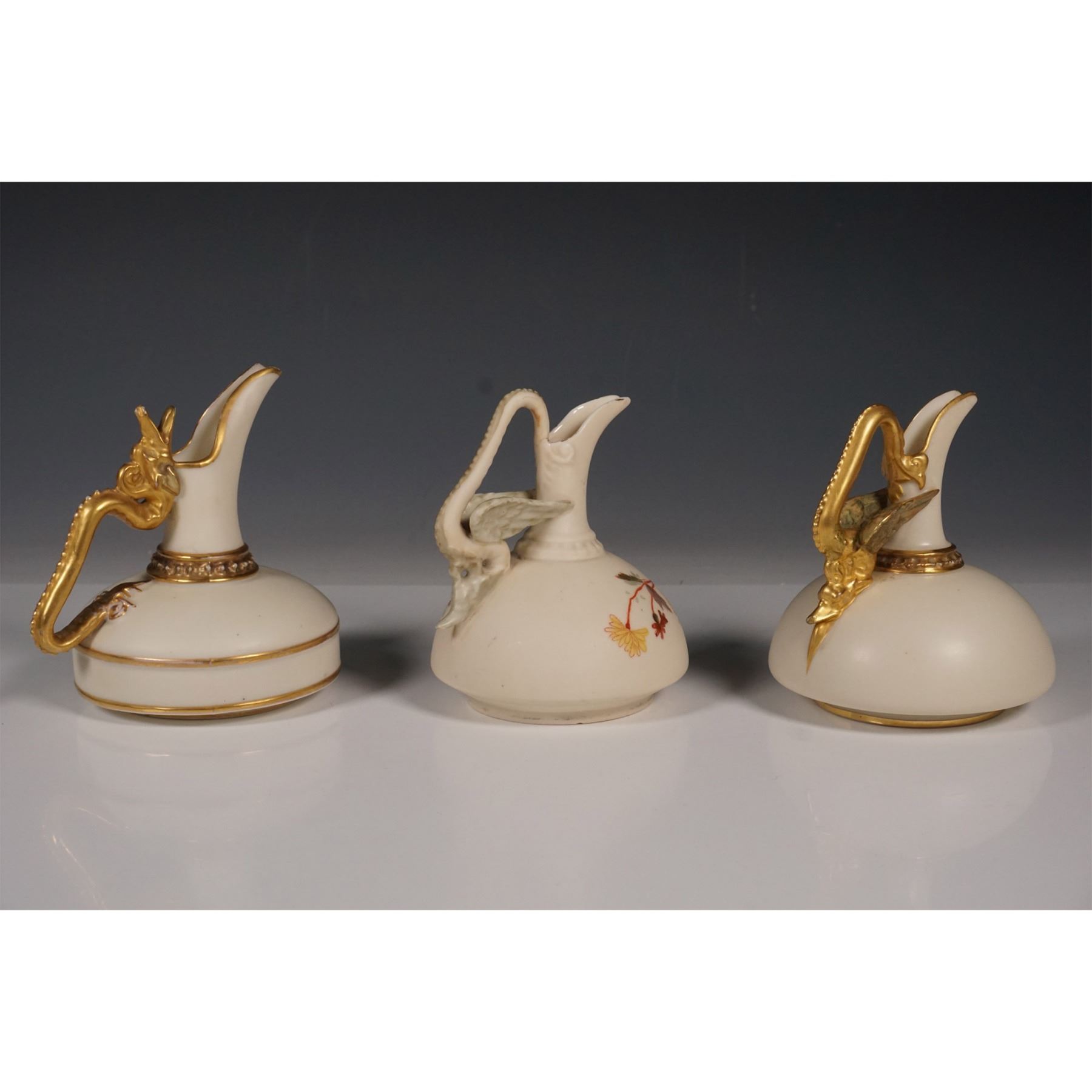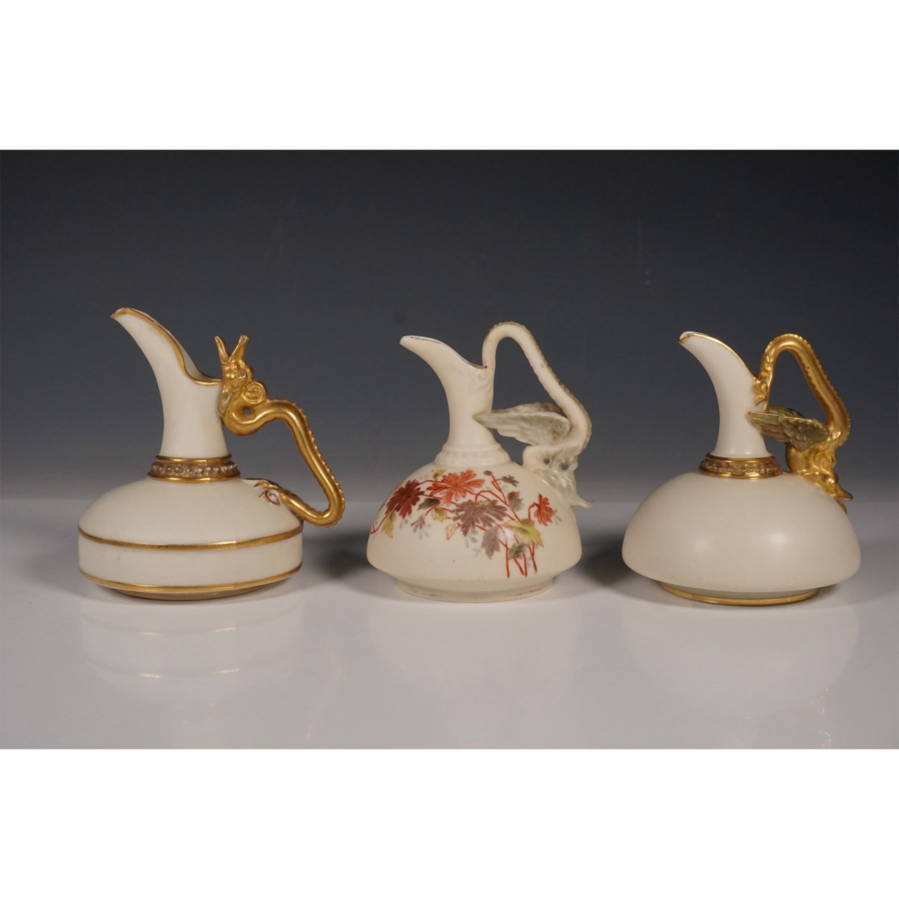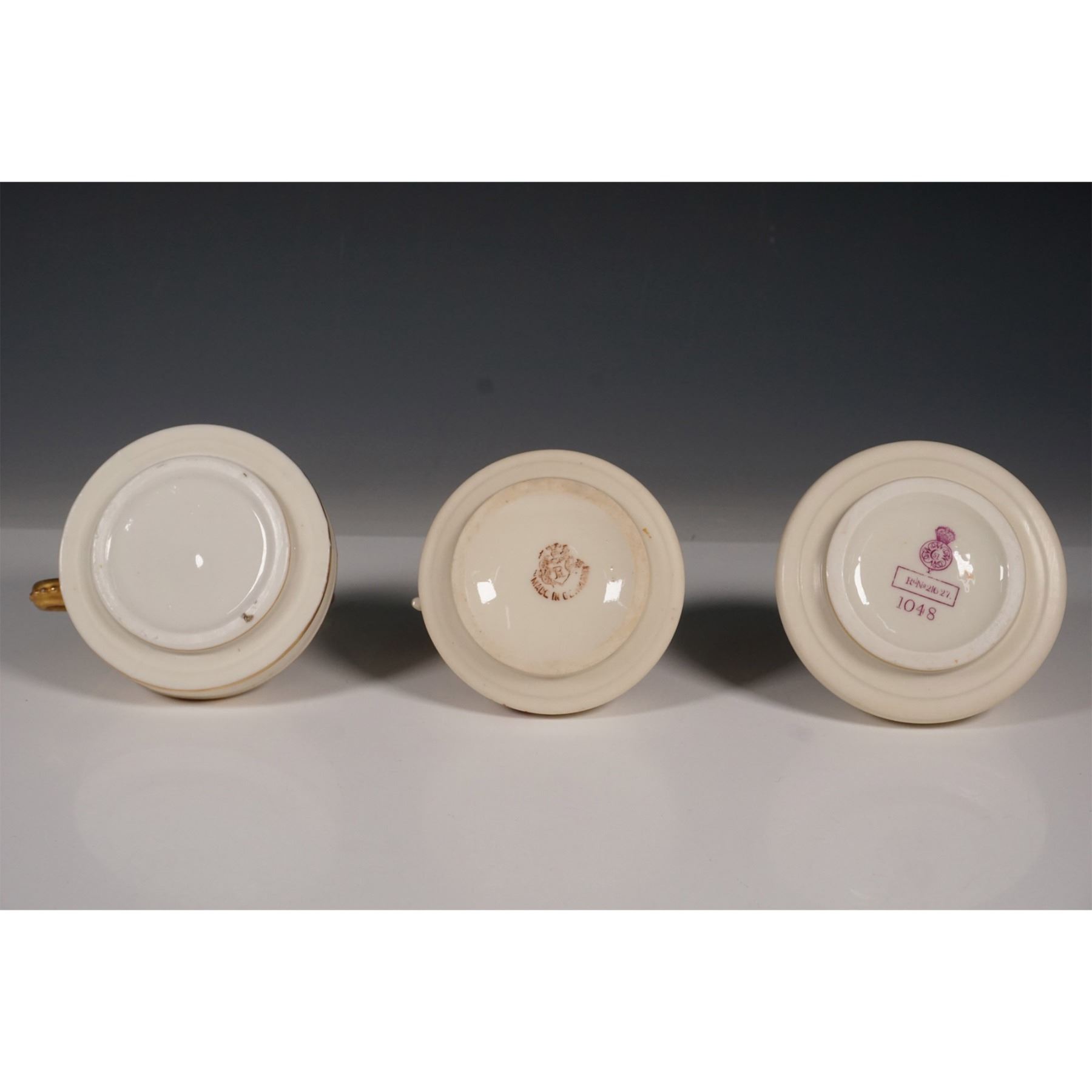 A charming set of three creamers, two featuring gilded handles and one featuring a delicate floral design. One of the creamers is marked with the Royal Worcester backstamp, while another bears an R mark and Made in Germany on the underside, showcasing European porcelain craftsmanship. The third creamer is unmarked.
