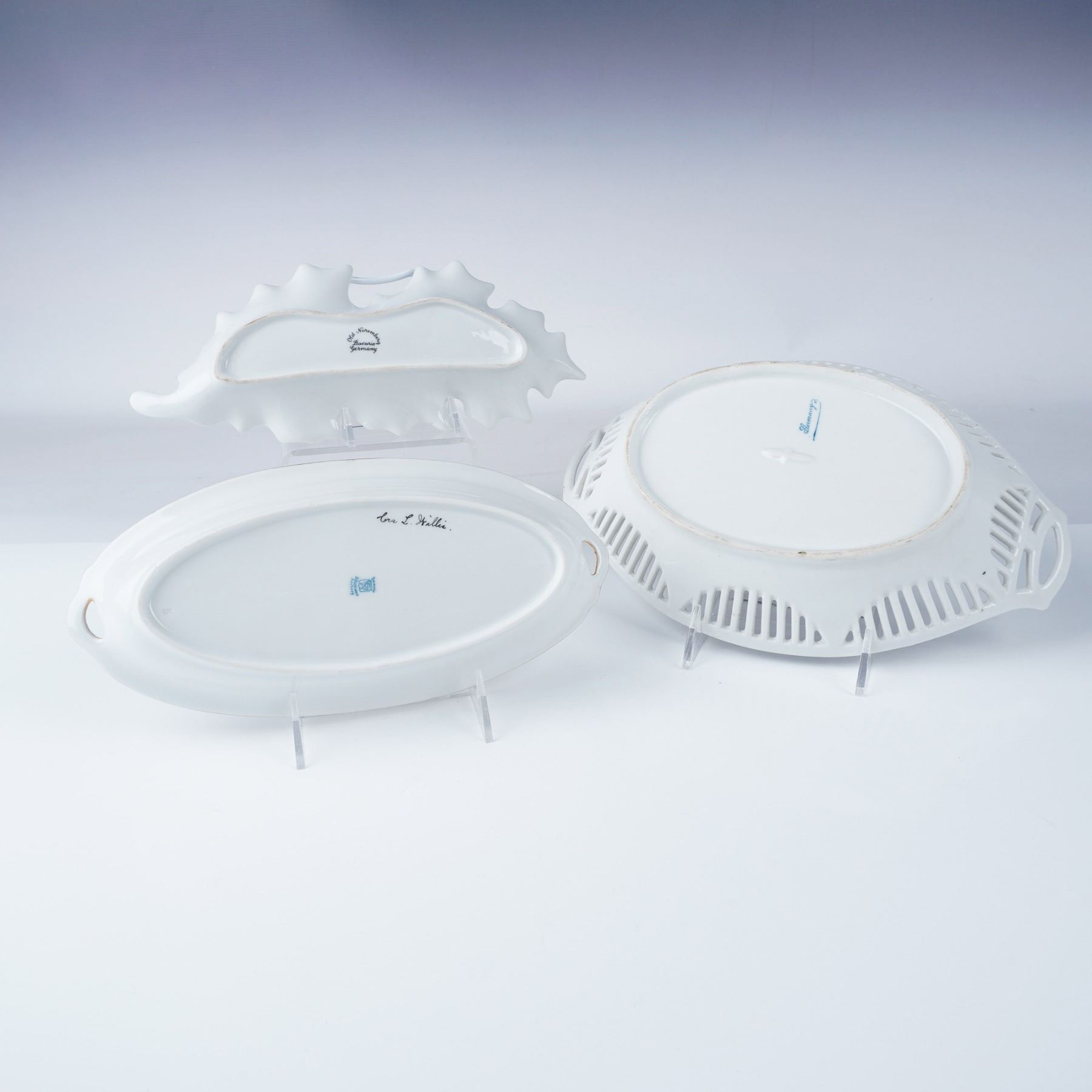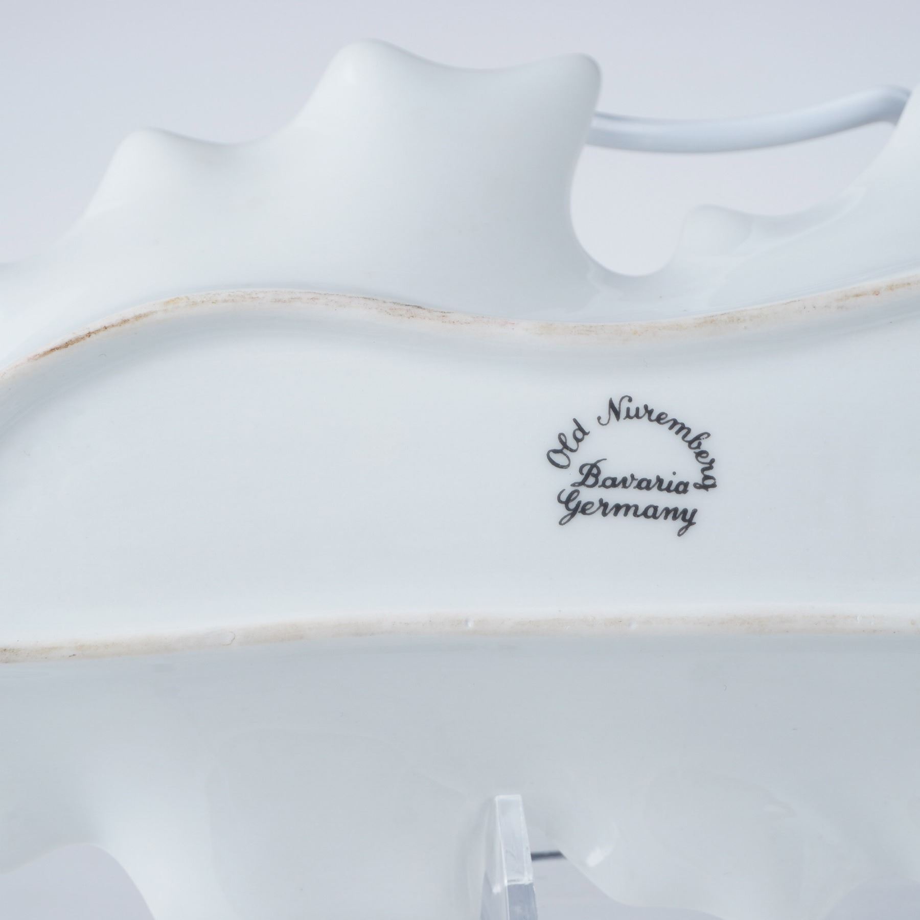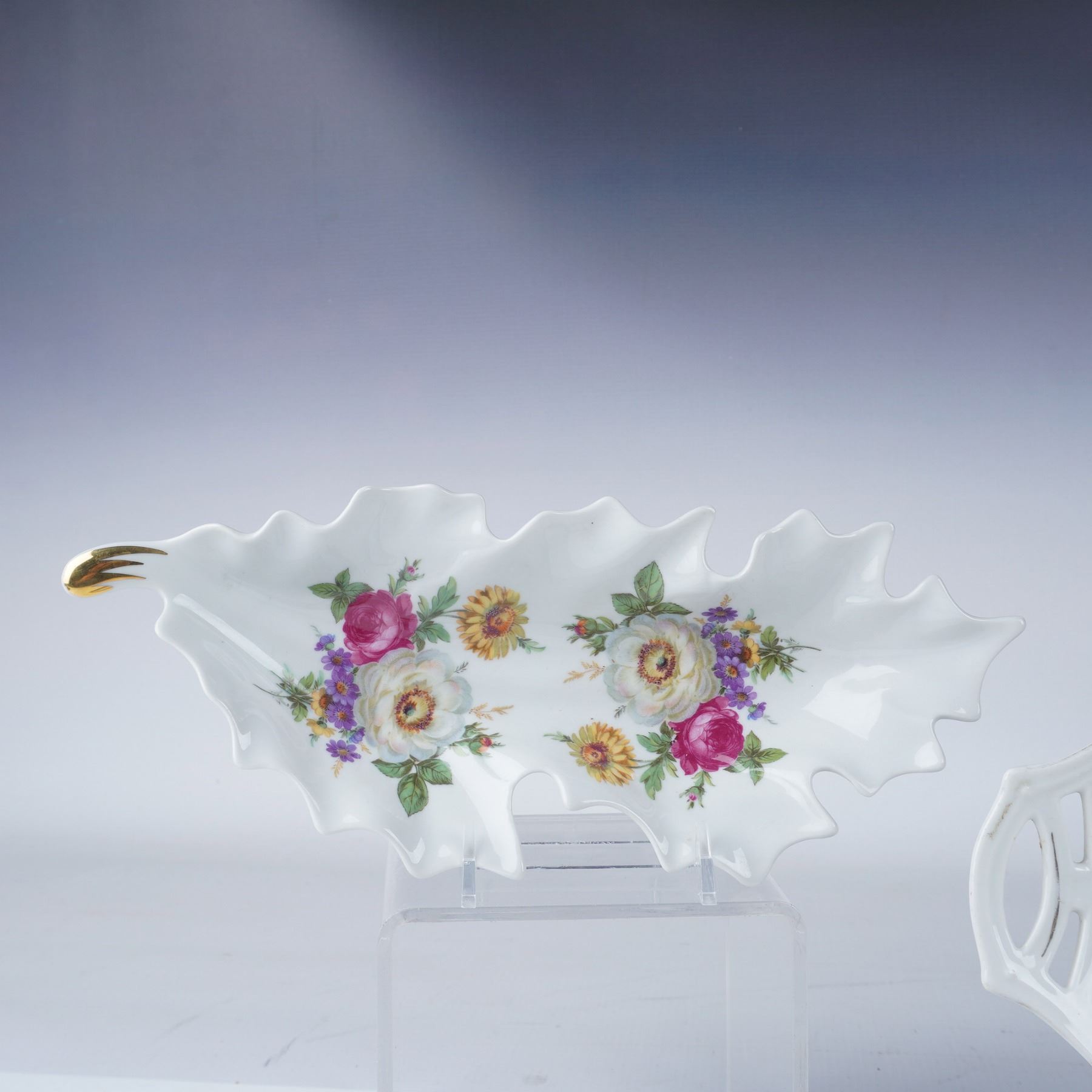 This lot includes three vintage German china serving bowls. The largest pierced oval serving bowl, marked Germany, measures 12.25"L x 8"W and features a floral motif. The medium-sized oval serving dish is marked Schumann Arzberg Bavaria and displays a gold-trimmed floral design. The leaf-shaped bowl, marked Old Nuremberg Bavaria Germany, is adorned with vibrant floral patterns.