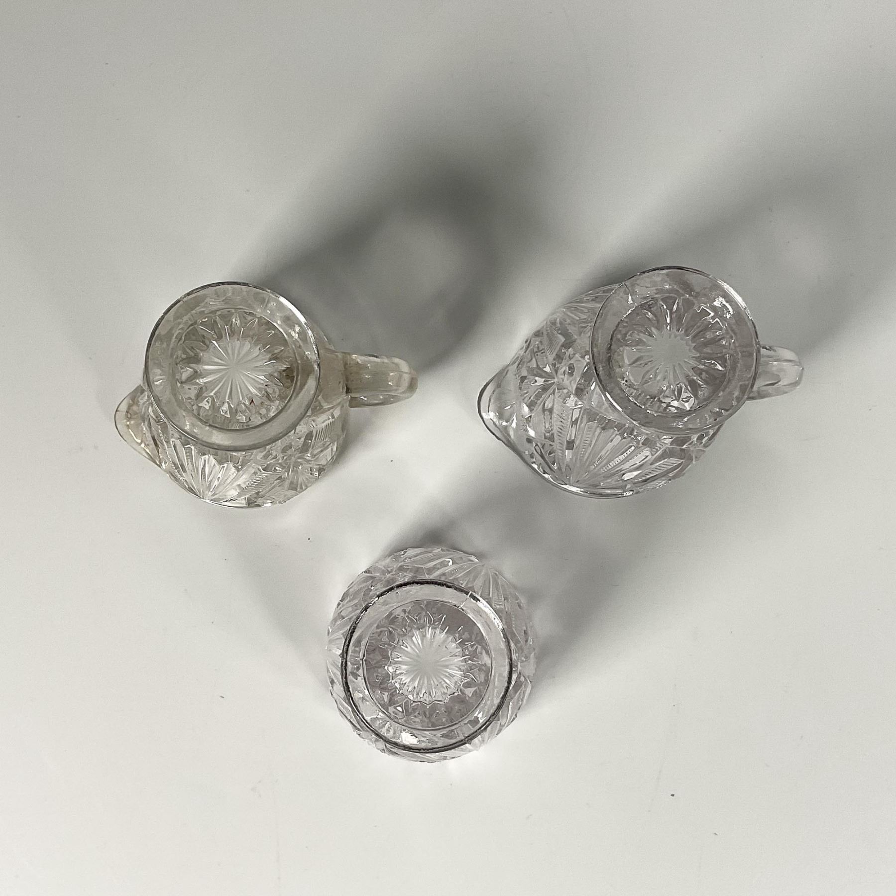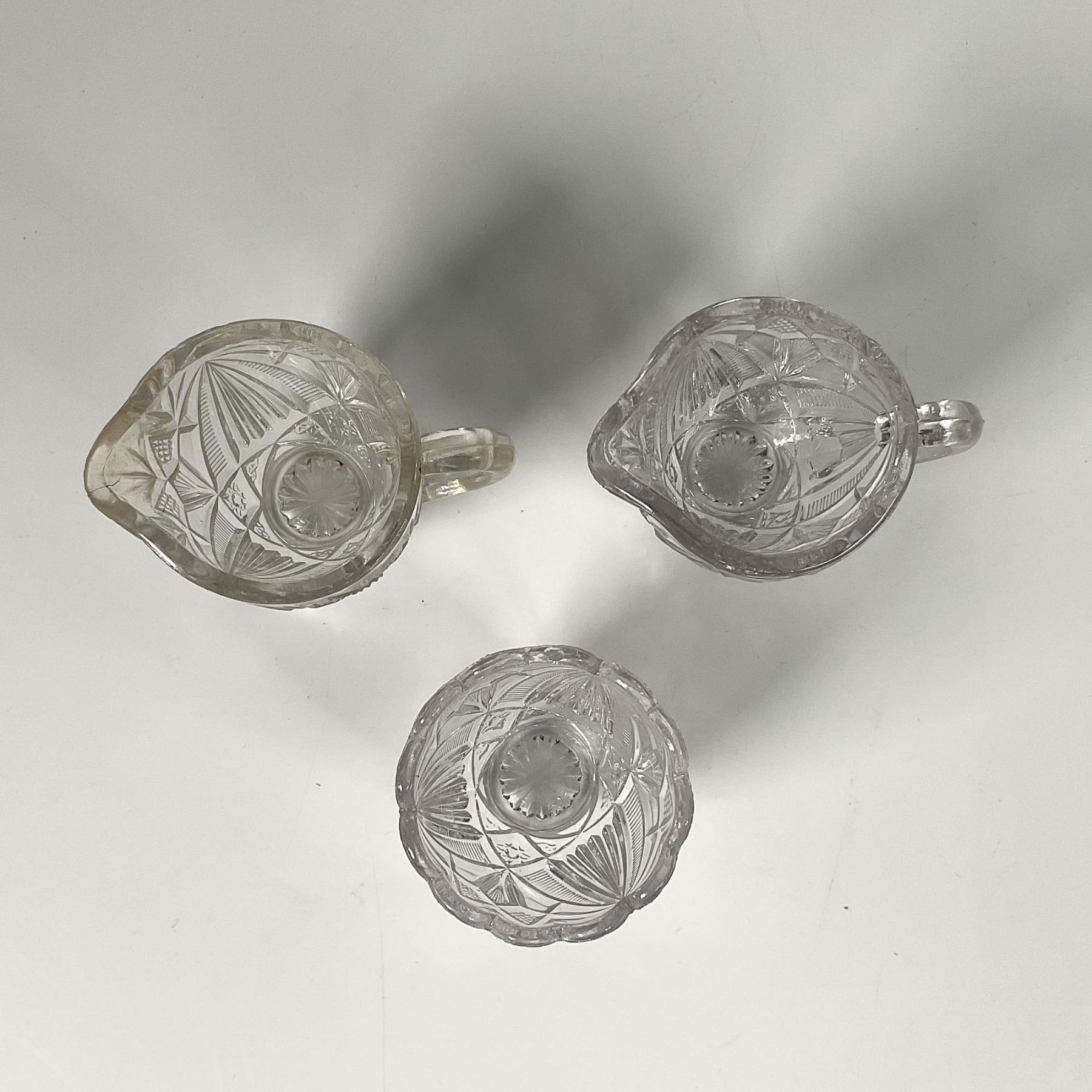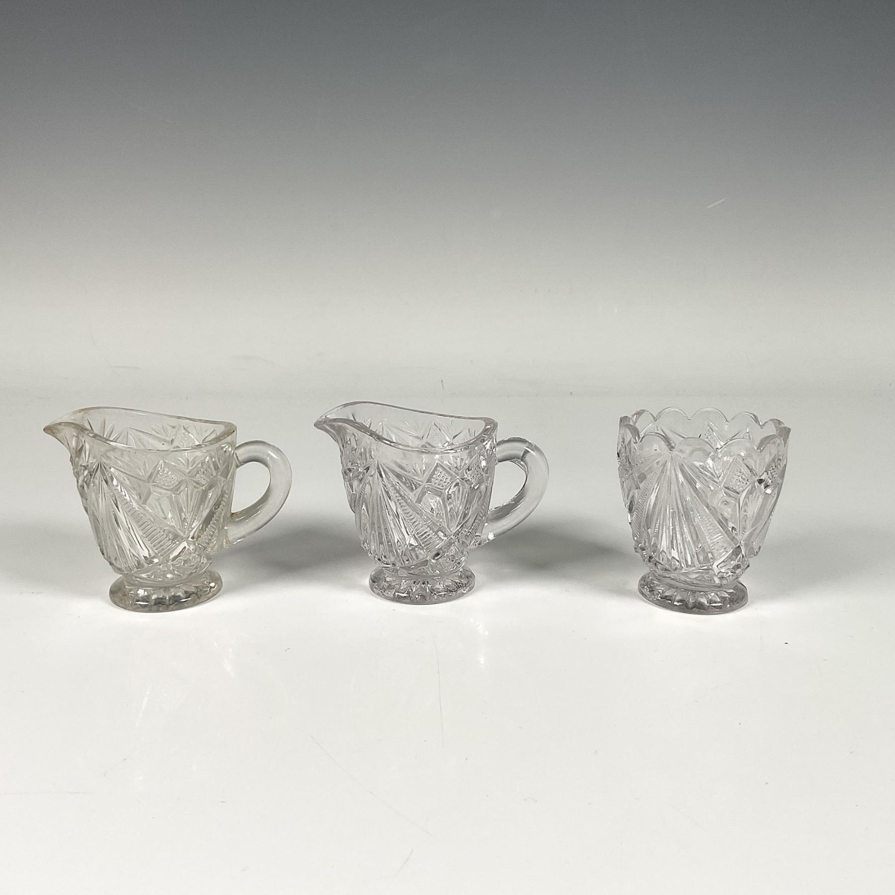 Two glass creamers and a child spooner in fancy cut style. Creamer: 3"L x 2"W x 2.5"H. Spooner: 2"W x 2.5"H.
