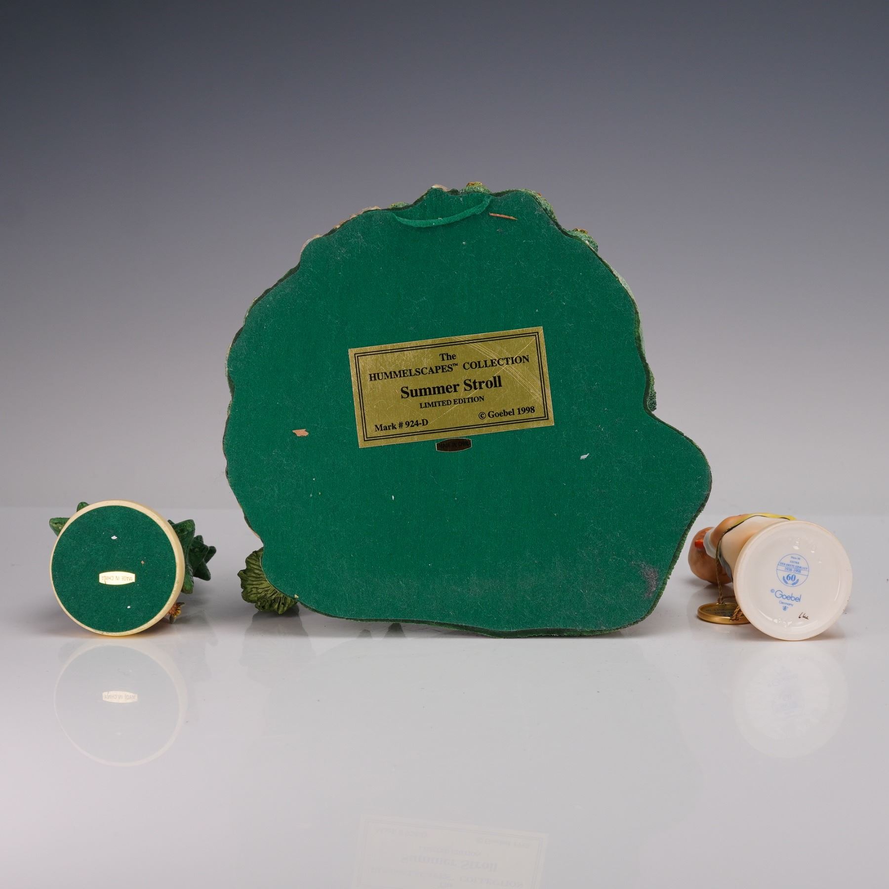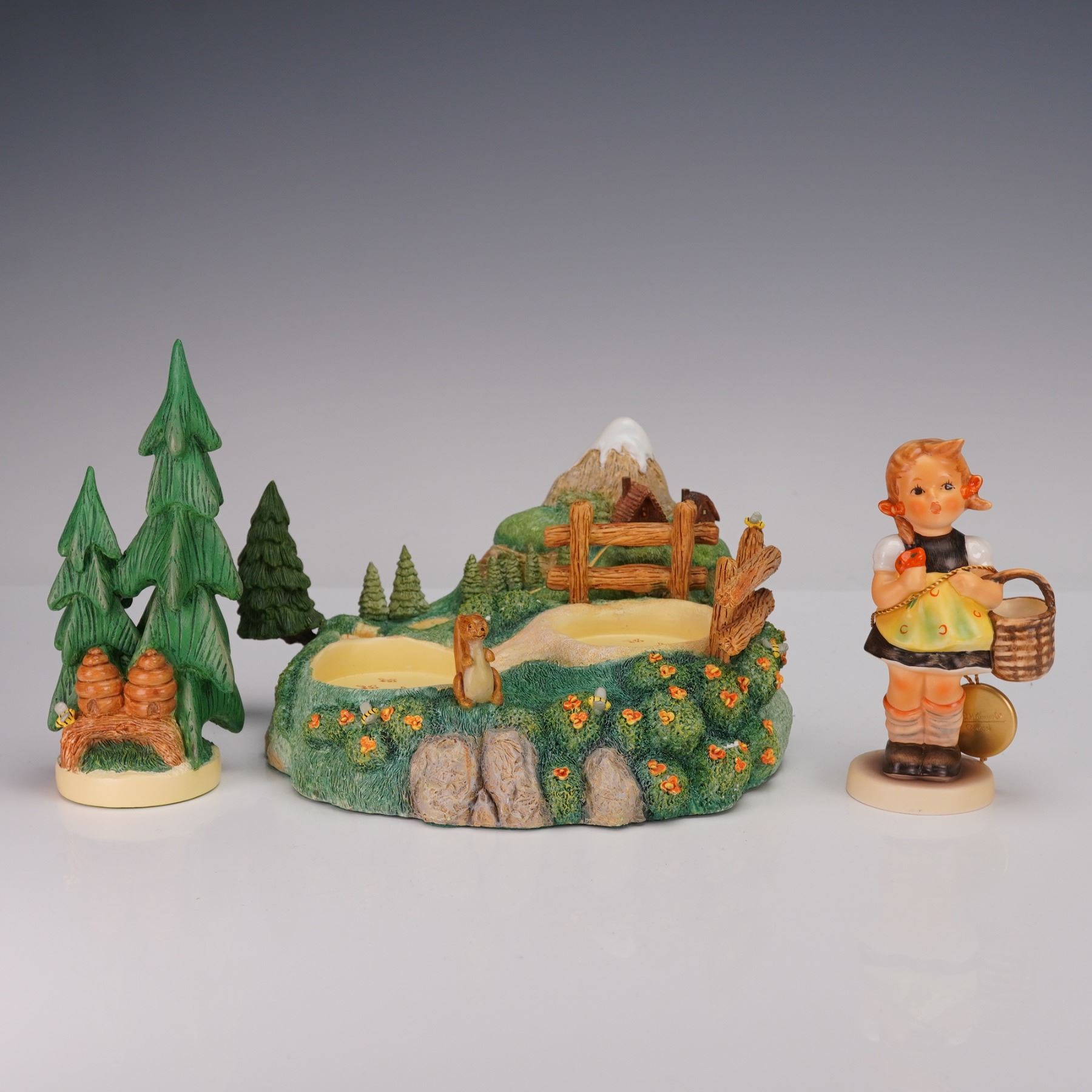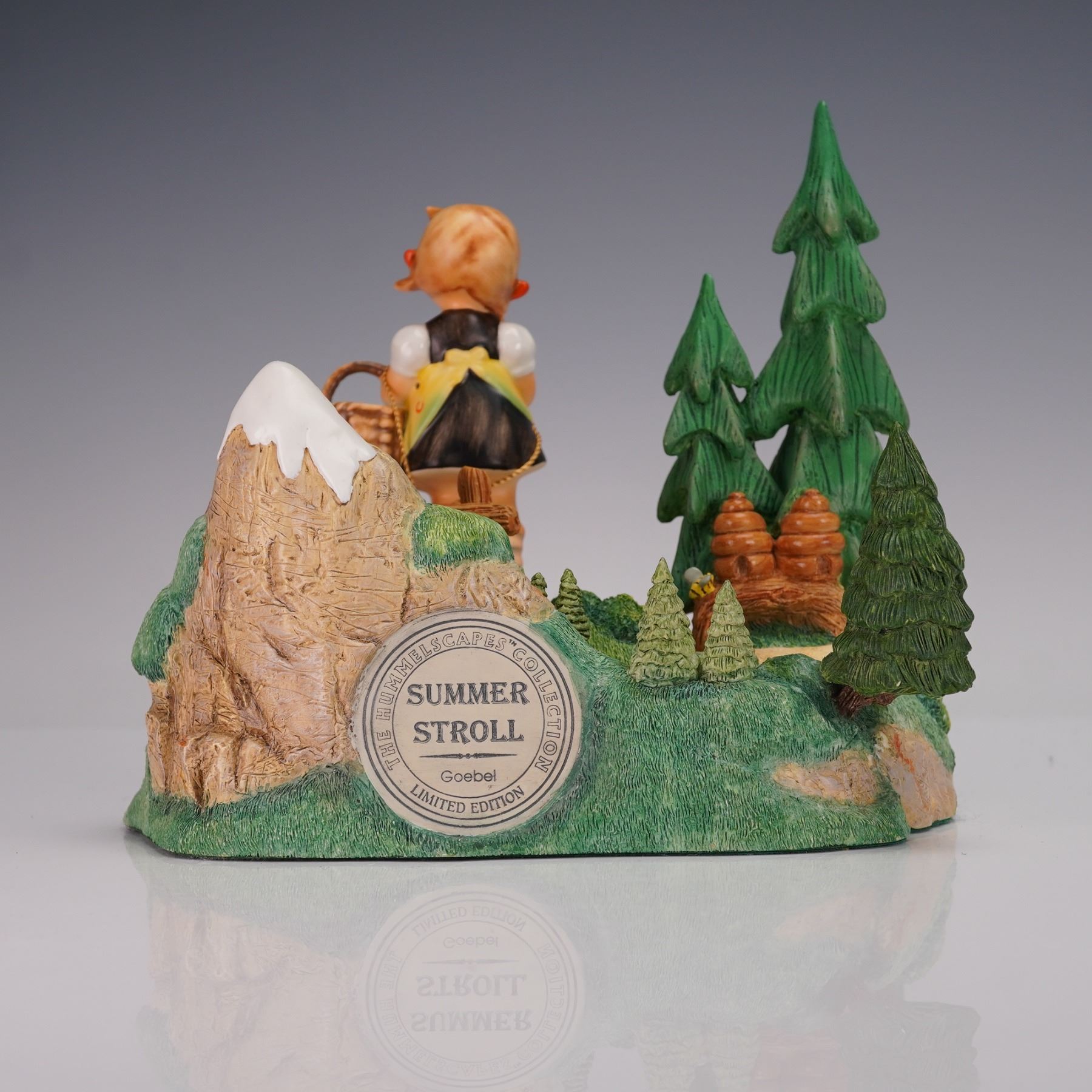 The set includes a hand-painted porcelain figure of a young girl with braids holding a basket, a scenic base adorned with flowers, trees, a fence, and a small animal, as well as an additional grouping of pine trees and beehives. Issued as a limited edition, Summer Stroll is marked on the underside with the Goebel trademark. This charming display unites classic Hummel character design with a detailed natural landscape setting. Sister (98): 2.5"L x 2"W x 4.75"H.  Summer stroll tree: 2.5"L x 2.25"W x 5.75"H. Summer Stroll base (948-D) : 7.75"L x 8"W x 4.25"H.