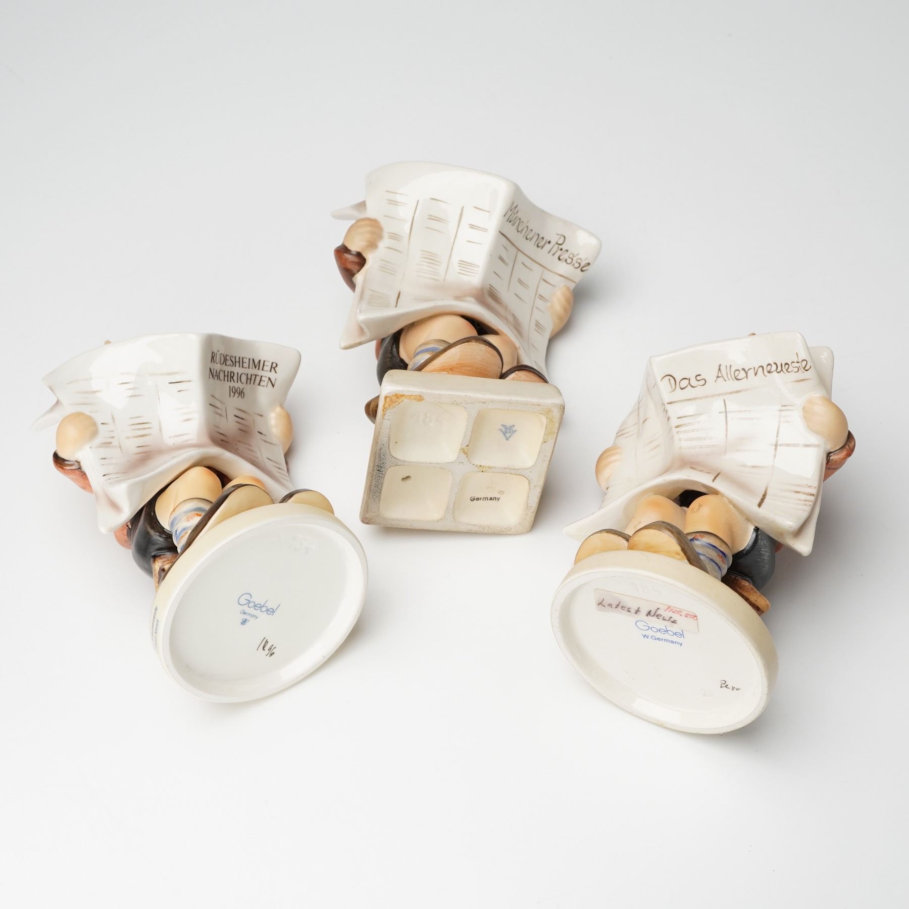 Group of three Goebel Hummel porcelain figurines, each depicting a young boy reading a newspaper. The newspapers bear various German titles including Rüdesheimer Nachrichten, Wiesbadener Presse, and Das Allerneueste. Each figure is finely hand-painted with typical Hummel features and marked Goebel Germany beneath, with one dated 1996.