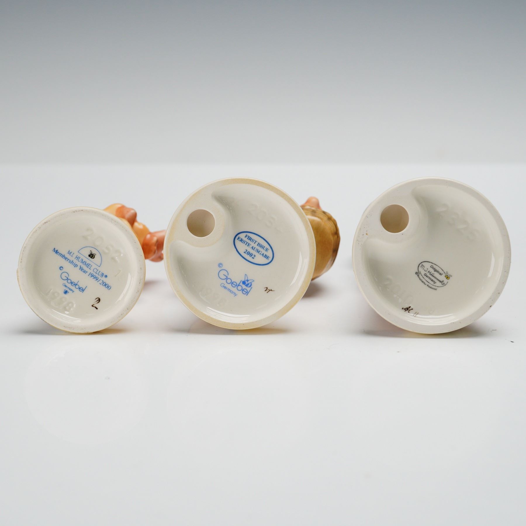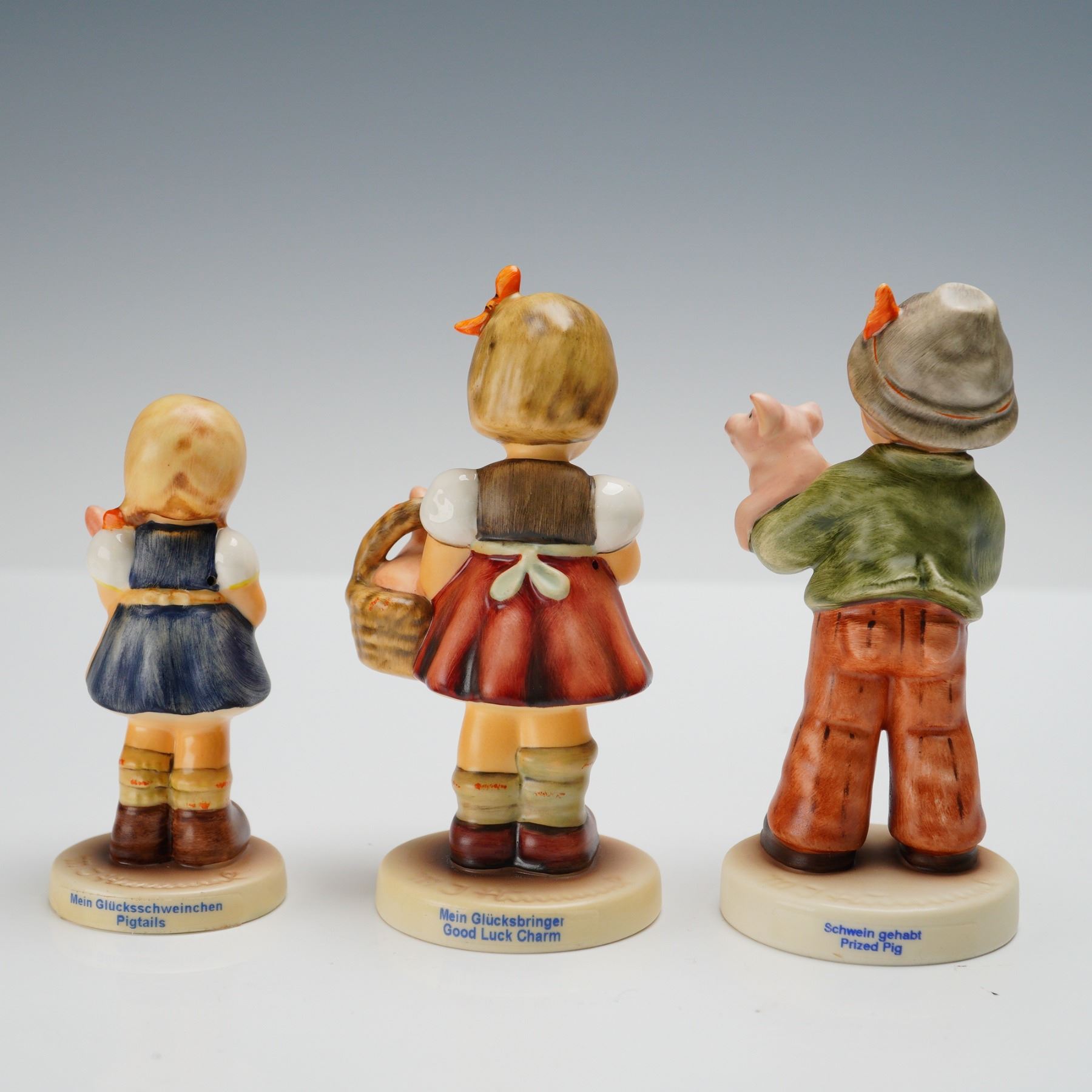 Charming set of three Goebel Hummel porcelain figurines, each depicting children tenderly holding their piglets. The grouping includes Prized Pig (2325), a boy proudly presenting his pig, Good Luck Charm (2034), a girl carrying a small piglet in her arms, and Pigtails (2052), a girl with braids holding a basket with her pig inside. Each figurine is finely hand-painted in traditional Hummel detail and marked with Goebel backstamps on the base.