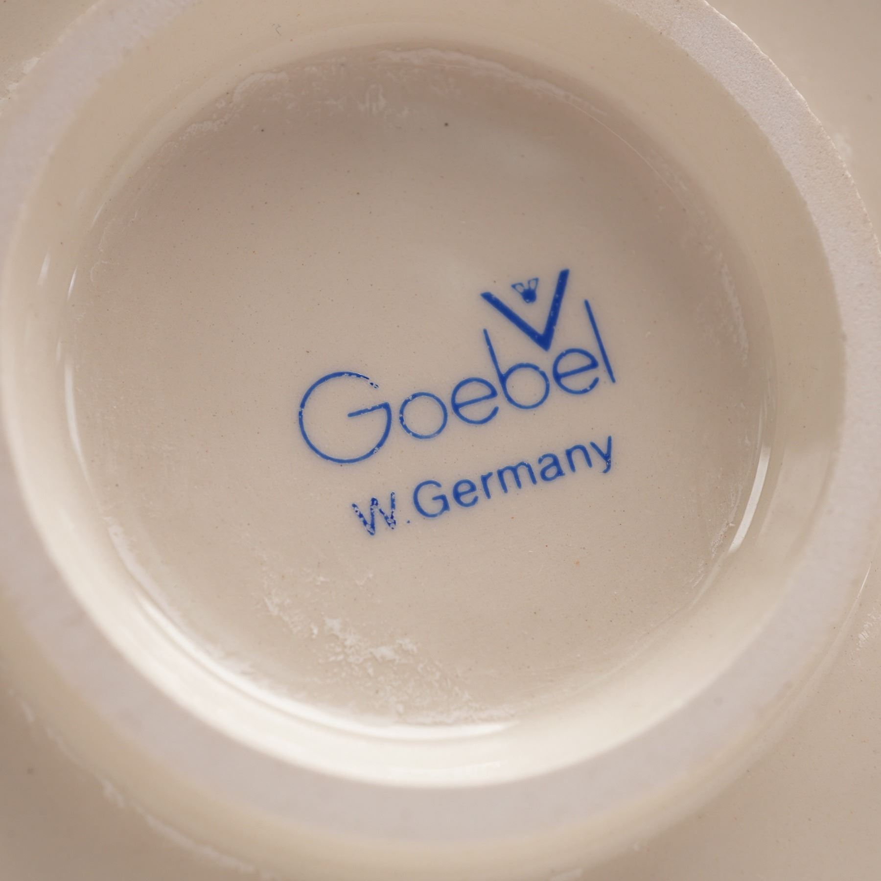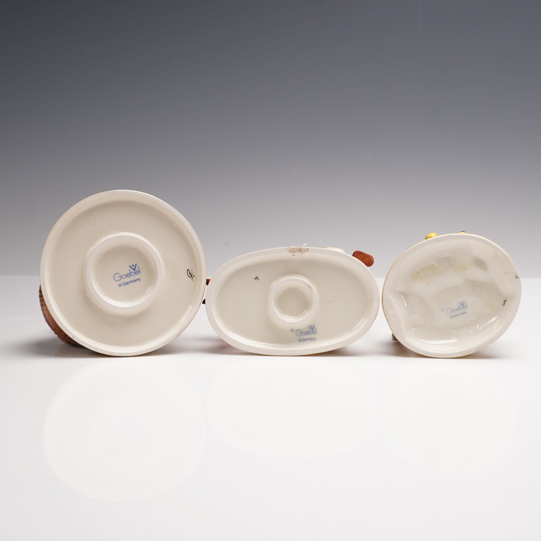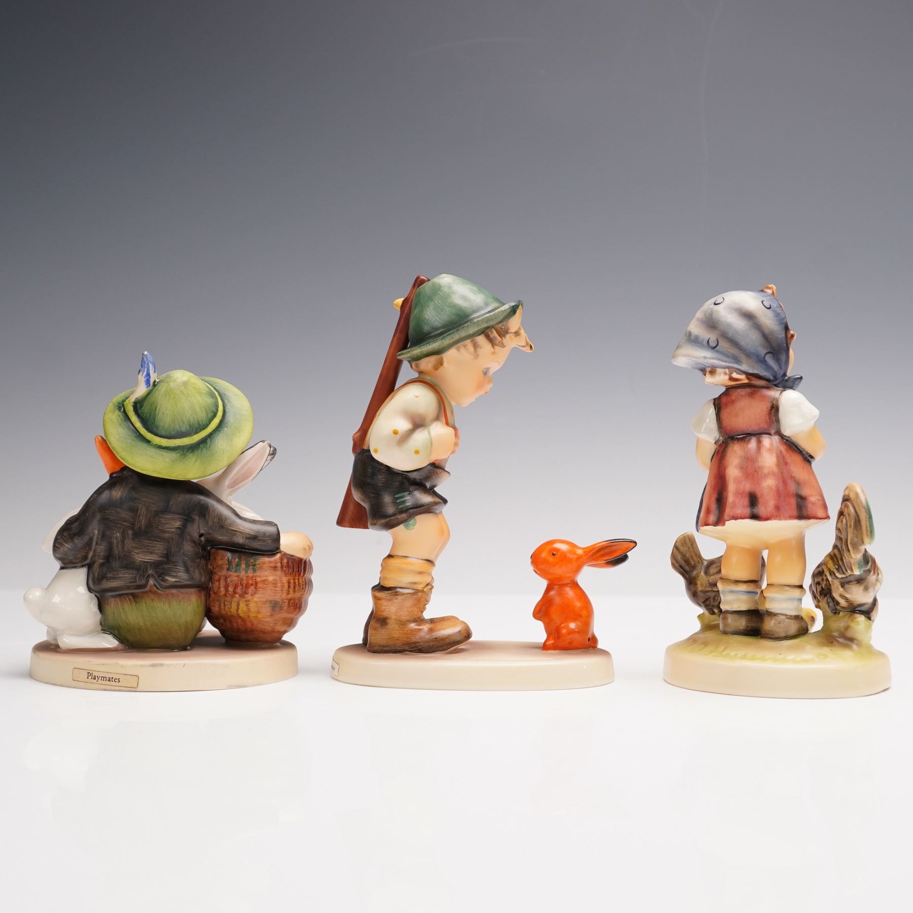 A trio of Hummel porcelain figurines, each finely modeled and decorated with vibrant hand-painted detail. The grouping features Sensitive Hunter, Playmates, and Feeding Time. Various depictions such as a boy seated with white rabbits nestled at his side and within a basket, a young huntsman pausing to gaze curiously at a bright orange hare, and a village girl cradling chicks in her arms while hens and roosters gather at her feet. M. I. Hummel impressed backstamp. Goebel backstamp.
