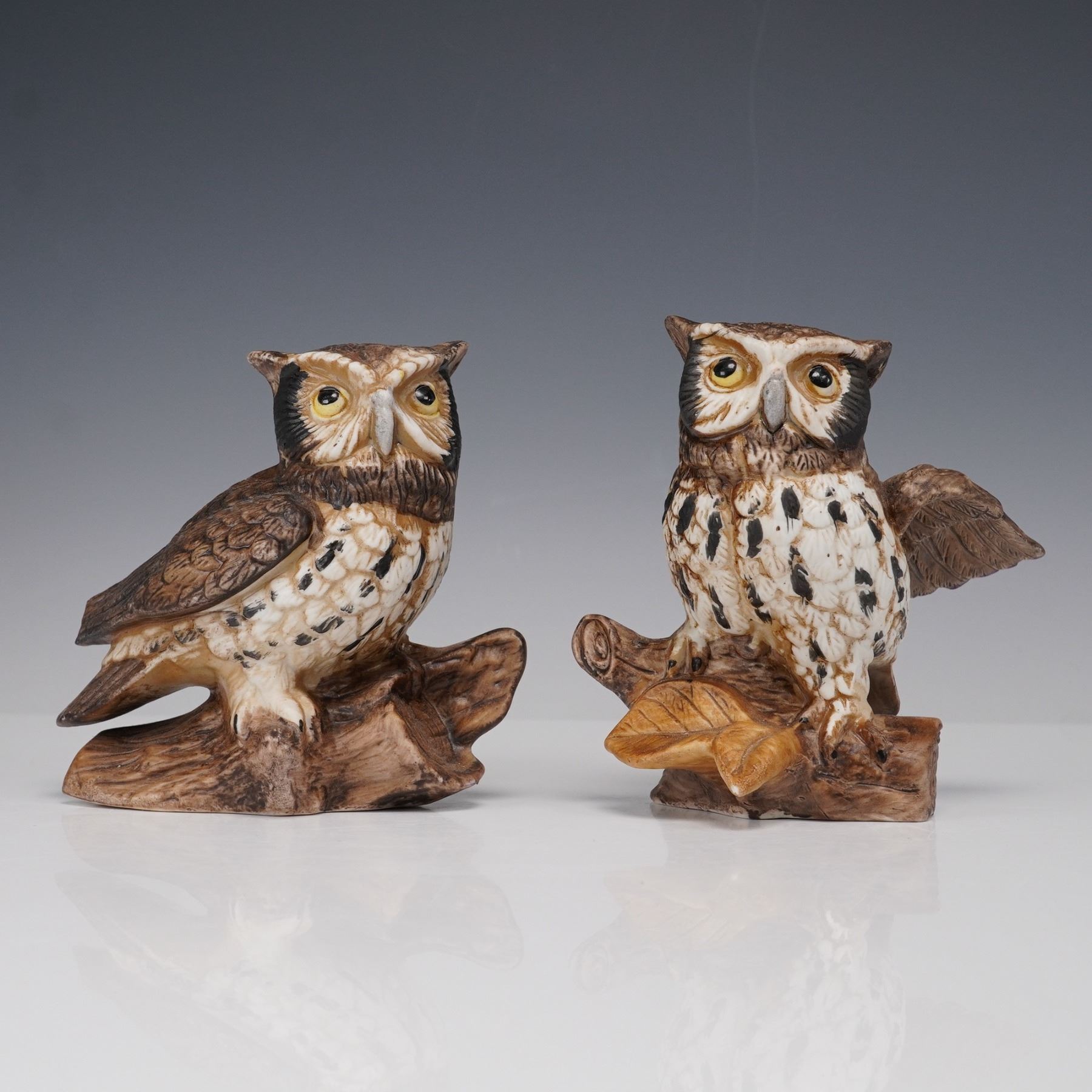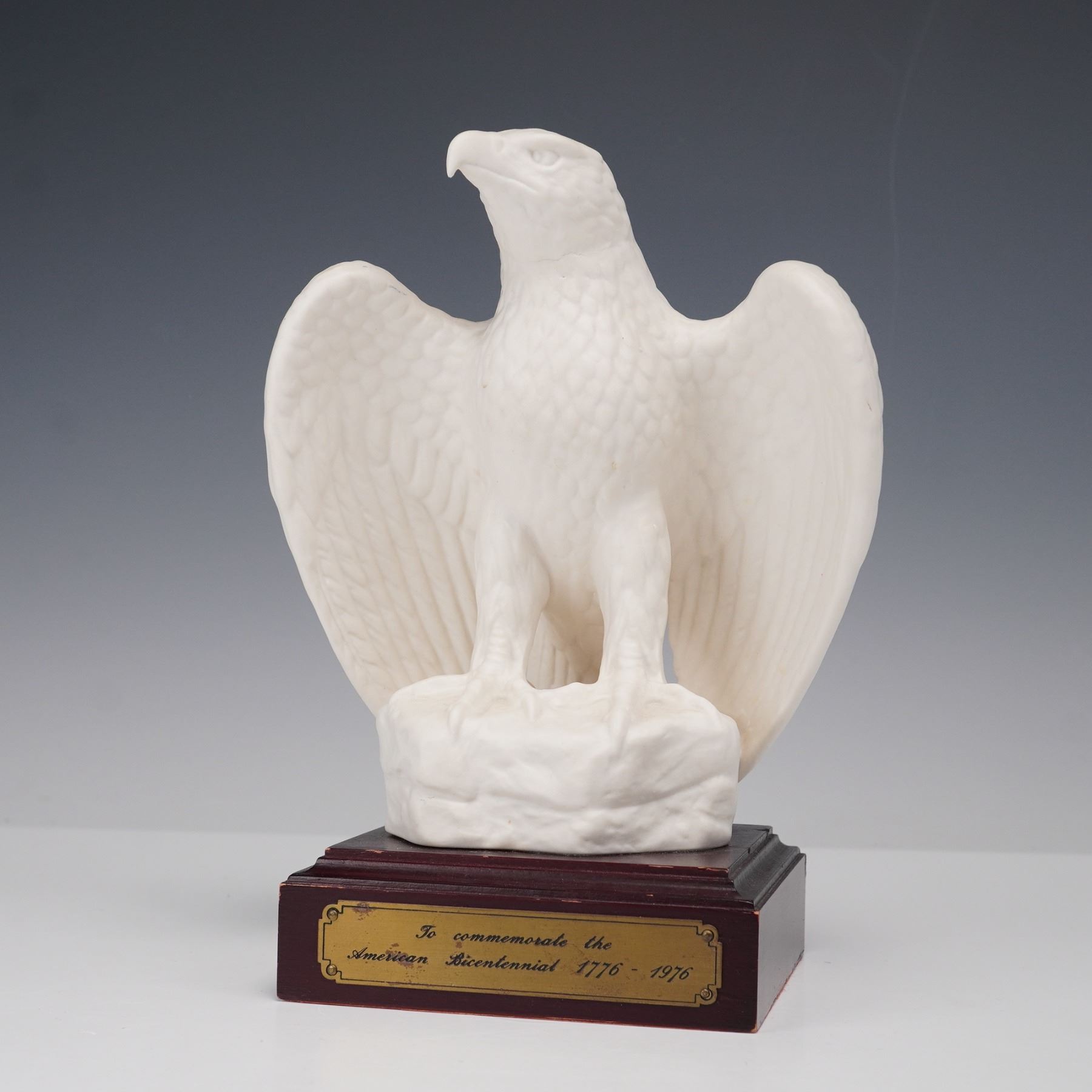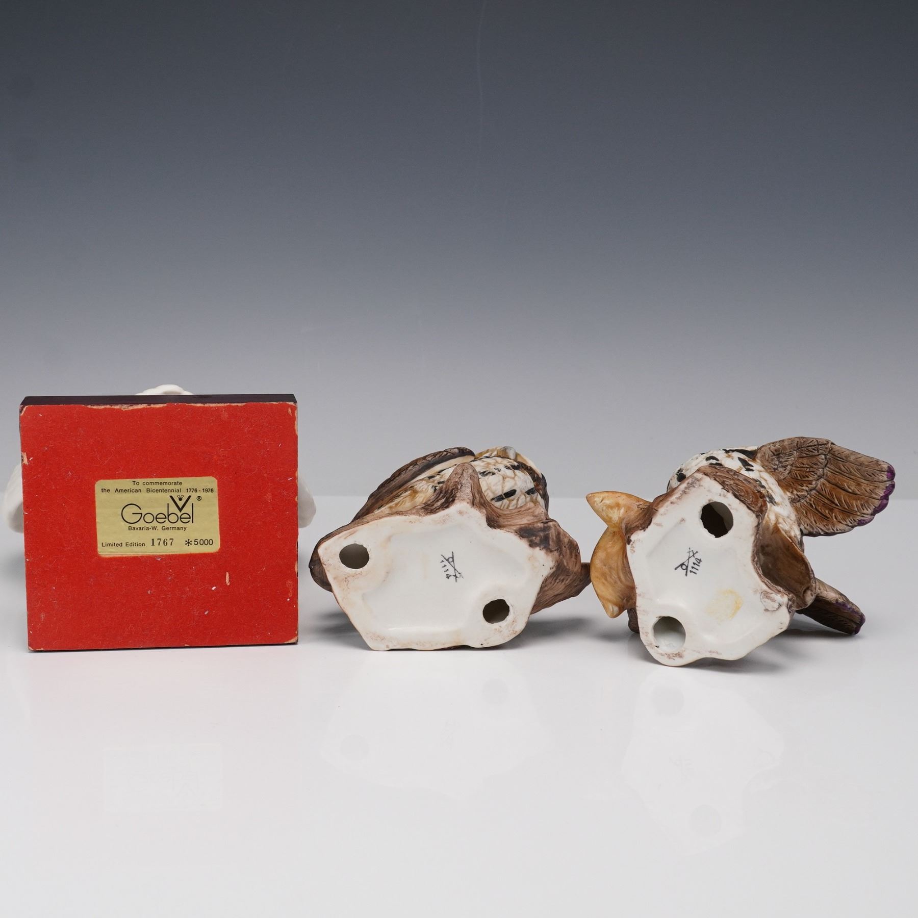 A three-piece porcelain figural group including a limited edition Goebel American Bald Eagle and a pair of Homco Great Horned Owls. The Goebel eagle is rendered in matte white porcelain with wings spread wide, mounted on a wood-tone base with a brass plaque inscribed "To commemorate the American Bicentennial 1776 - 1976." Marked Goebel Bavaria W. Germany, numbered 1767 of 5000. Accompanying the eagle are two finely hand-painted Homco porcelain owl figurines, each modeled perched on a branch with naturalistic detail and expressive eyes. Owls are marked with crossed swords and model number 1114. All three pieces are in excellent condition with no chips or cracks.