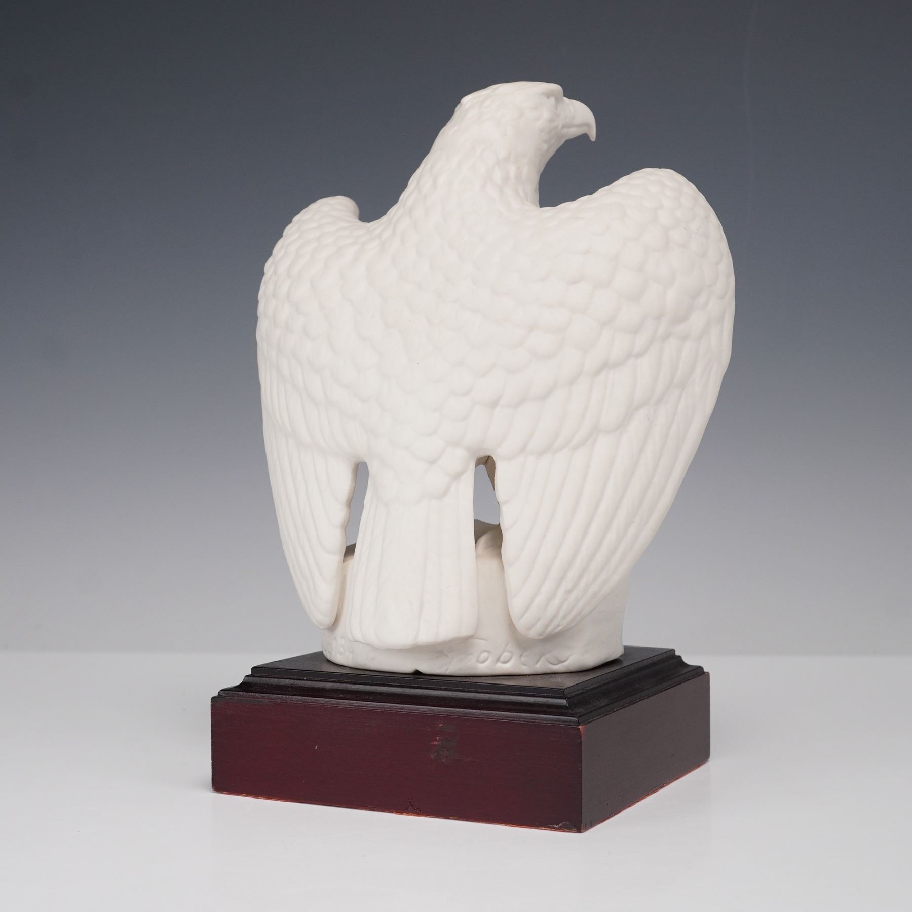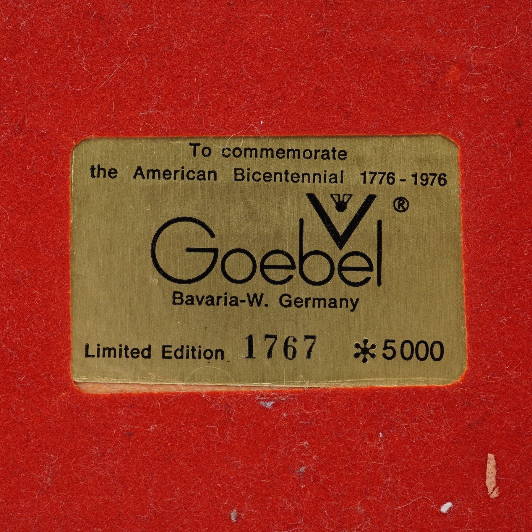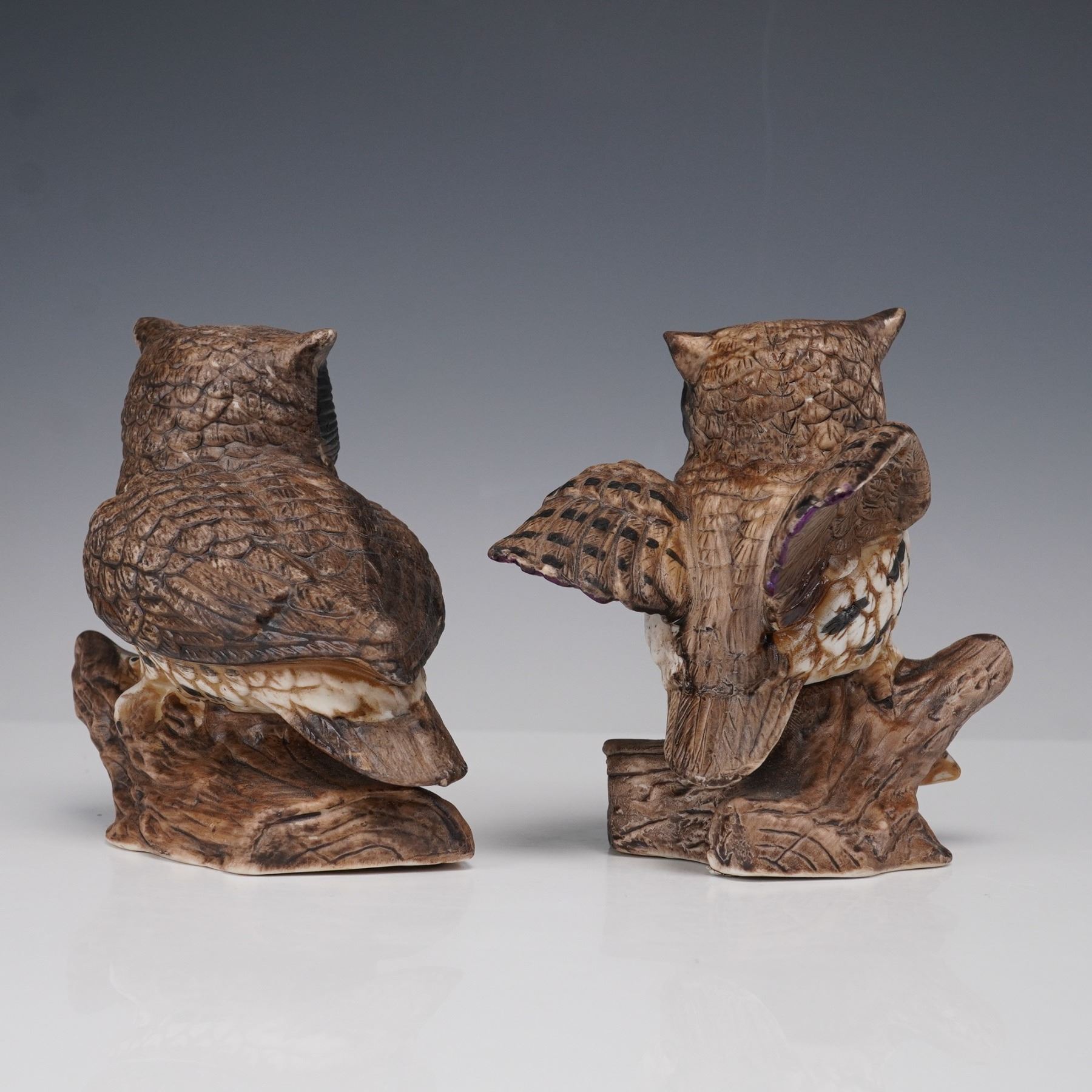 A three-piece porcelain figural group including a limited edition Goebel American Bald Eagle and a pair of Homco Great Horned Owls. The Goebel eagle is rendered in matte white porcelain with wings spread wide, mounted on a wood-tone base with a brass plaque inscribed "To commemorate the American Bicentennial 1776 - 1976." Marked Goebel Bavaria W. Germany, numbered 1767 of 5000. Accompanying the eagle are two finely hand-painted Homco porcelain owl figurines, each modeled perched on a branch with naturalistic detail and expressive eyes. Owls are marked with crossed swords and model number 1114. All three pieces are in excellent condition with no chips or cracks.