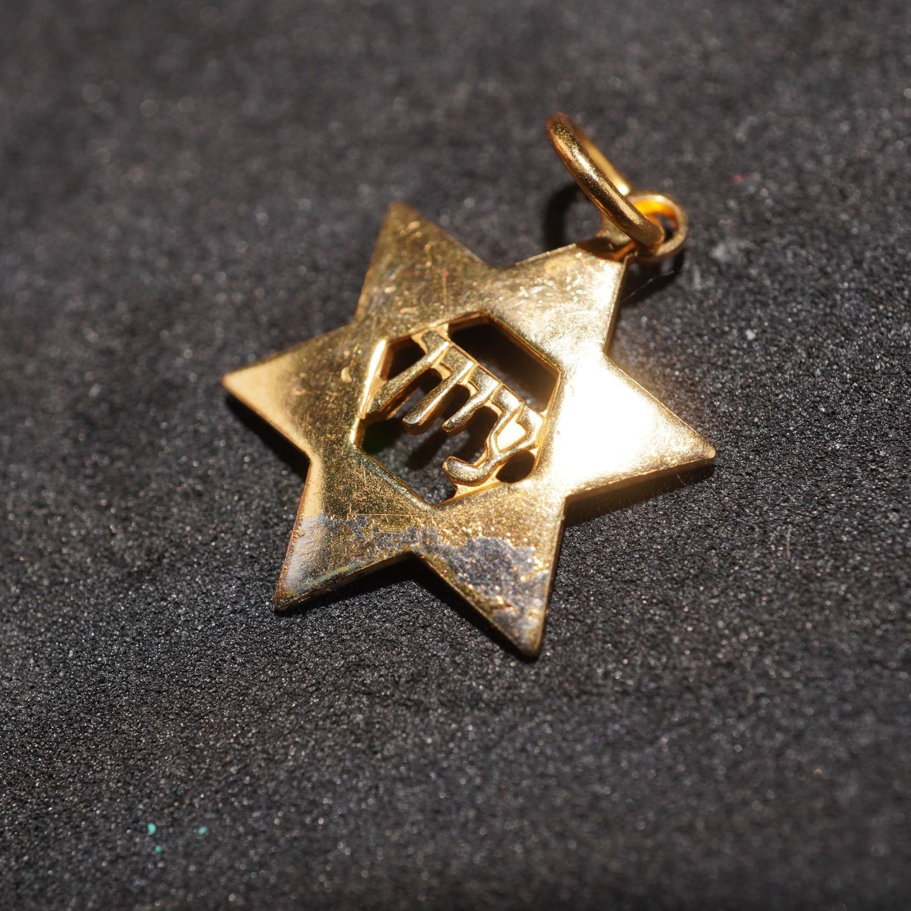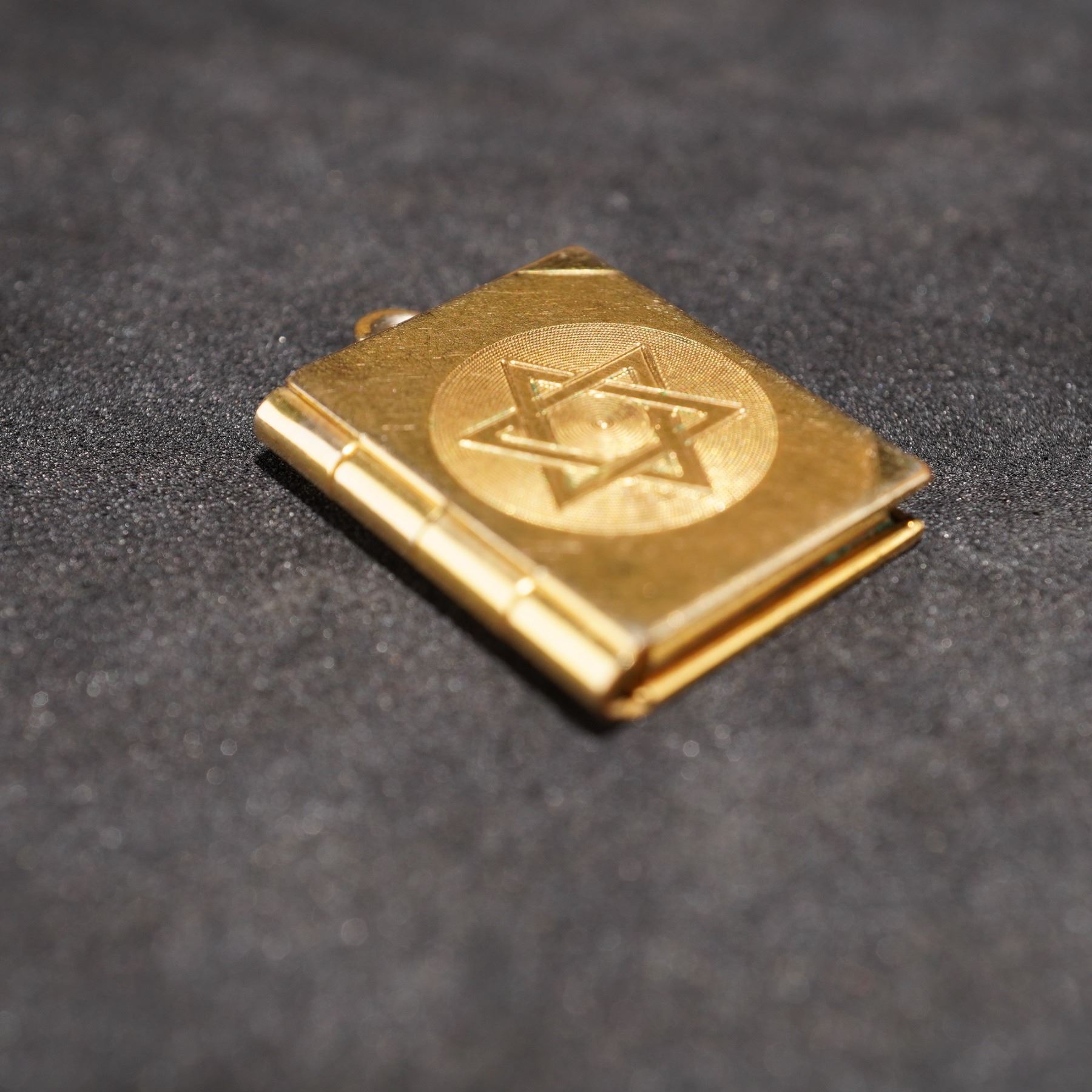 This 3-piece group includes a filigree pendant formed as the Hebrew word Chai, a Star of David pendant featuring a Chai at its center, and a gold filled book-form locket containing the Ten Commandments. The locket is marked 1/20 12K G.F. La Mode. Each piece is fitted with a suspension loop.
