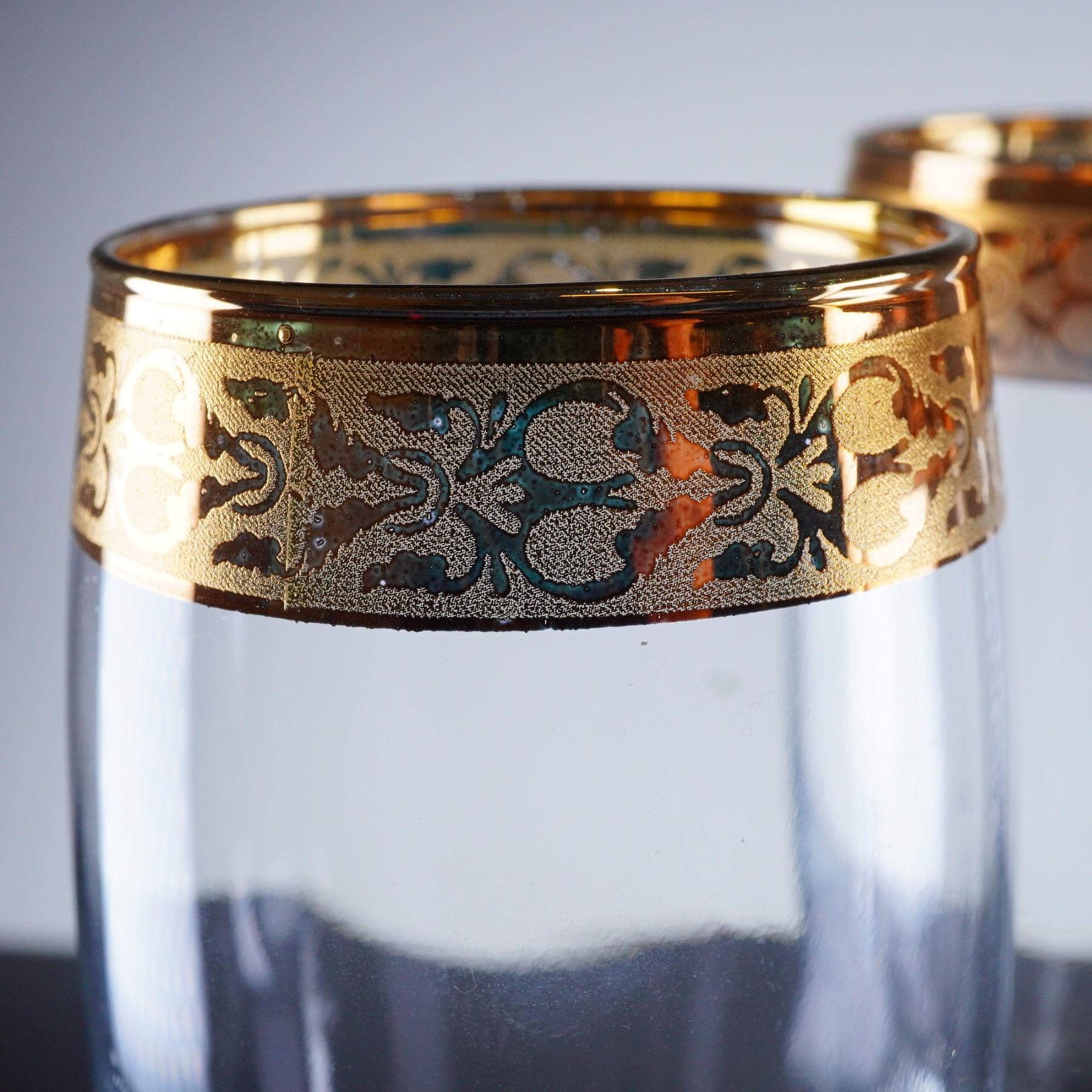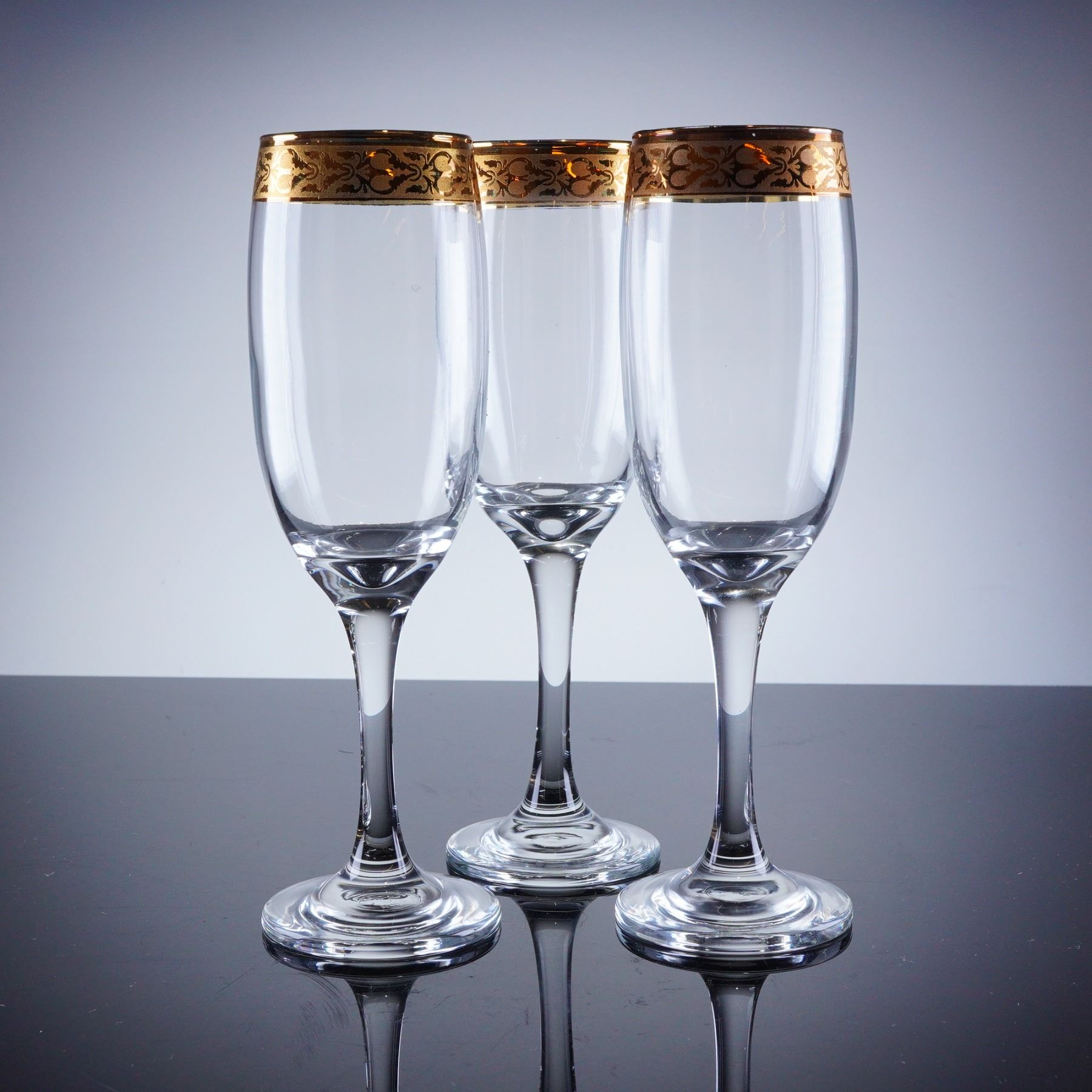 A trio of champagne flutes constructed of clear glass and featuring a tall, narrow bowl, slender stem, and circular foot. The defining characteristic is the wide, continuous band of intricate gold decoration applied near the rim. This decoration utilizes a dense, repeating etched foliate and scrolling pattern.