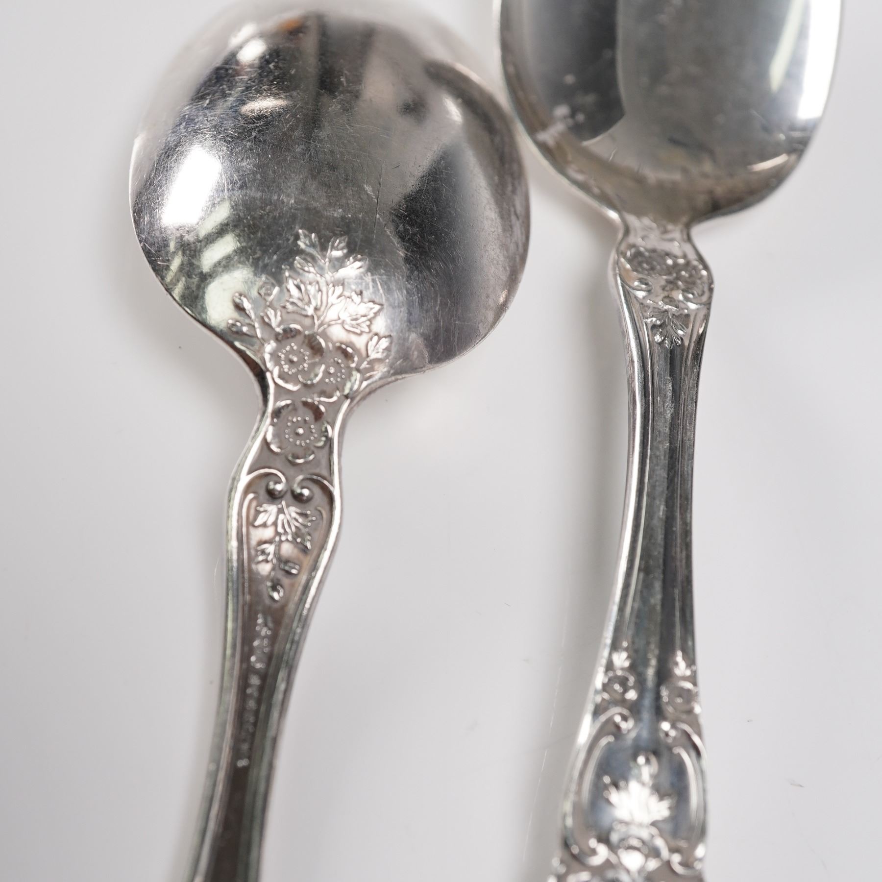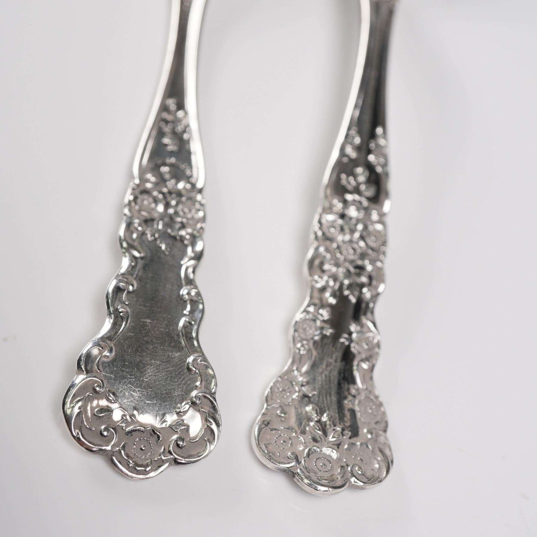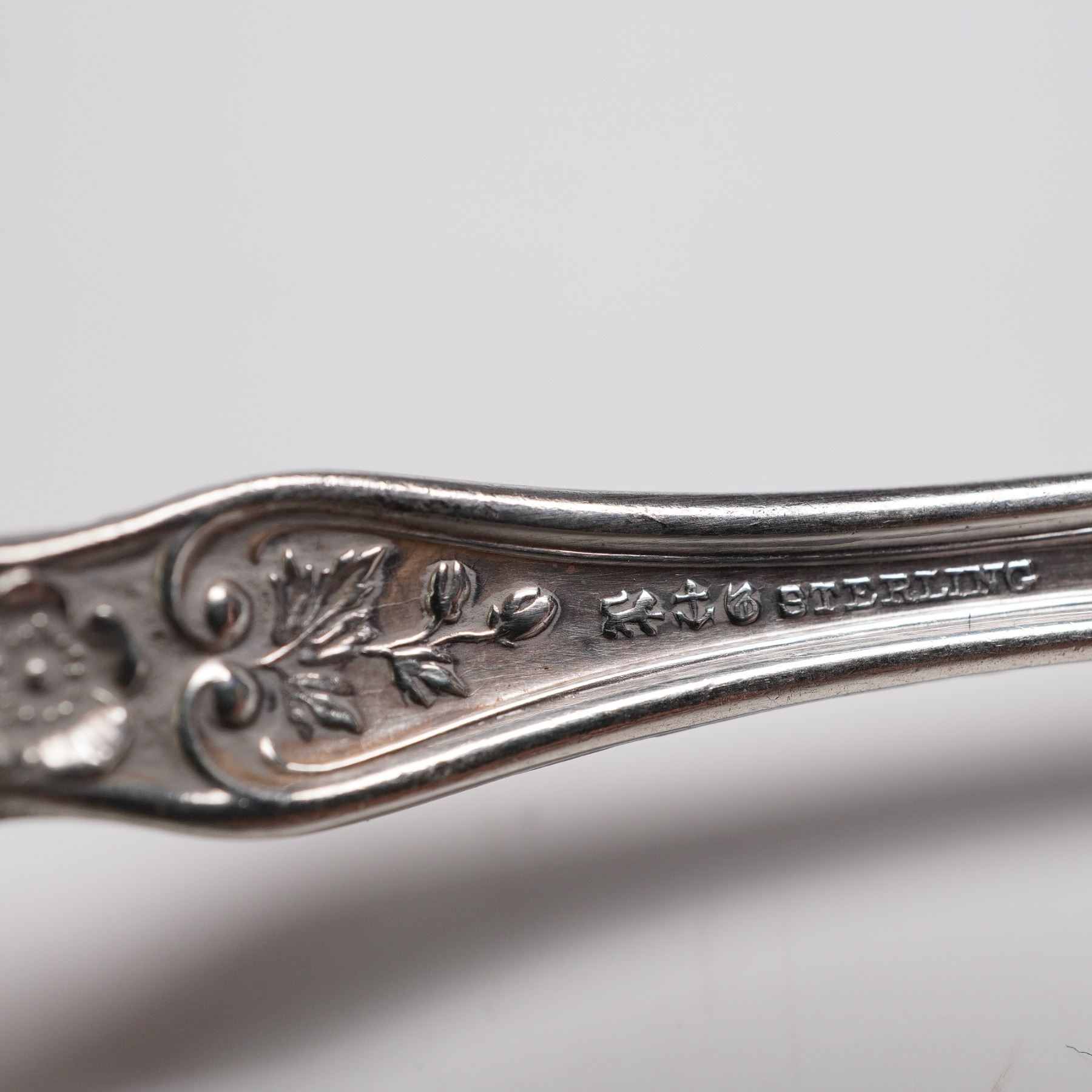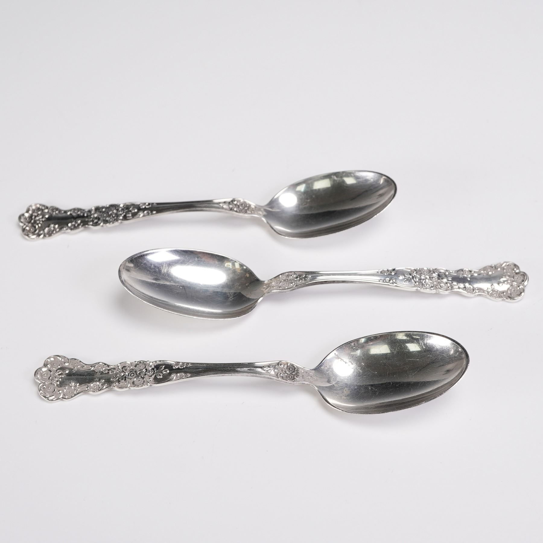 3pc Gorham sterling silver teaspoons in the Buttercup pattern. Each spoon features the pattern's signature buttercup floral motifs with ornate scrollwork, embodying a romantic and timeless style. Crafted in sterling silver and marked with the Gorham hallmark and Sterling on the reverse. A lovely addition to a formal table setting or a fine sterling silver collection. Net silver 2.55 troy oz.