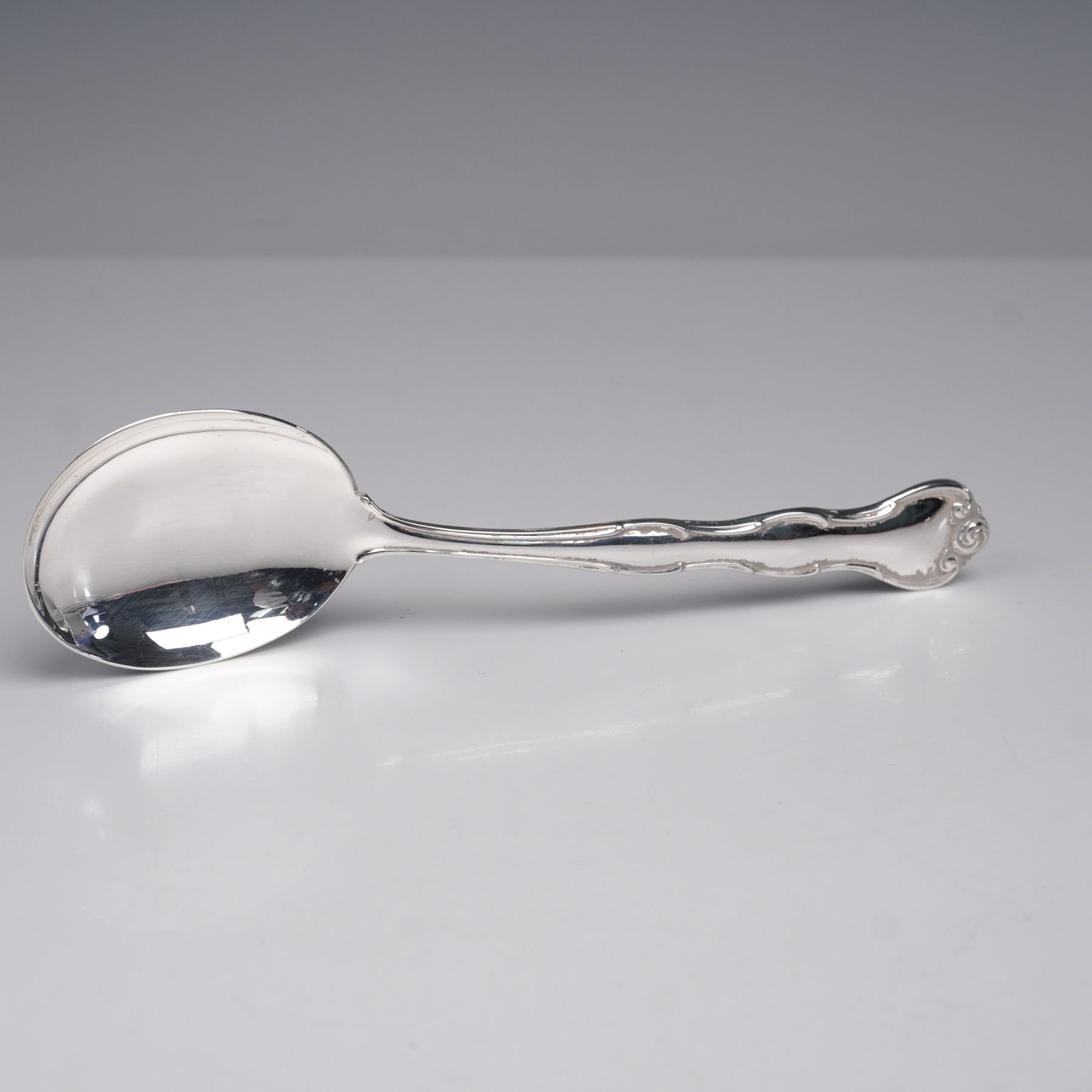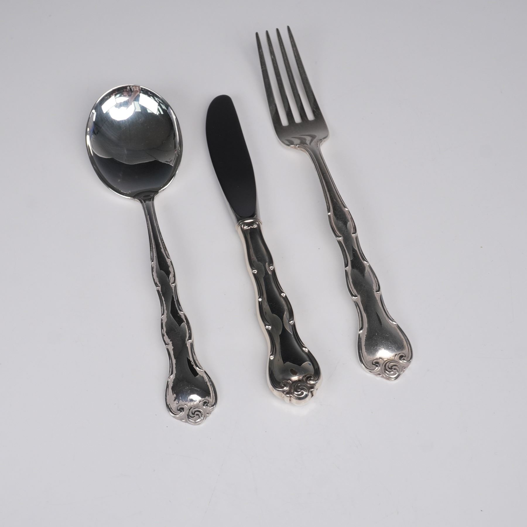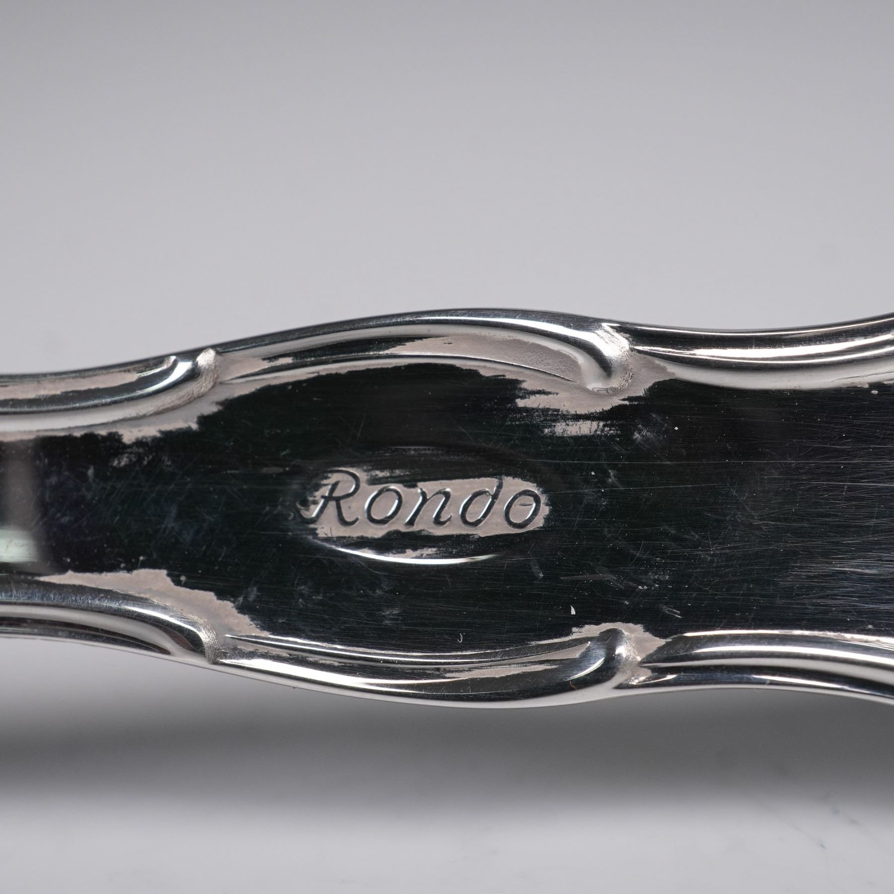 Fine selection of three sterling silver flatware in the Rondo pattern. This trio includes 1 butter spreader, 1 round bowl soup spoon, and 1 fork. Each piece is adorned with scrolling accents at the handle terminals, balanced by flowing contours along the length, modernizing the popular Strasbourg pattern. Butter spreader marked Gorham, Seamless, Sterling Handle, and Stainless Blade. Fork and spoon marked "Rondo" and hallmarked Gorham Sterling. Gross weight 4.5 oz. Butter spreader measures: 6.25"L x 0.75"W. Soup spoon measures: 6.5"L x 1.75"W. Fork measures: 7.25"L x 1"W.