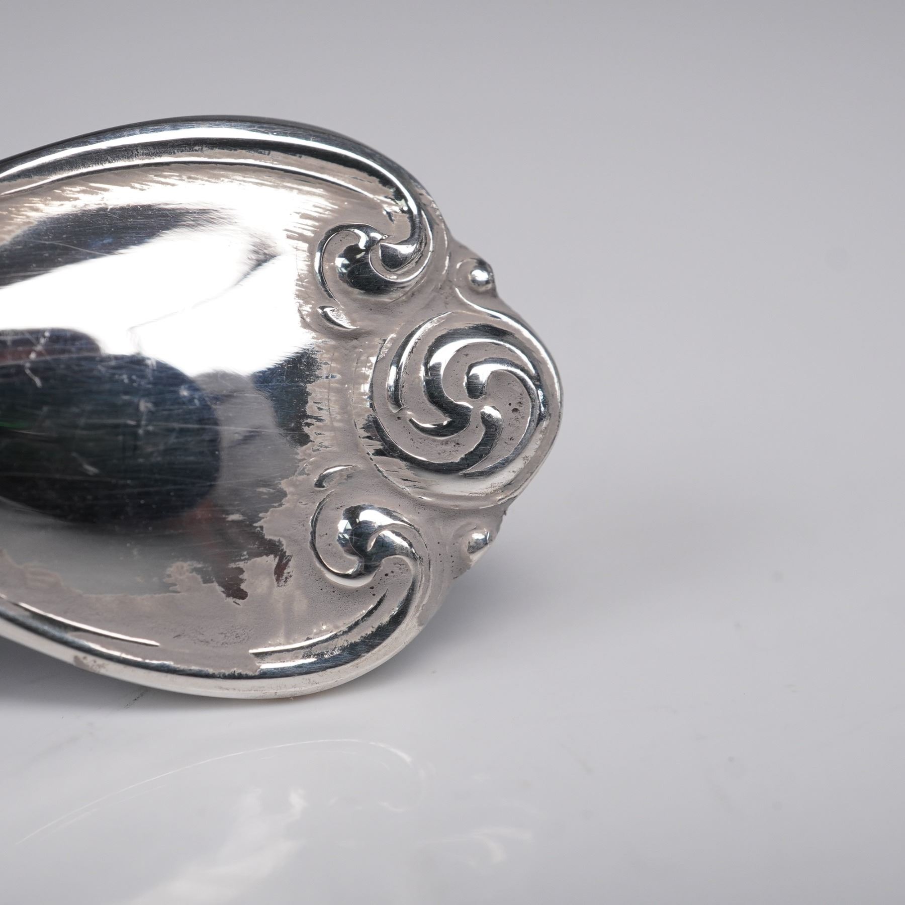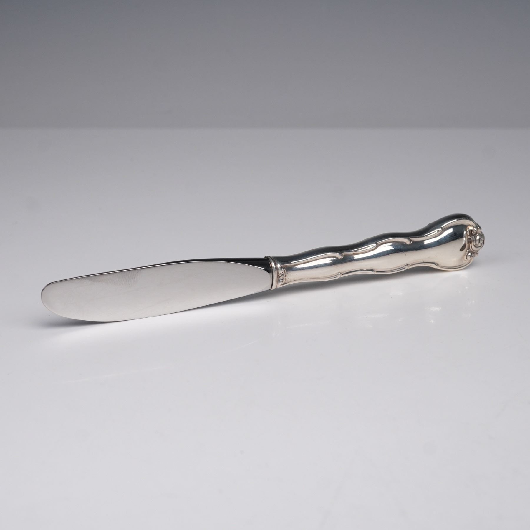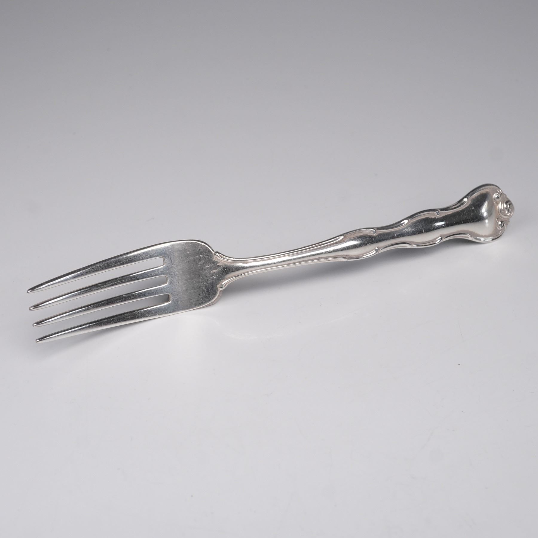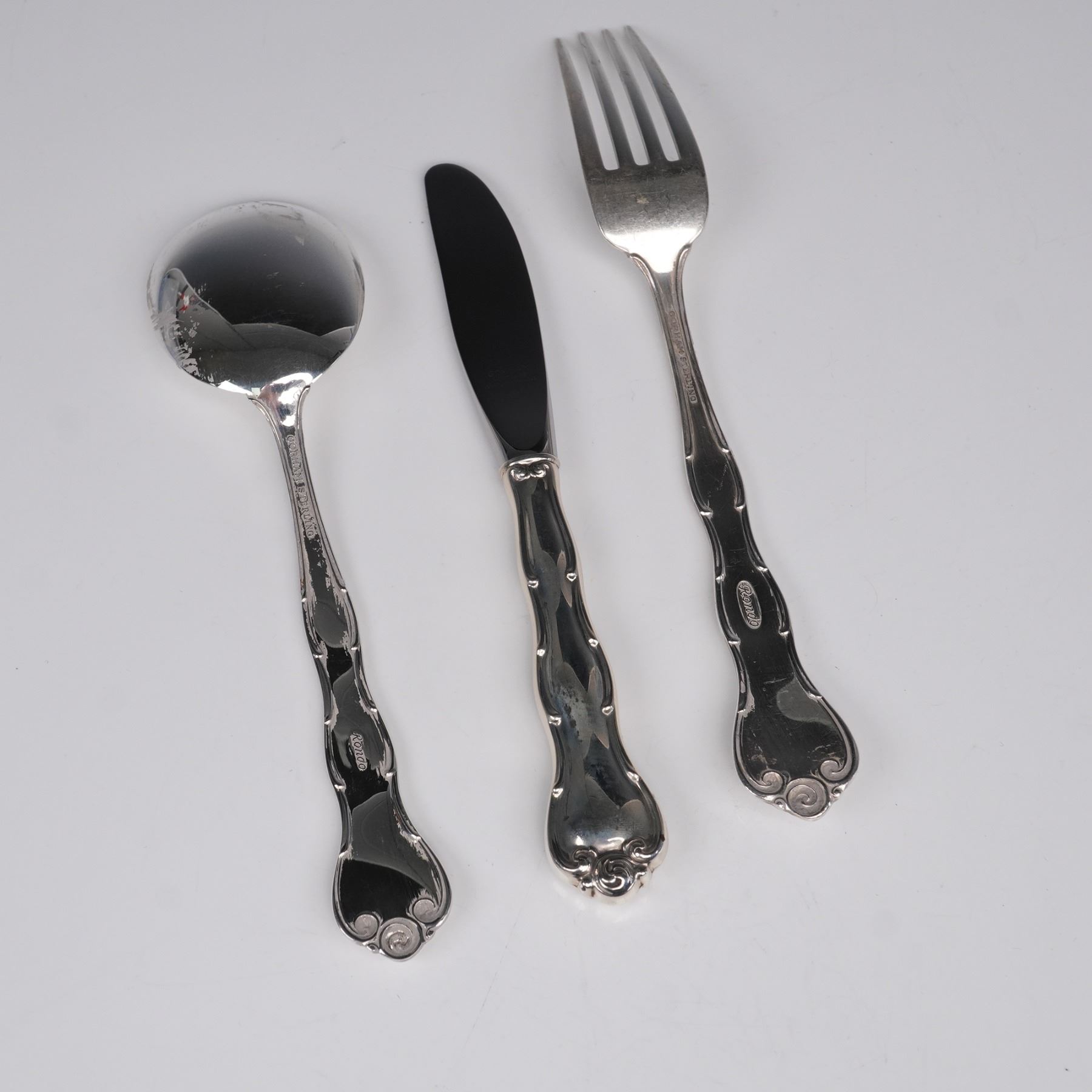 Fine selection of three sterling silver flatware in the Rondo pattern. This trio includes 1 butter spreader, 1 round bowl soup spoon, and 1 fork. Each piece is adorned with scrolling accents at the handle terminals, balanced by flowing contours along the length, modernizing the popular Strasbourg pattern. Butter spreader marked Gorham, Seamless, Sterling Handle, and Stainless Blade. Fork and spoon marked "Rondo" and hallmarked Gorham Sterling. Gross weight 4.5 oz. Butter spreader measures: 6.25"L x 0.75"W. Soup spoon measures: 6.5"L x 1.75"W. Fork measures: 7.25"L x 1"W.
