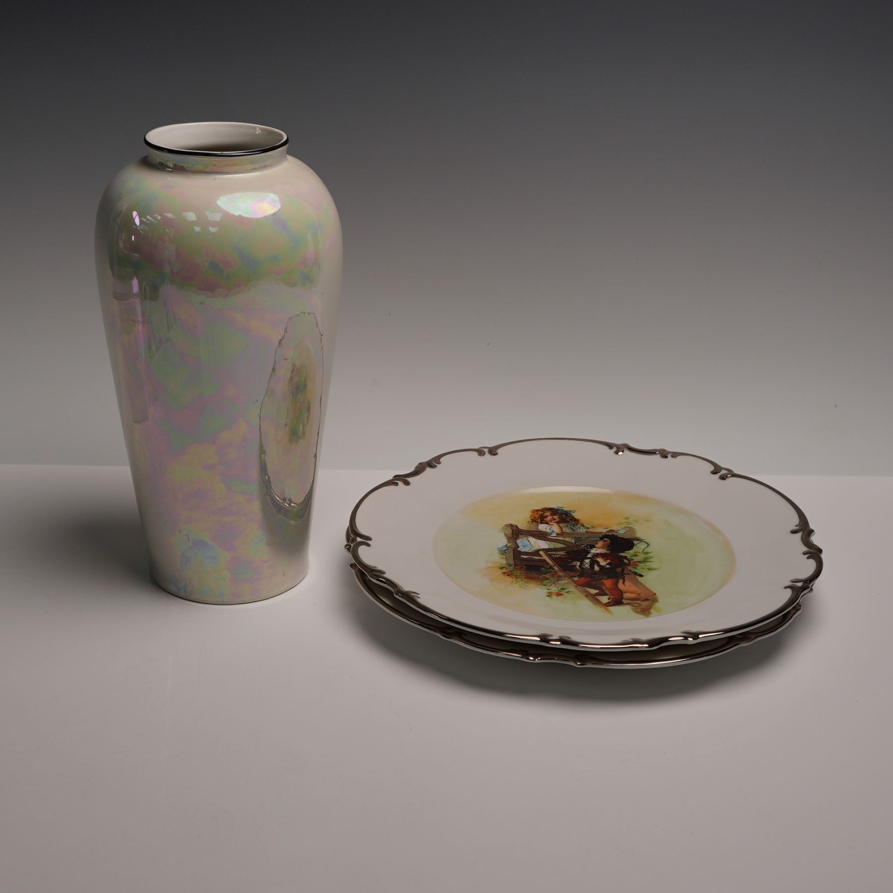 Charming group of three early 20th century German porcelain items, including two cabinet plates by Hutschenreuther Selb, each featuring figural scenes of children in vivid polychrome enamels. Both plates bear the green Hutschenreuther Sylvia mark and are further overmarked with red Pasco "Revere" import marks, numbered 8045. Accompanying the plates is a hand-decorated porcelain vase by Zeh, Scherzer & Co. (Z.S. & Co.), Bavaria, also adorned with a similar figural motif of two children and a small dog. Each piece displays fine transfer and hand-painted detailing with luster highlights and gilt accents. Plates retain scalloped edges with silver or platinum-toned borders.
