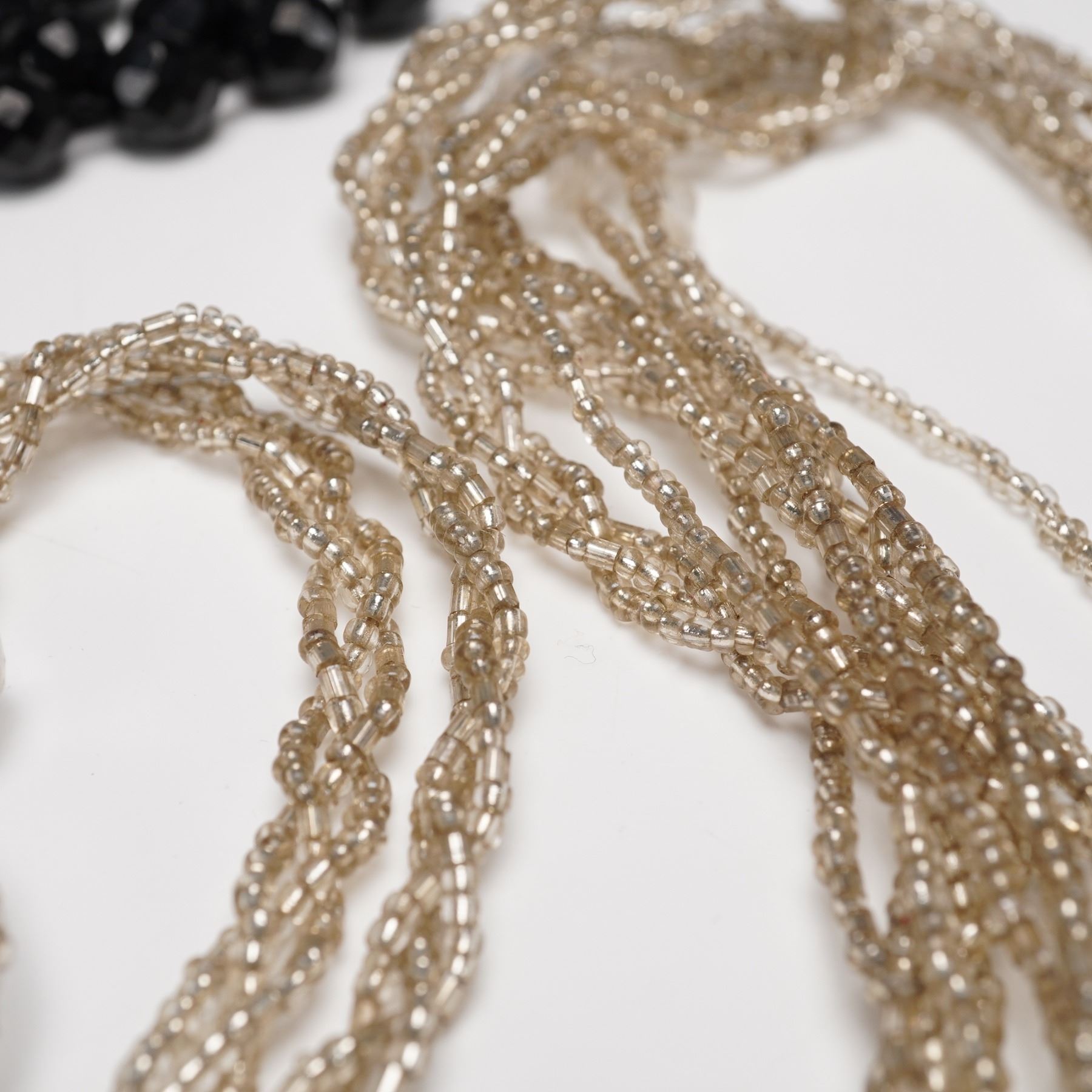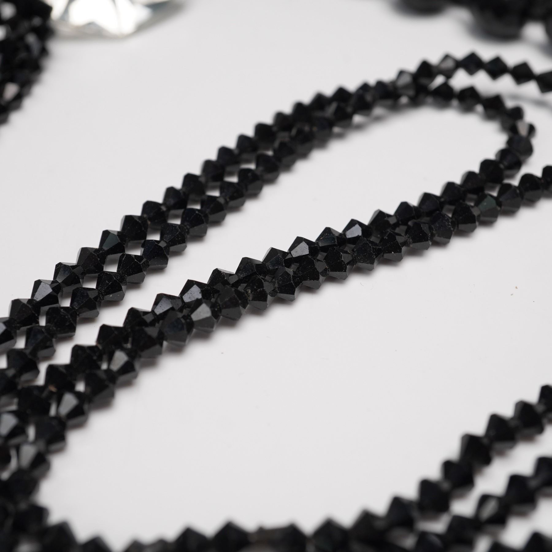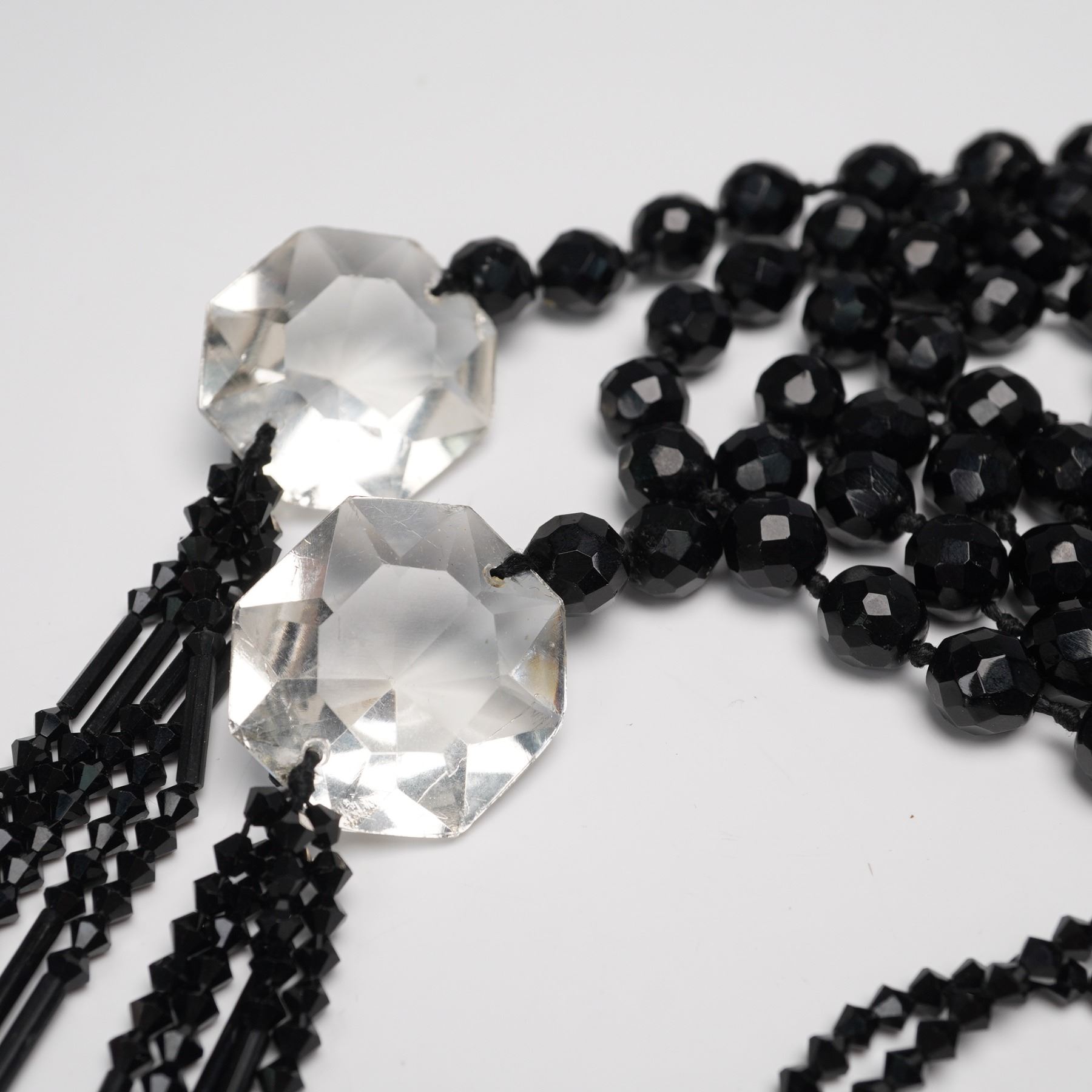 A stylish trio of rhinestone and beaded necklaces, each showcasing distinct texture and design. The group includes a dramatic drape-style black beaded necklace with faceted crystal drops and tassel ends, a single-strand faceted black rhinestone necklace measuring approximately 64 inches in length, and a delicate champagne-toned multi-strand glass bead necklace with subtle shimmer. Together, these pieces offer a versatile mix of vintage glamour and modern elegance, ideal for layering or statement wear.