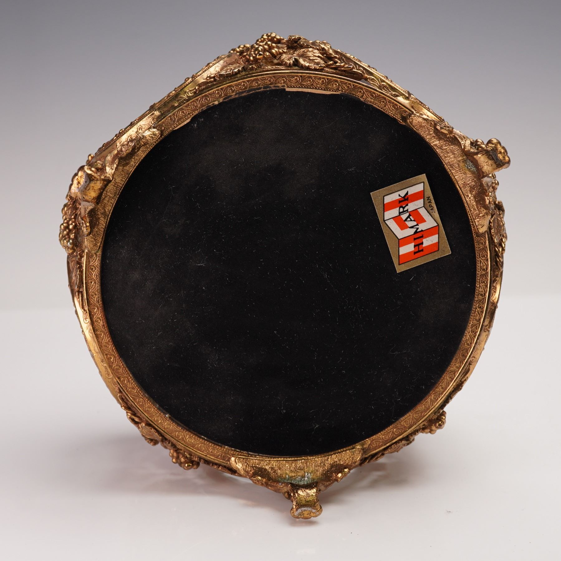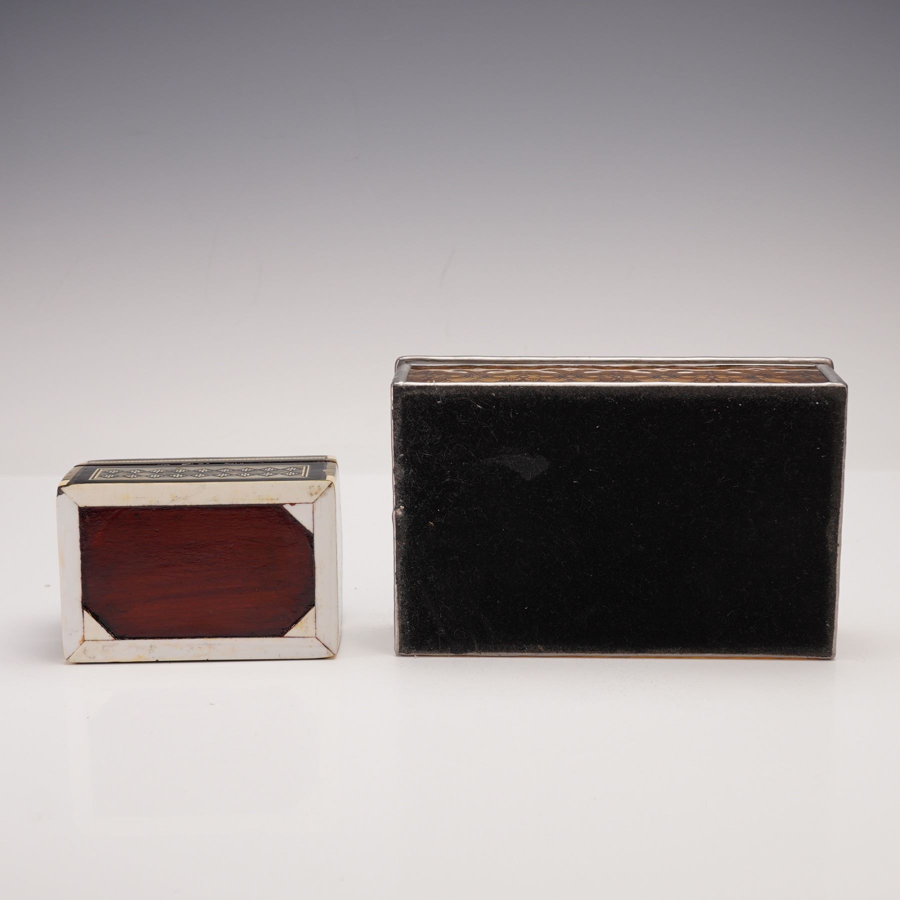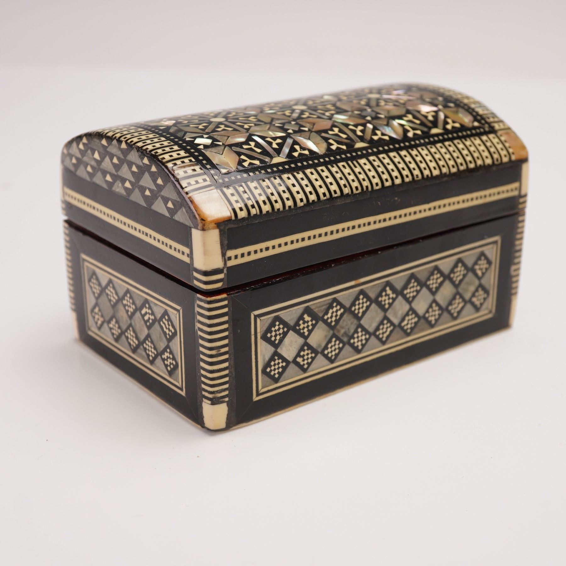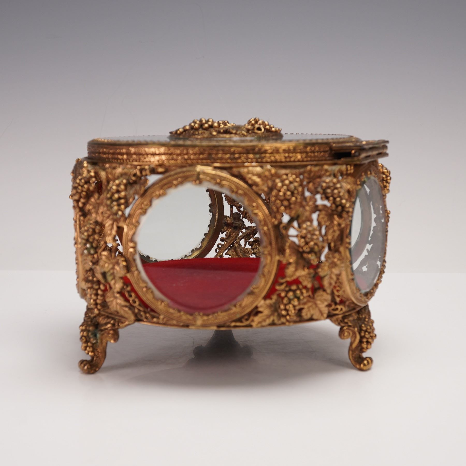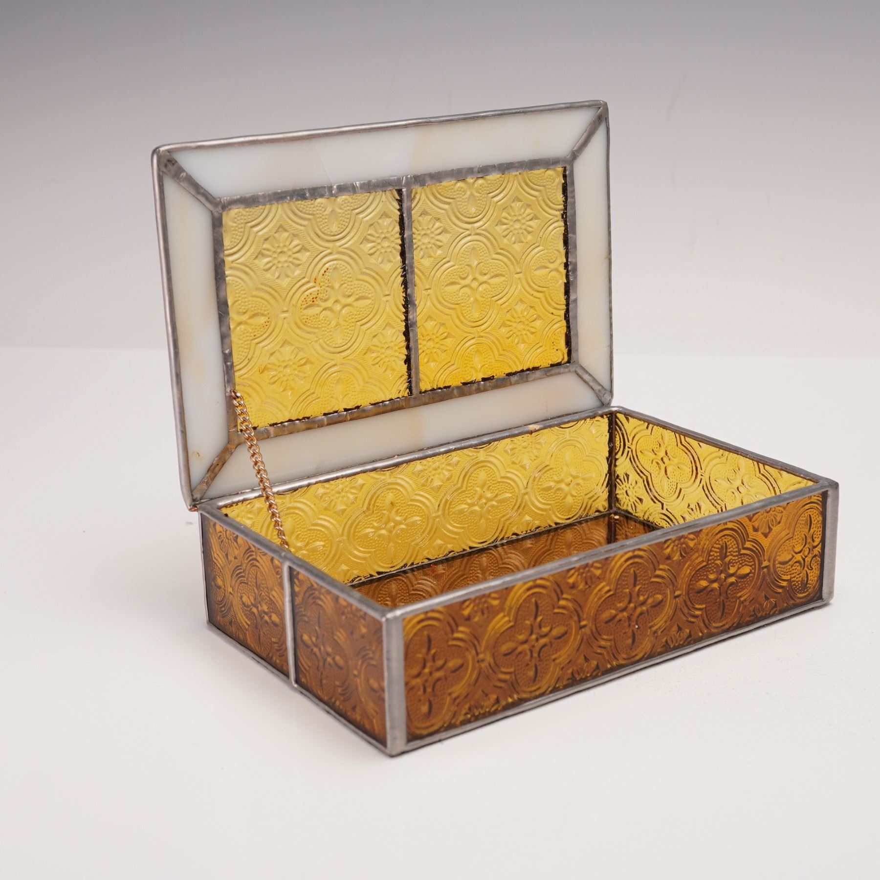 Charming group of three decorative trinket and jewelry boxes, each distinct in style and craftsmanship. The centerpiece is a gilt brass and beveled glass jewelry casket by Hilcraft Japan, richly ornamented with raised grapevine and floral motifs, mirrored panels, and a red velvet interior resting on ornate paw feet. Complementing it is a rectangular stained and embossed glass box featuring amber and white panels framed in soldered metal with intricate repeating quatrefoil patterns, its hinged lid opening to reveal a luminous golden interior. Completing the trio is a finely handcrafted wooden box adorned with a geometric inlaid pattern of mother-of-pearl or shell, lined in deep blue velvet and designed with smooth brass hinges. Together, these pieces reflect a harmonious blend of European, Asian, and artisan influences-perfect for display or elegant storage.