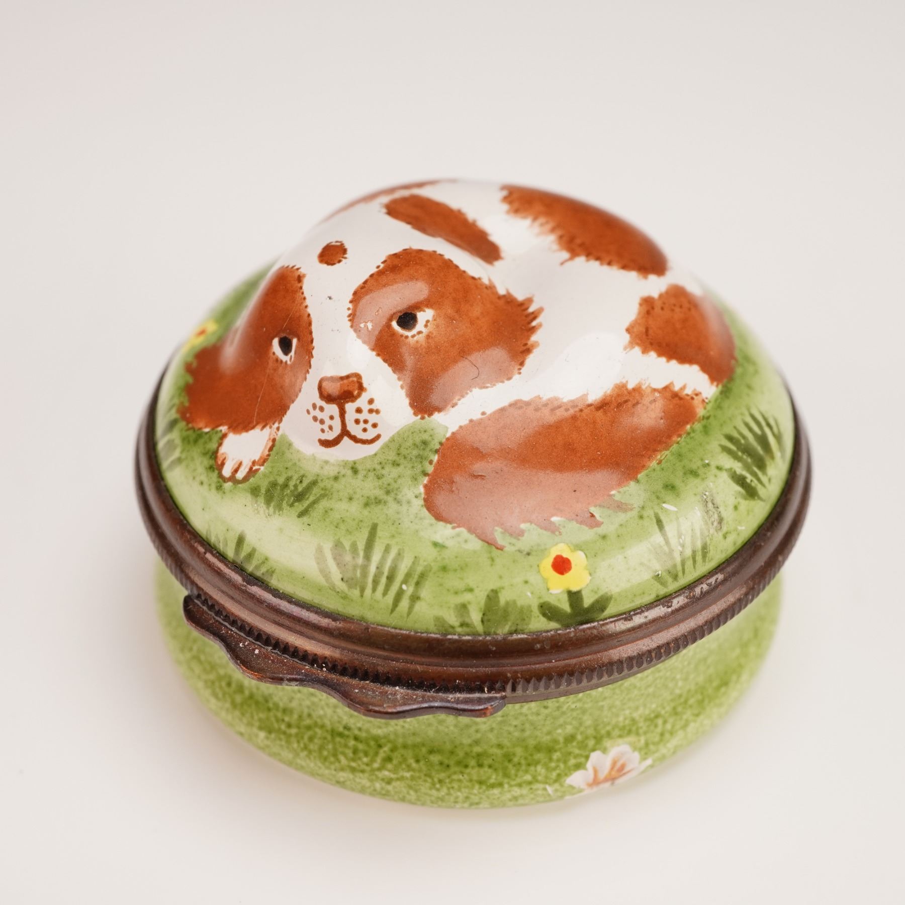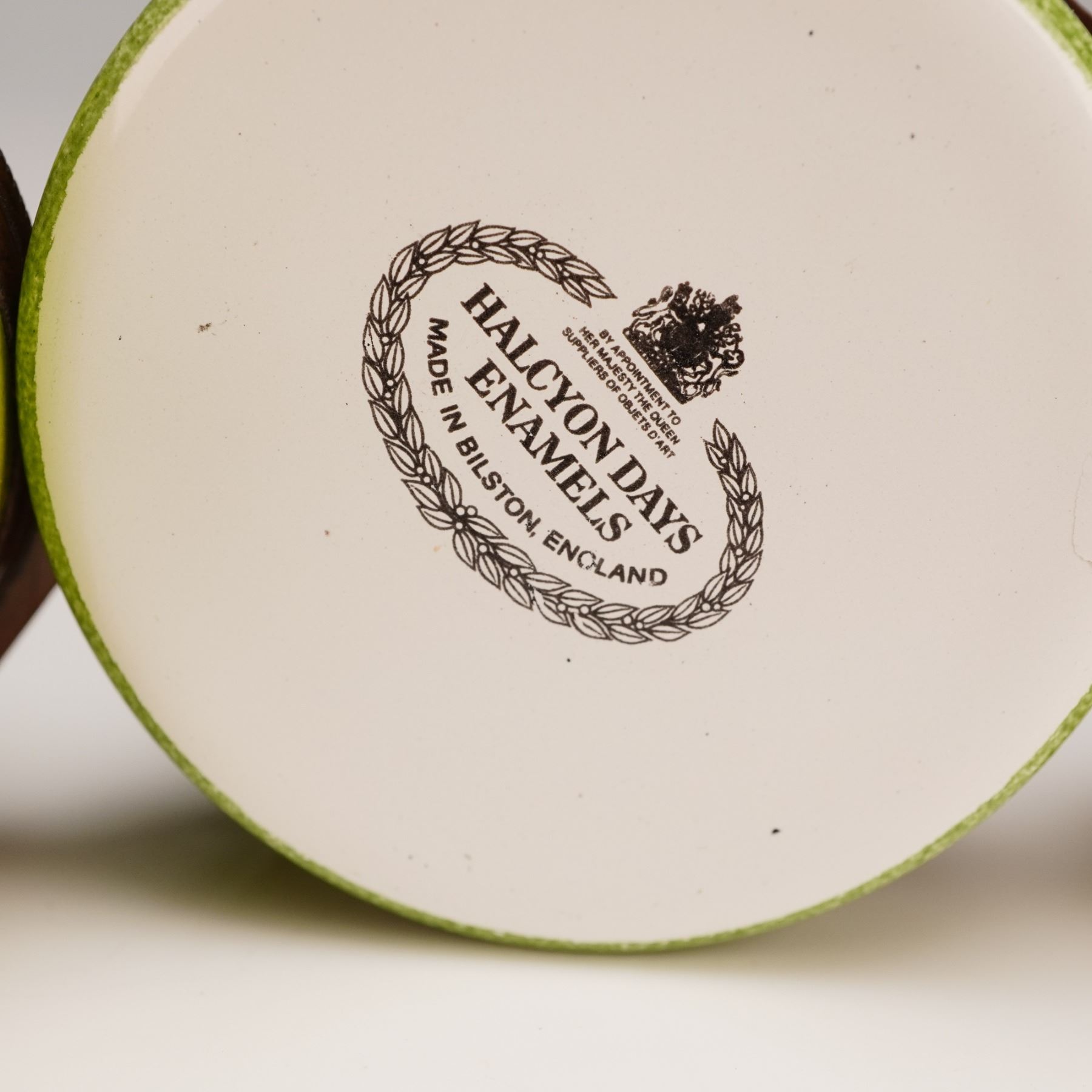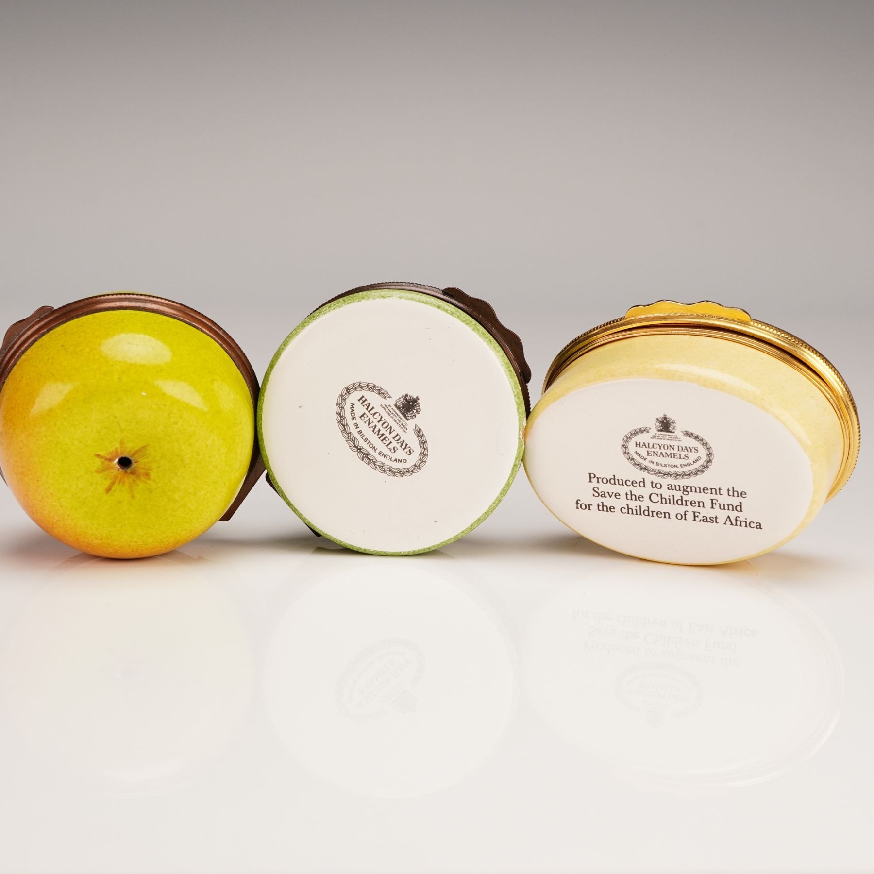 A charming trio of Halcyon Days enamel treasure boxes, each finely crafted in England. This set includes a round box with a hand-painted spaniel resting on green grass, a novelty apple-shaped box with a glossy fruit finish, and an oval box decorated with a colorful scene. The oval box was Produced to support the Save the Children Fund for the children of East Africa, the interior of the lid features an inscription from 1 Corinthians 13:11-13. All Marked with Halcyon Days enamel backstamp. Largest piece measures: 1.5"H.