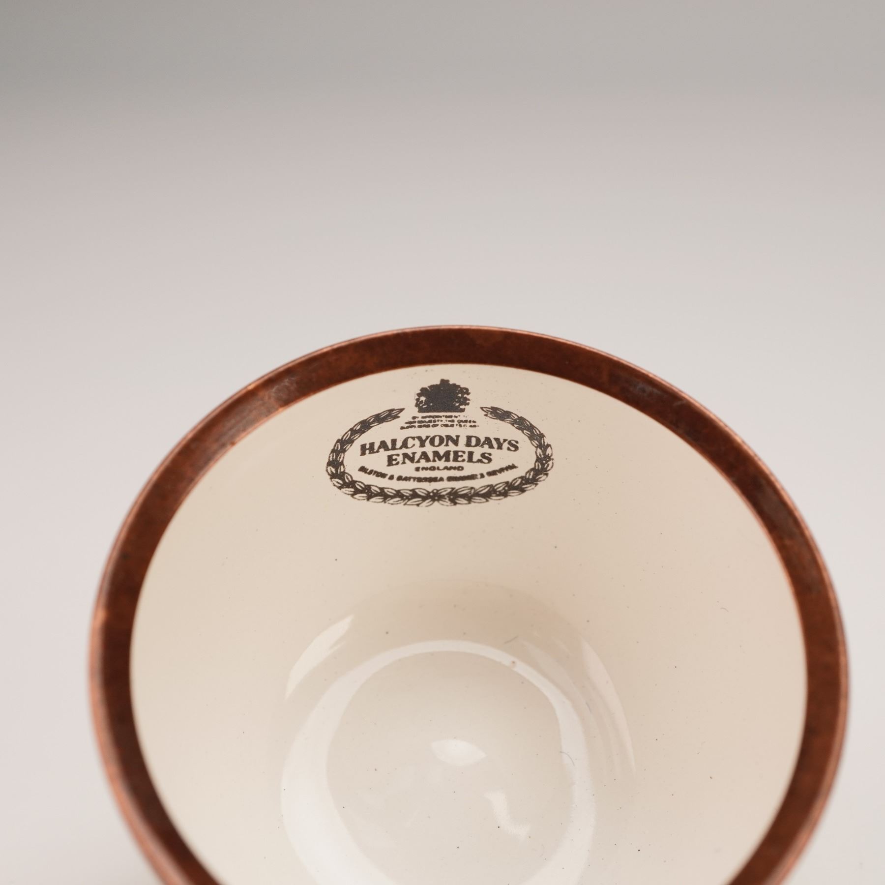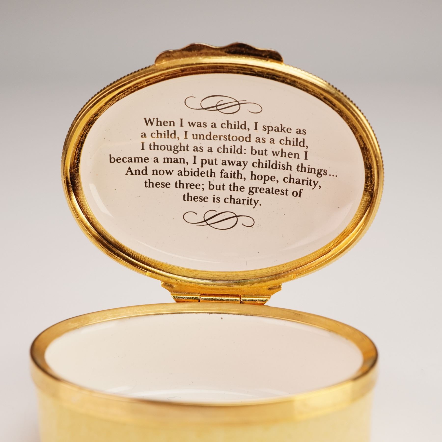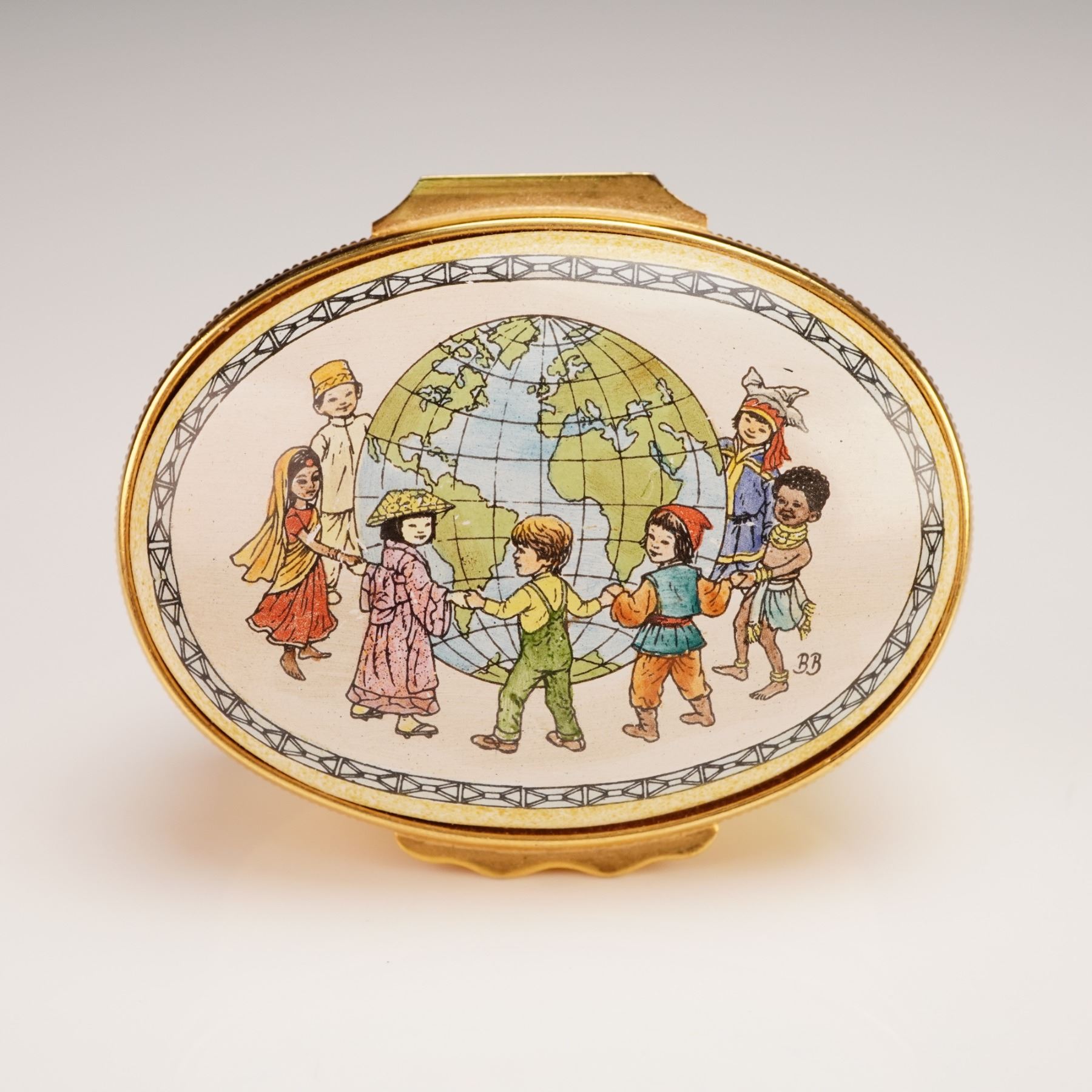 A charming trio of Halcyon Days enamel treasure boxes, each finely crafted in England. This set includes a round box with a hand-painted spaniel resting on green grass, a novelty apple-shaped box with a glossy fruit finish, and an oval box decorated with a colorful scene. The oval box was Produced to support the Save the Children Fund for the children of East Africa, the interior of the lid features an inscription from 1 Corinthians 13:11-13. All Marked with Halcyon Days enamel backstamp. Largest piece measures: 1.5"H.