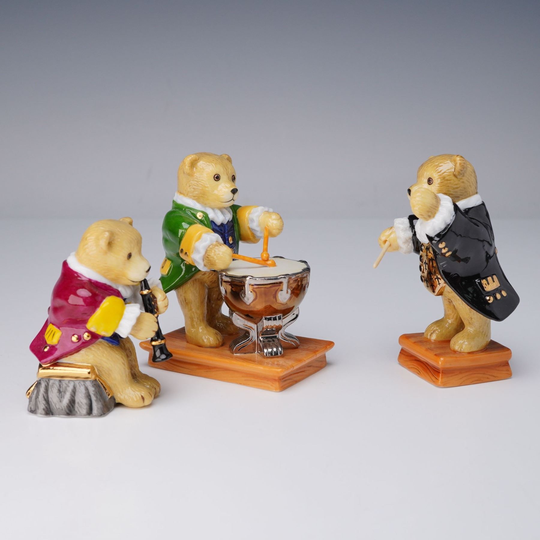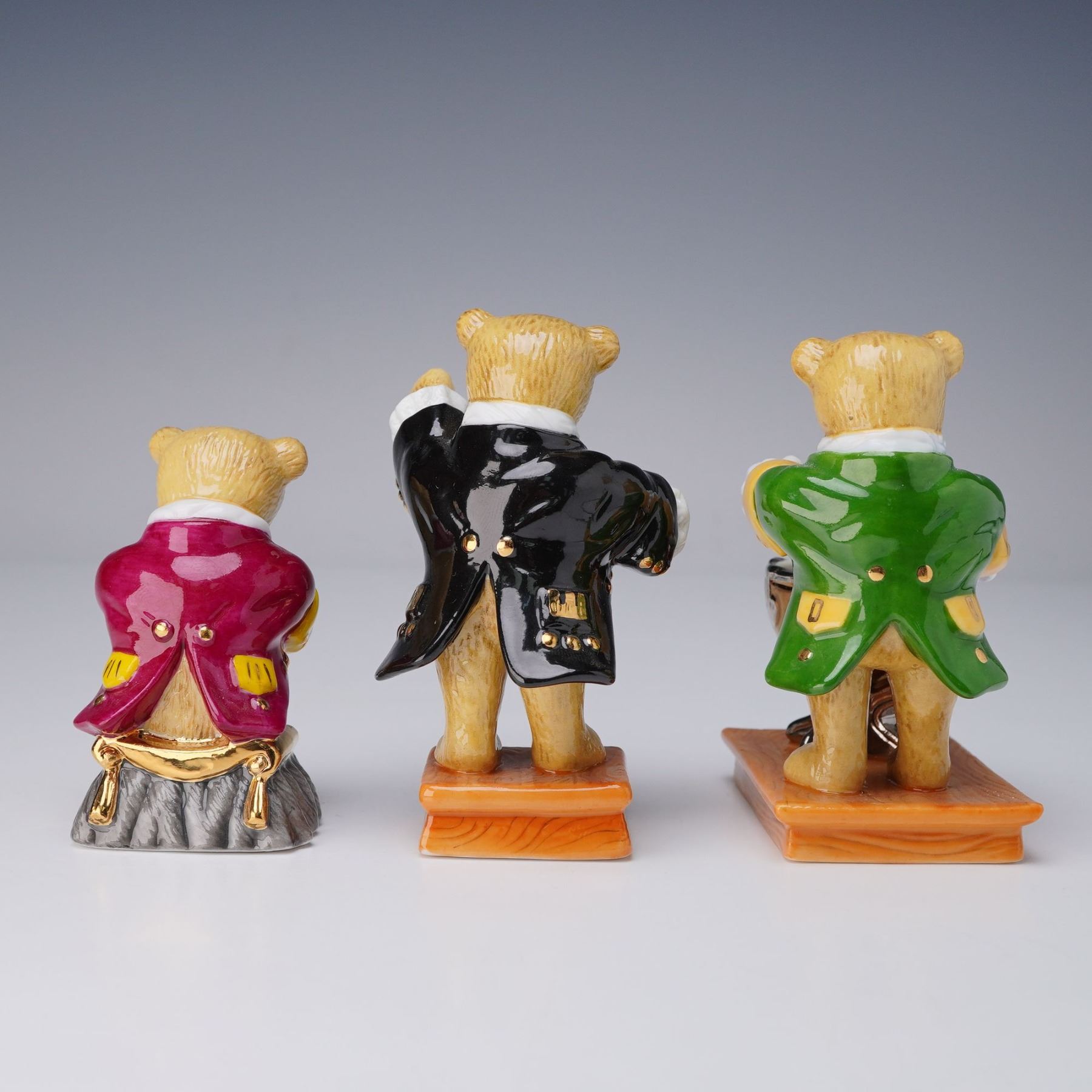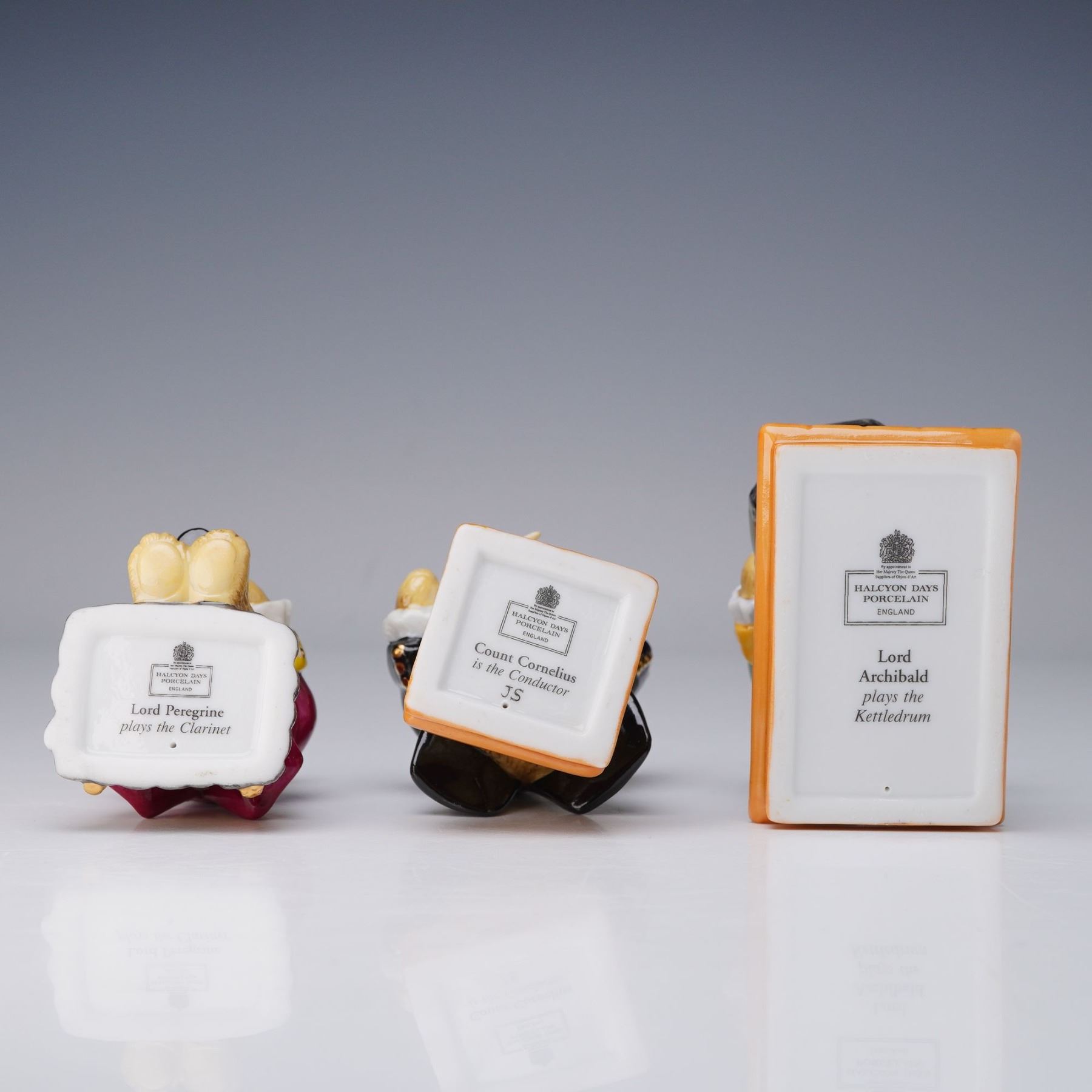 A charming trio of Halcyon Days porcelain figurines from the Musical Bears series, each finely hand-painted and detailed with gilt accents. Includes Lord Peregrine playing the Clarinet, Count Cornelius the Conductor, and Lord Archibald playing the Kettledrum. Each figure bears the Halcyon Days backstamp to the base and titled markings.
