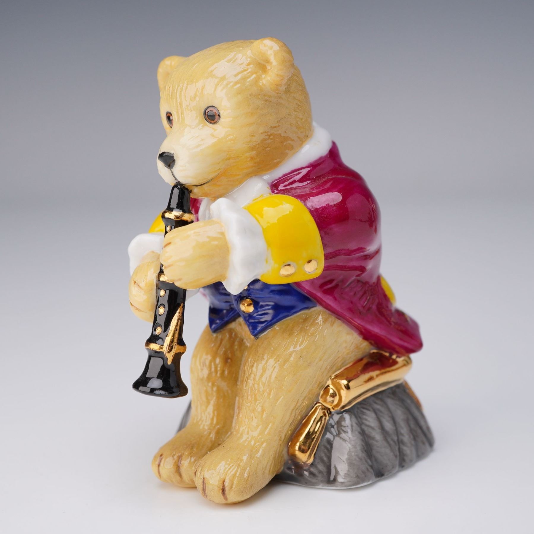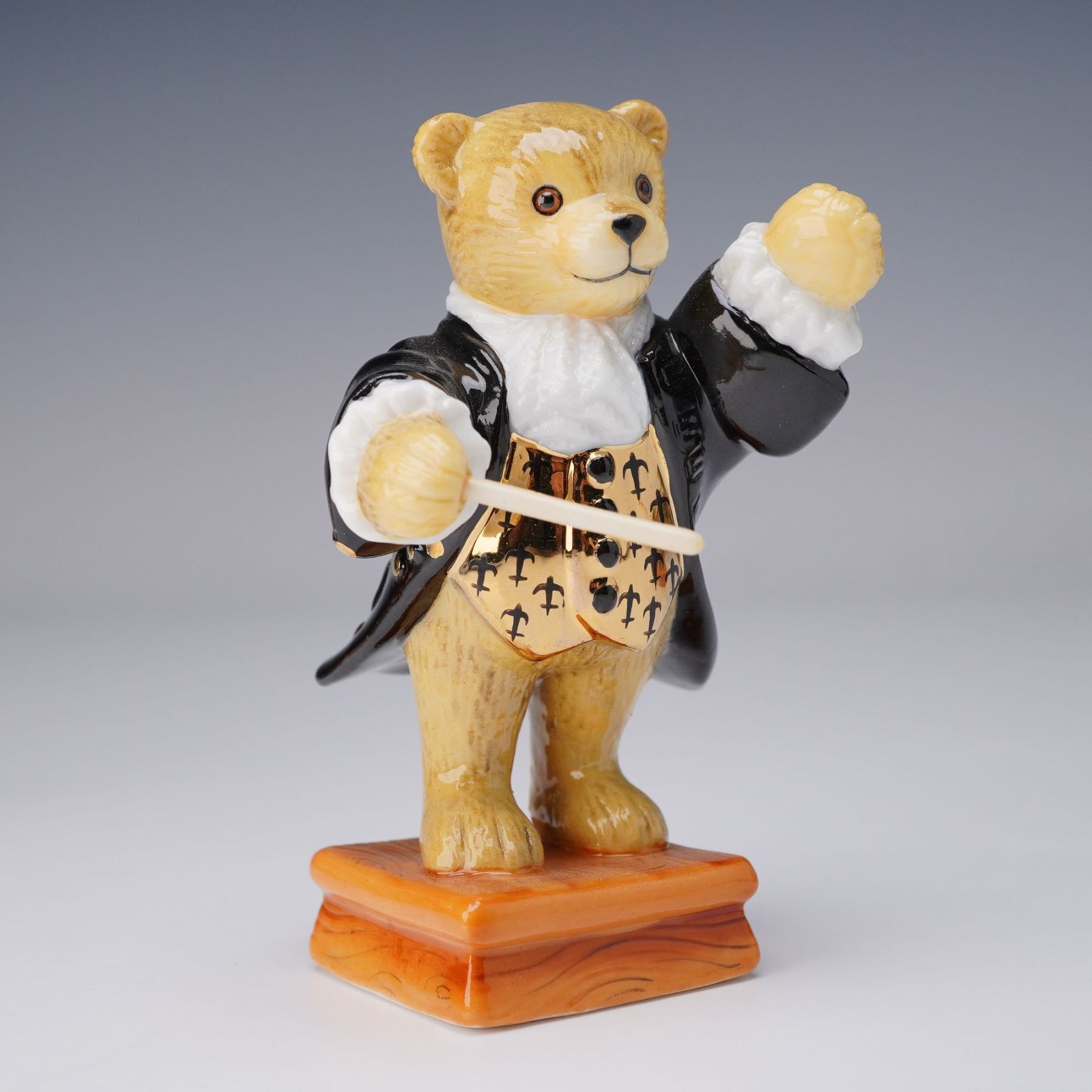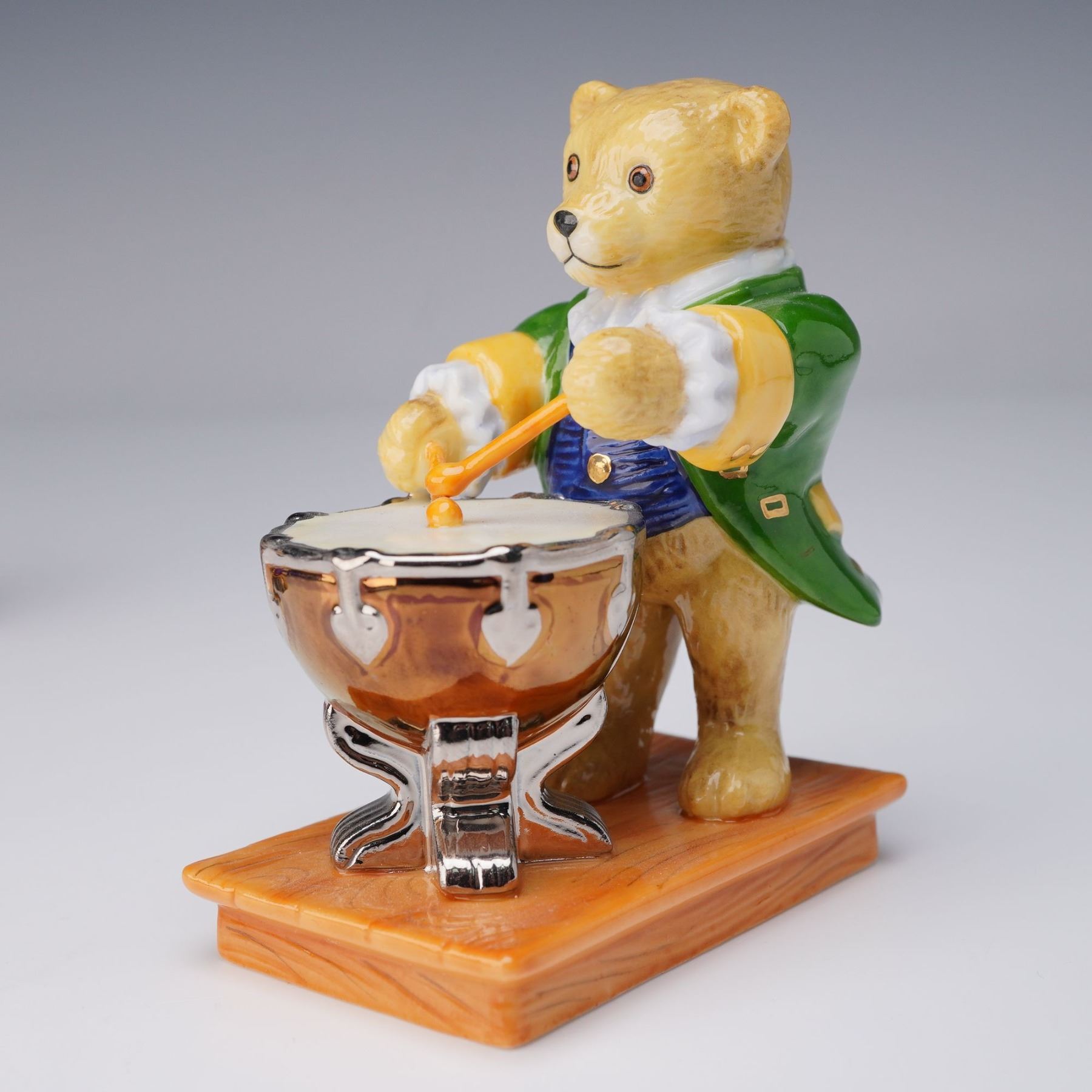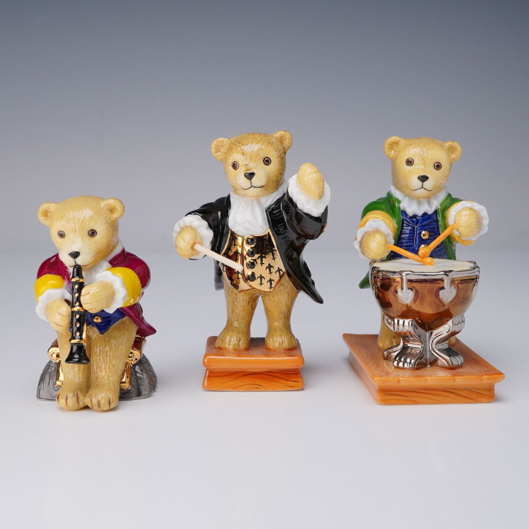 A charming trio of Halcyon Days porcelain figurines from the Musical Bears series, each finely hand-painted and detailed with gilt accents. Includes Lord Peregrine playing the Clarinet, Count Cornelius the Conductor, and Lord Archibald playing the Kettledrum. Each figure bears the Halcyon Days backstamp to the base and titled markings.
