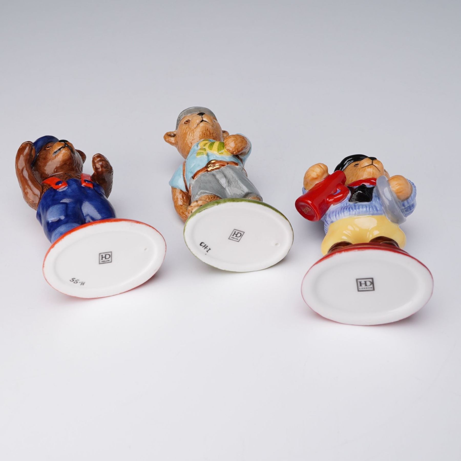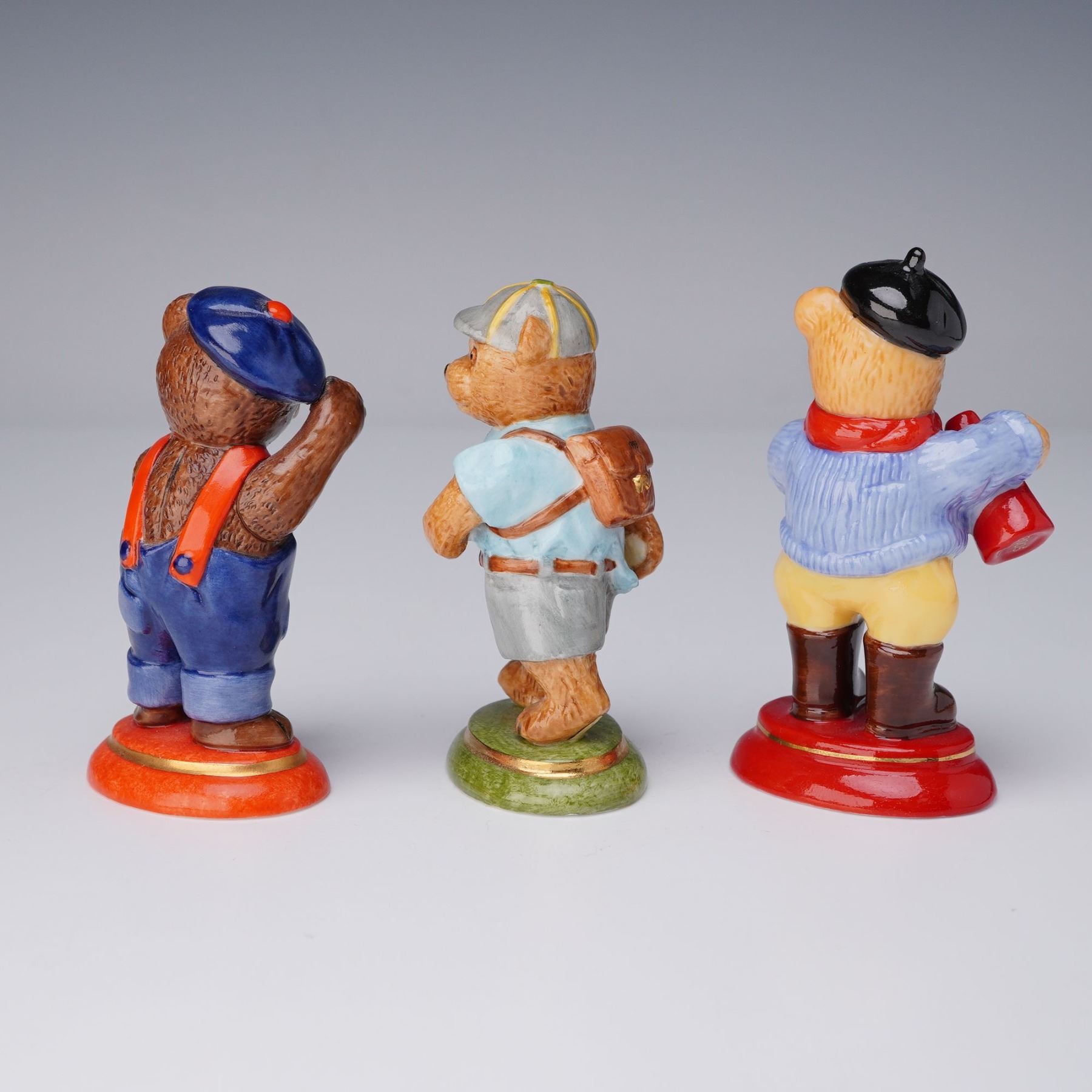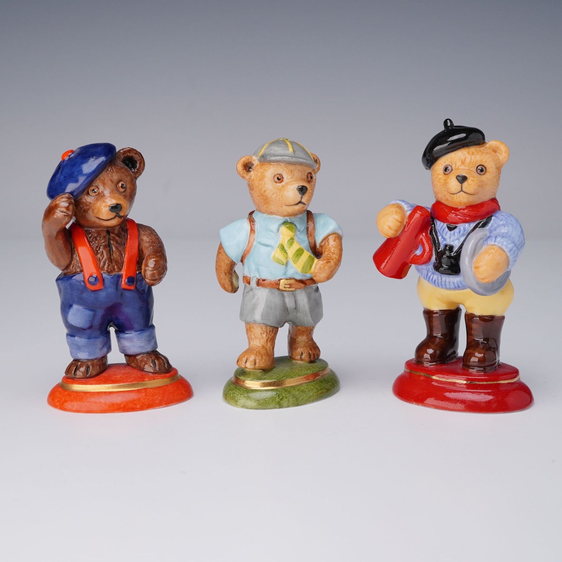 A charming trio of Halcyon Days teddy bear figurines, each finely hand-painted and crafted in England. The group includes Scout, dressed in pale blue shirt with yellow tie and grey shorts; Director, wearing yellow trousers, blue sweater, red scarf, and black beret while holding a red megaphone; and Blue Beret, in blue dungarees with red braces and navy beret. Each figure bears the Halcyon Days backstamp to the base.