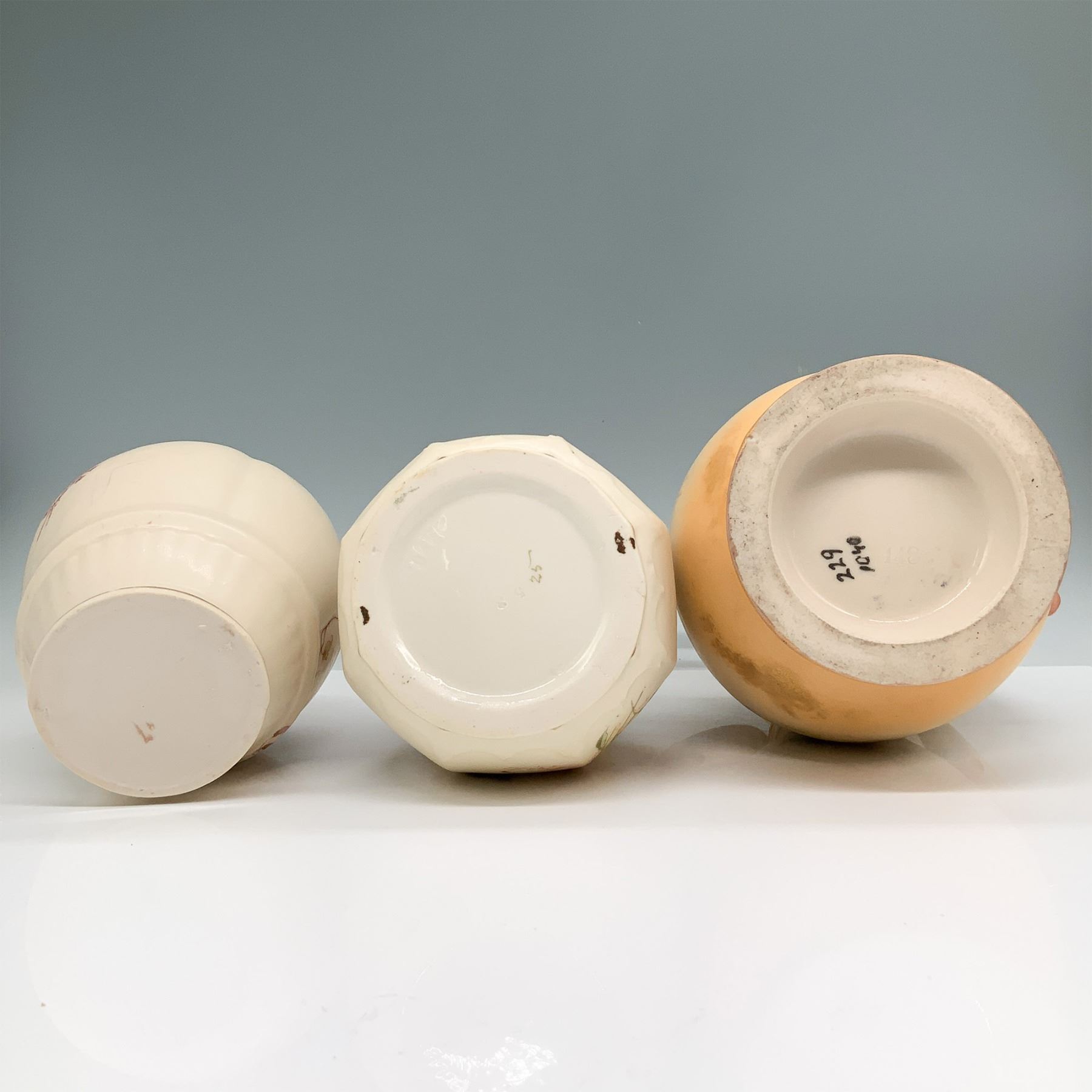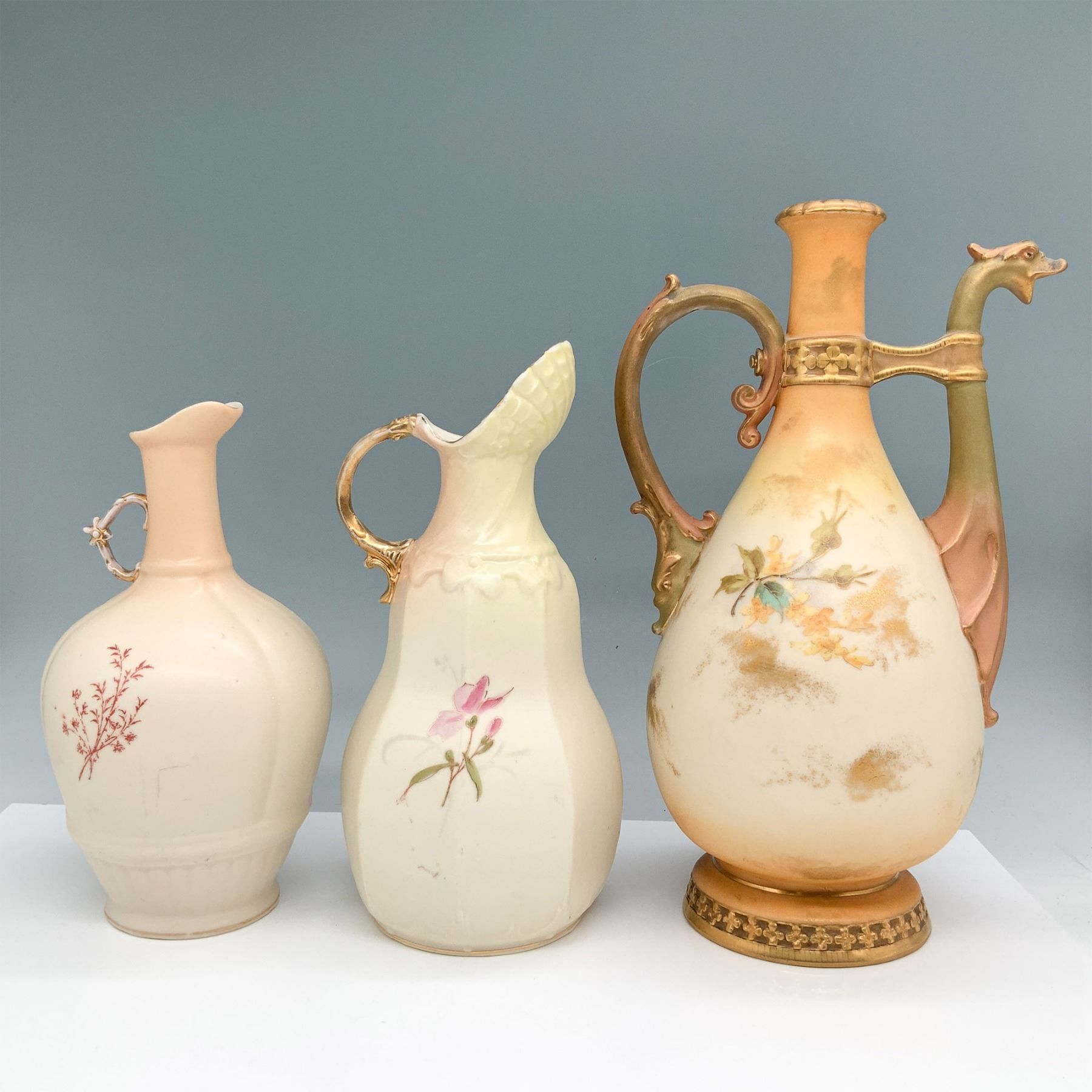 Description: Elegant three-piece set of hand-painted porcelain ewers, each showcasing unique floral motifs in soft pastel tones with gold accents. The set features intricate detailing, including ornate handles and a dragon-form handle on the largest ewer. The craftsmanship is highlighted by fine brushwork, delicate sculpted elements, and subtle shading that enhances the natural beauty of the floral designs. The bases are marked with numerical inscriptions. Largest item: 11"H.