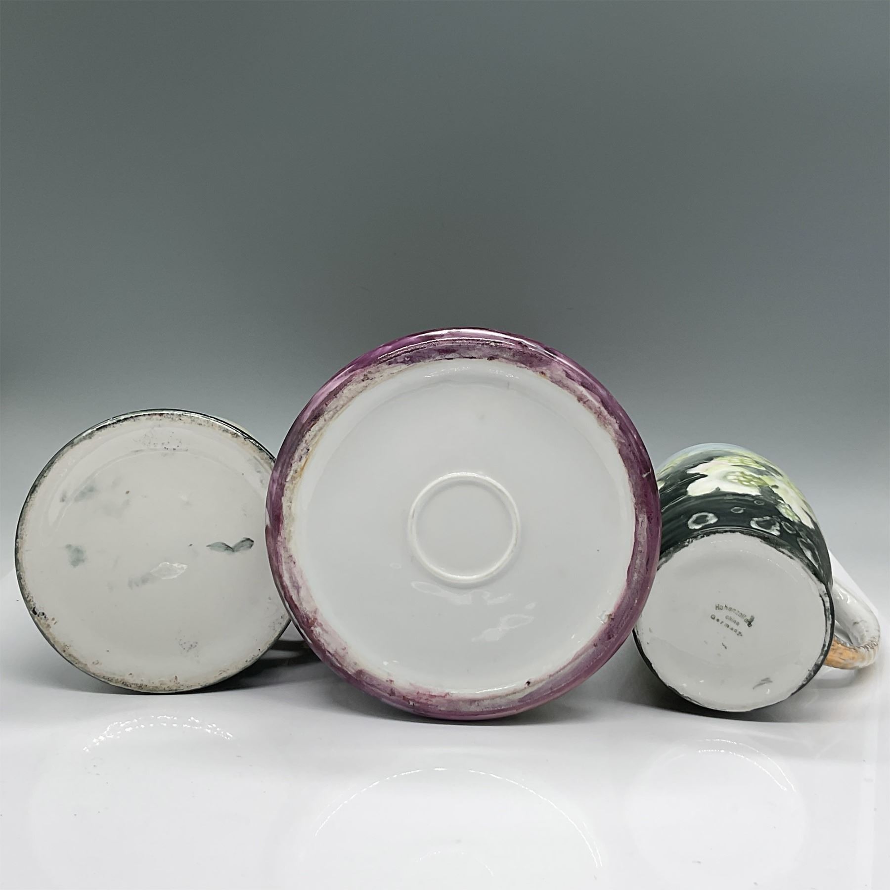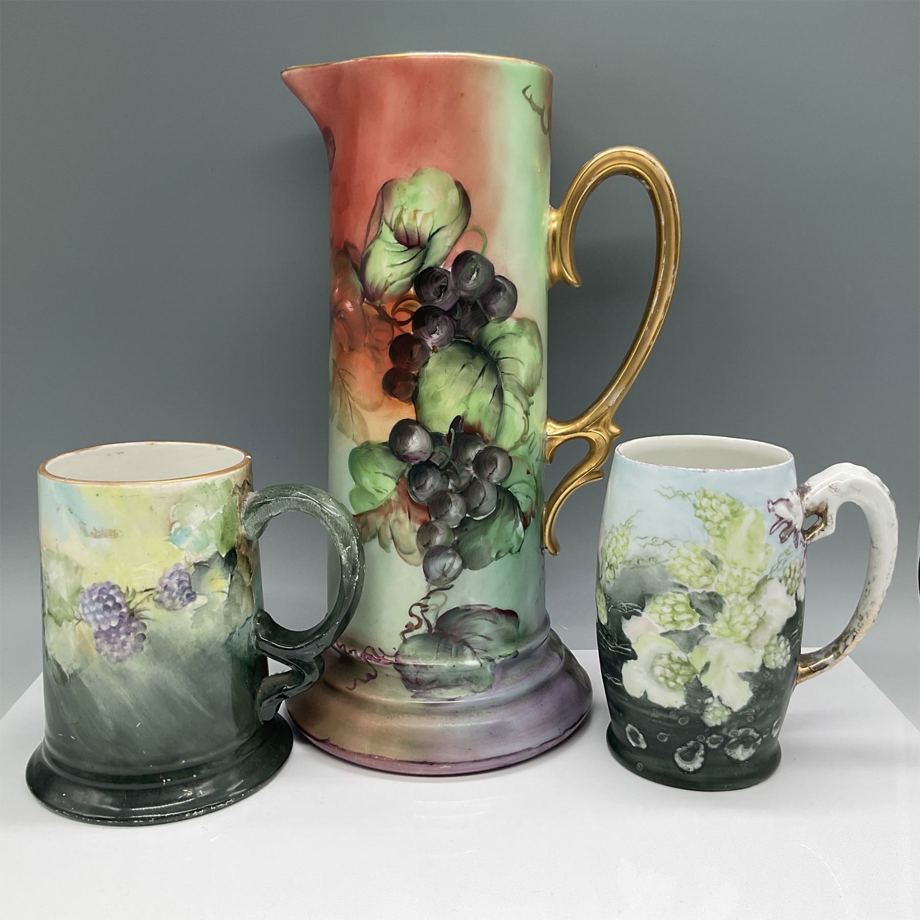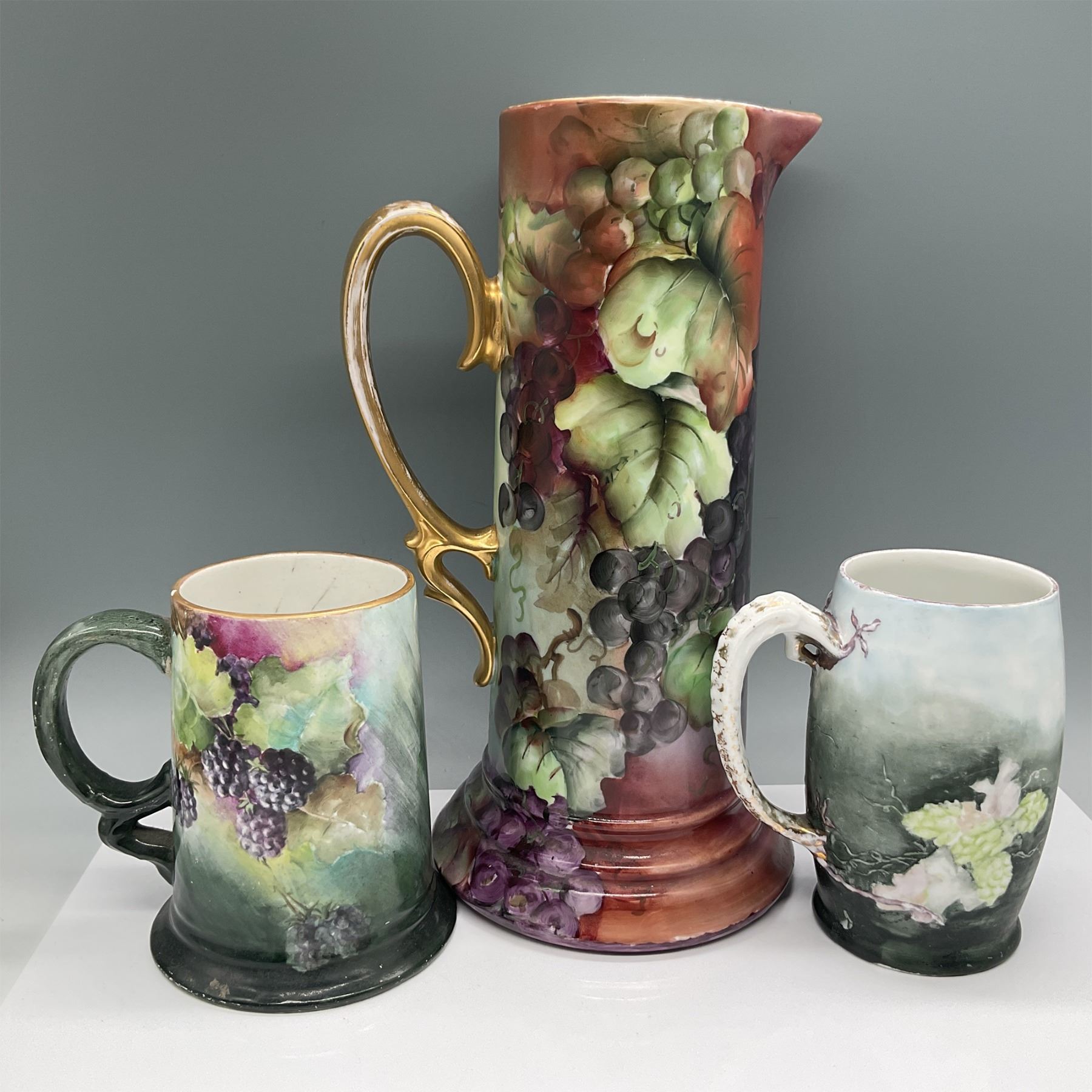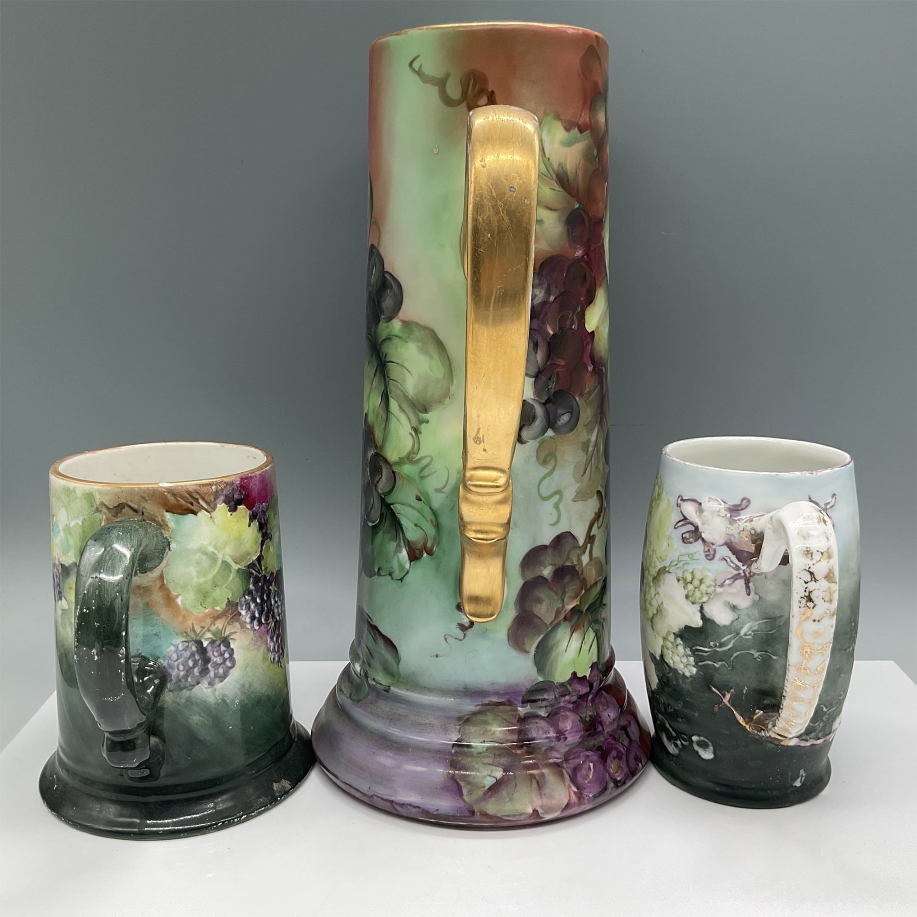 This lot includes a stunning 3-piece set featuring a tall tankard and two mugs, each adorned with vibrant hand-painted designs. The tankard, measuring 12.5"H, displays a lush grapevine motif with black and green grapes on a gradient background. The handle is gilded, adding a touch of elegance. The two mugs complement the set with blackberry and floral designs in rich, vivid colors, accented with unique handles. The base of one mug features a backstamp reading "Hand Painted Nippon." These pieces are perfect for collectors or as a centerpiece for any display.