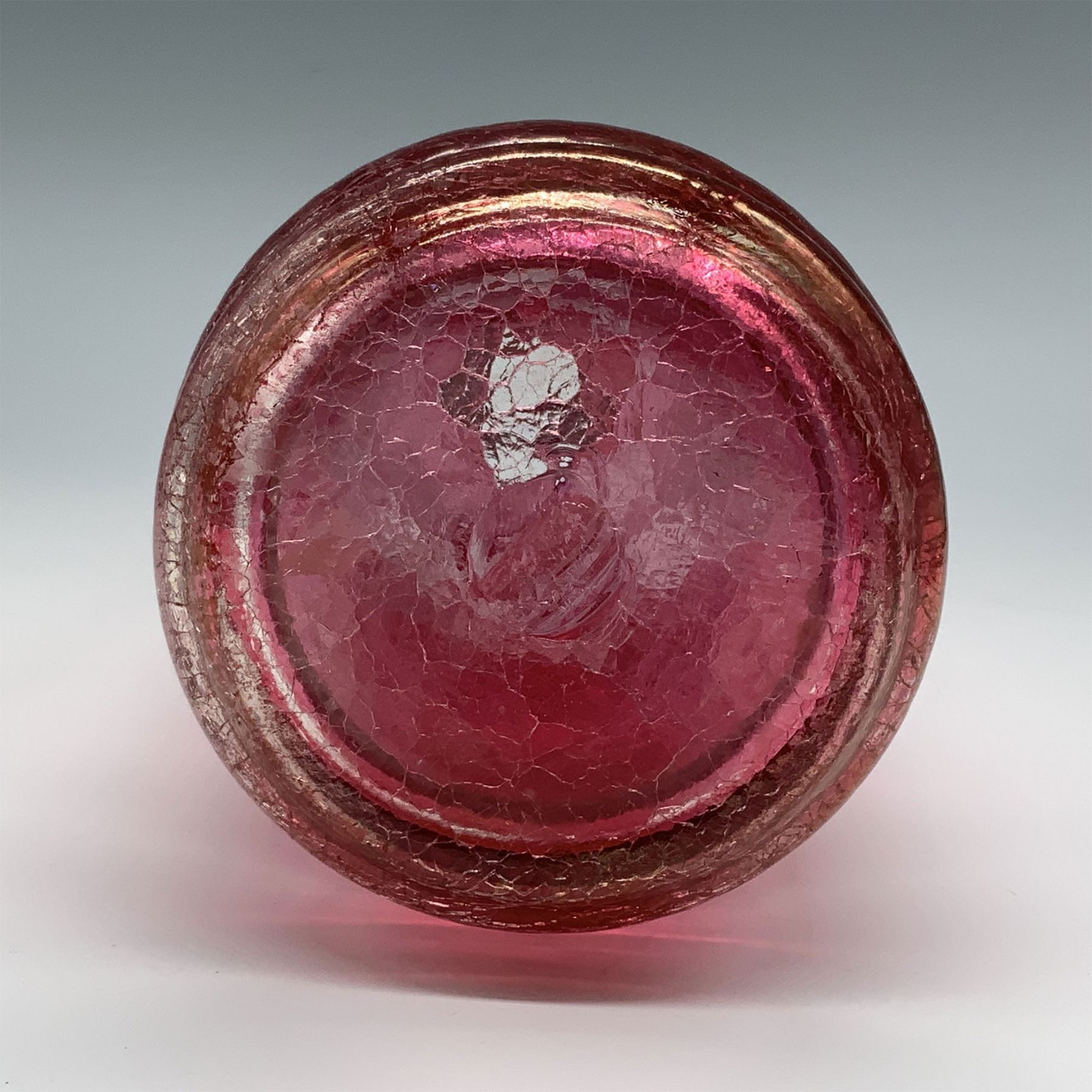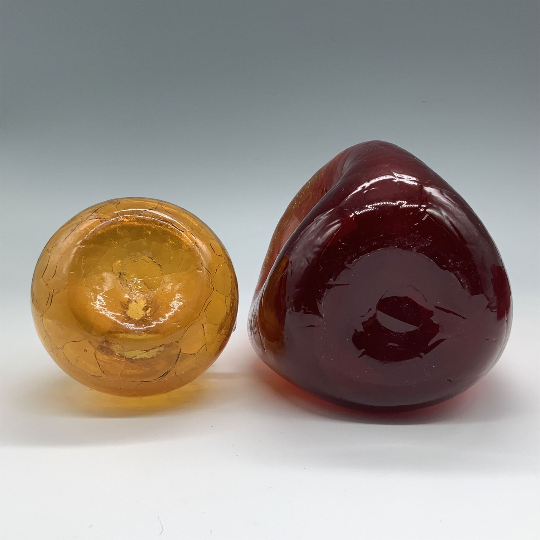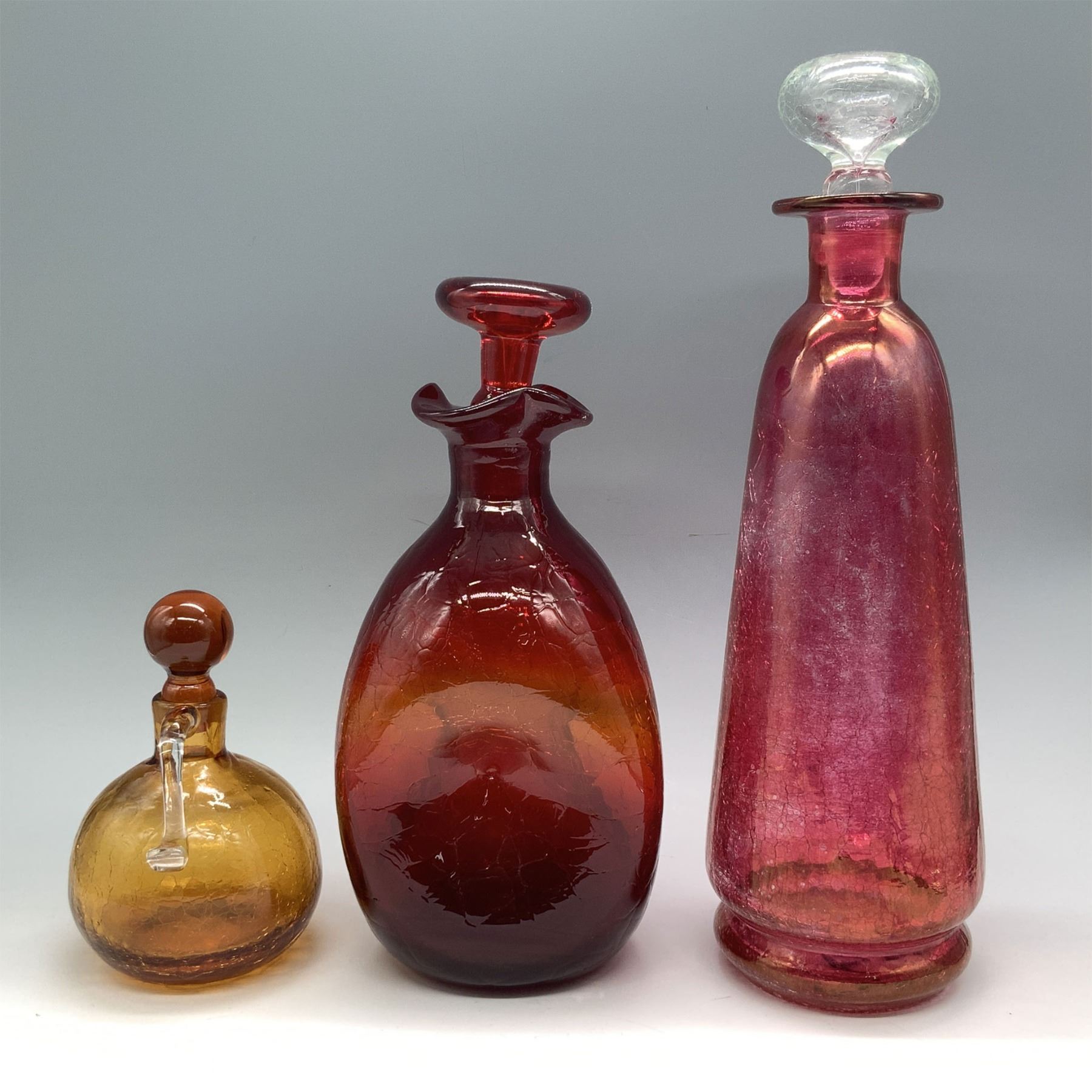 A striking set of three handblown multicolor glass decanters. The collection includes a small amber-toned decanter with a round stopper, a tall pinkish-red decanter with a glass stopper, and a medium-sized red decanter with a flared rim. The vibrant multicolor hues give these decanters an artisanal quality. Perfect for collectors of unique glassware, these pieces showcase exceptional craftsmanship. Tallest item: 13.25"H.