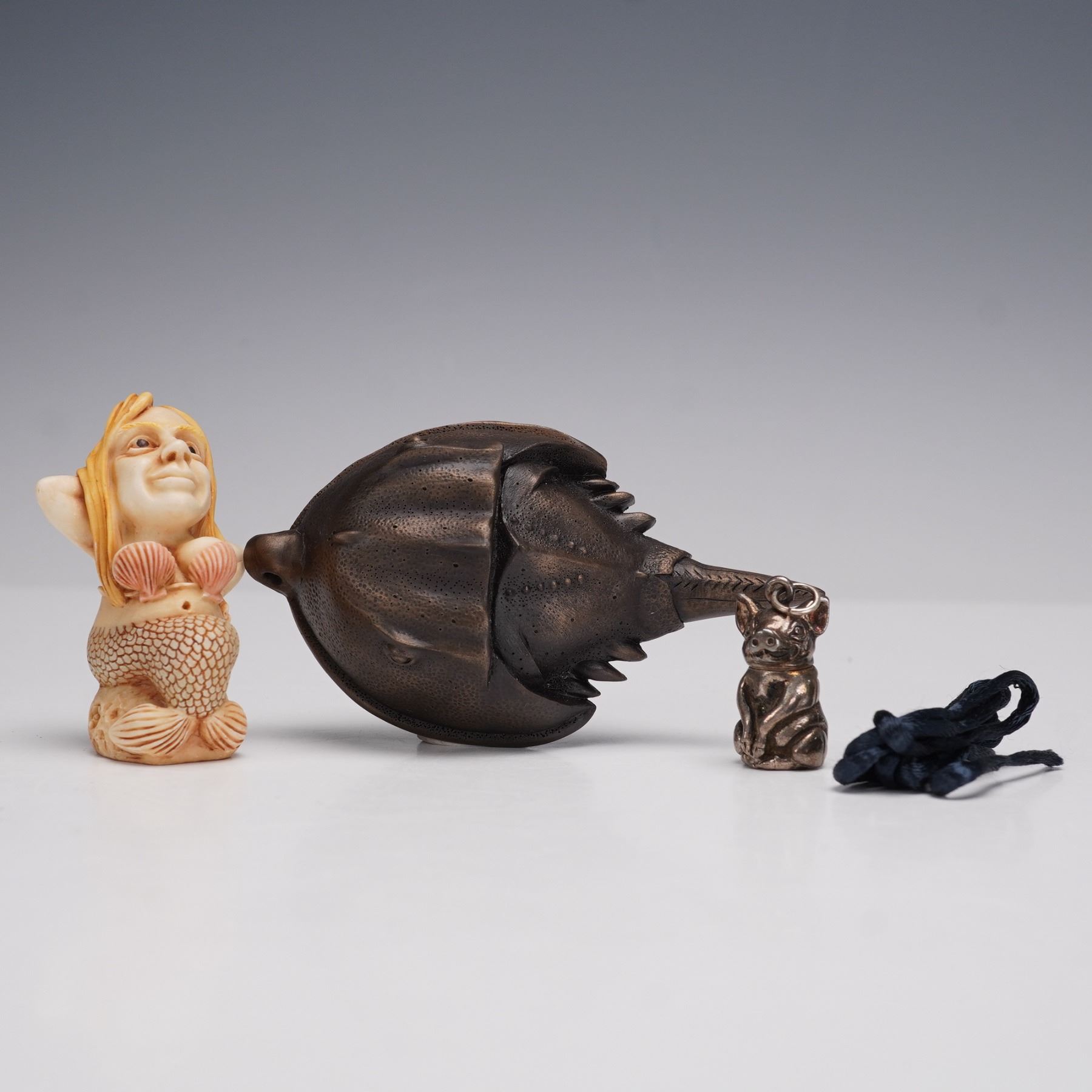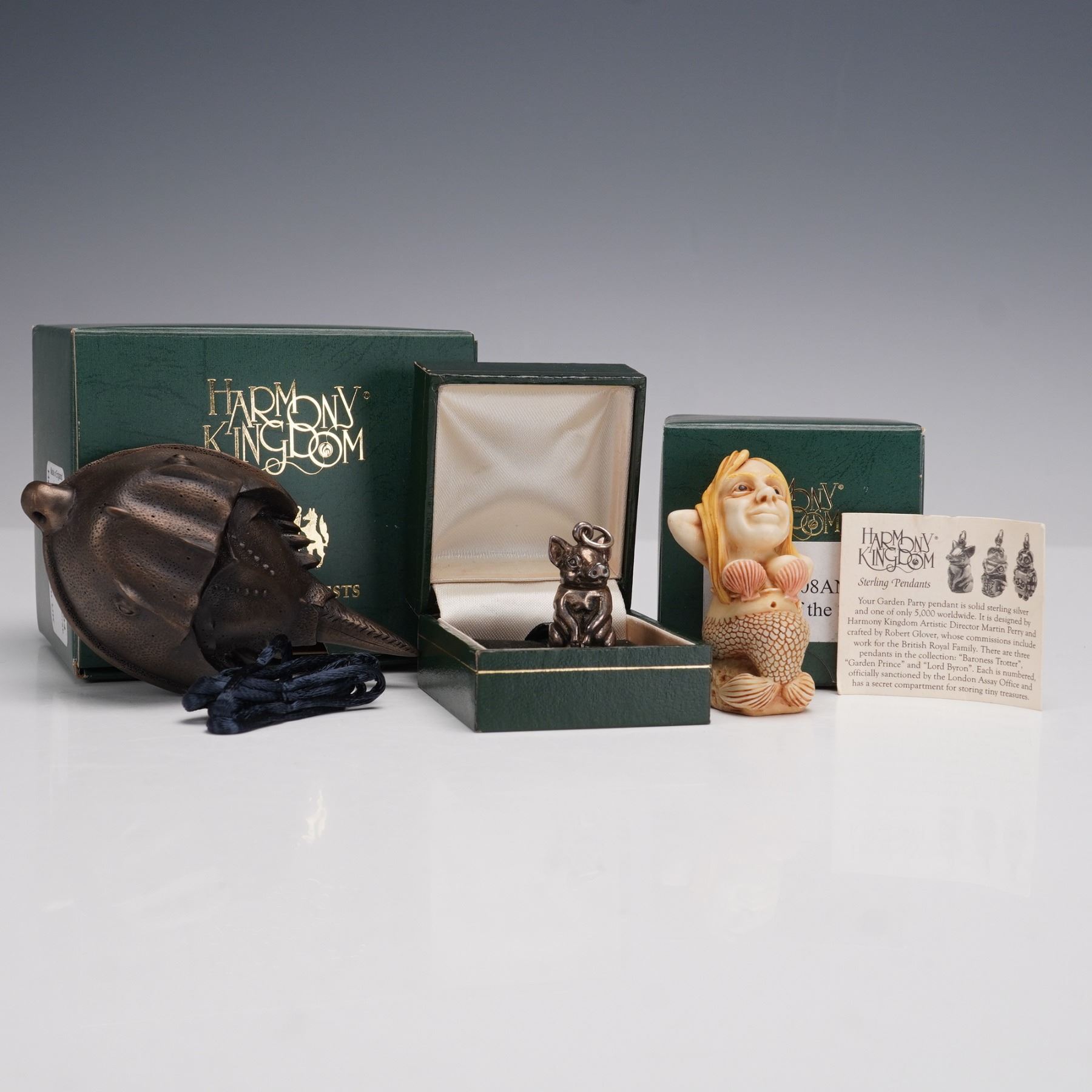 A three-piece Harmony Kingdom lot including Horseshoe Crab, signed by artist Dan Kritzer with original cord, Andrea of the Sea, signed by artist Andrea Pater, and a sterling silver pig pendant. All pieces retain original Harmony Kingdom boxes and inserts. Sterling pig pendant gross weight 0.3 oz.