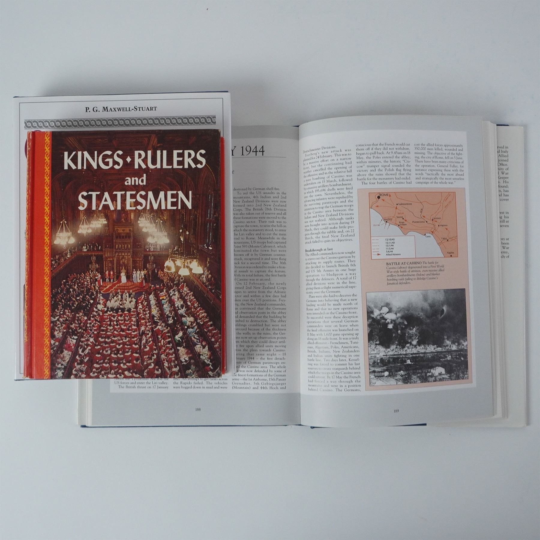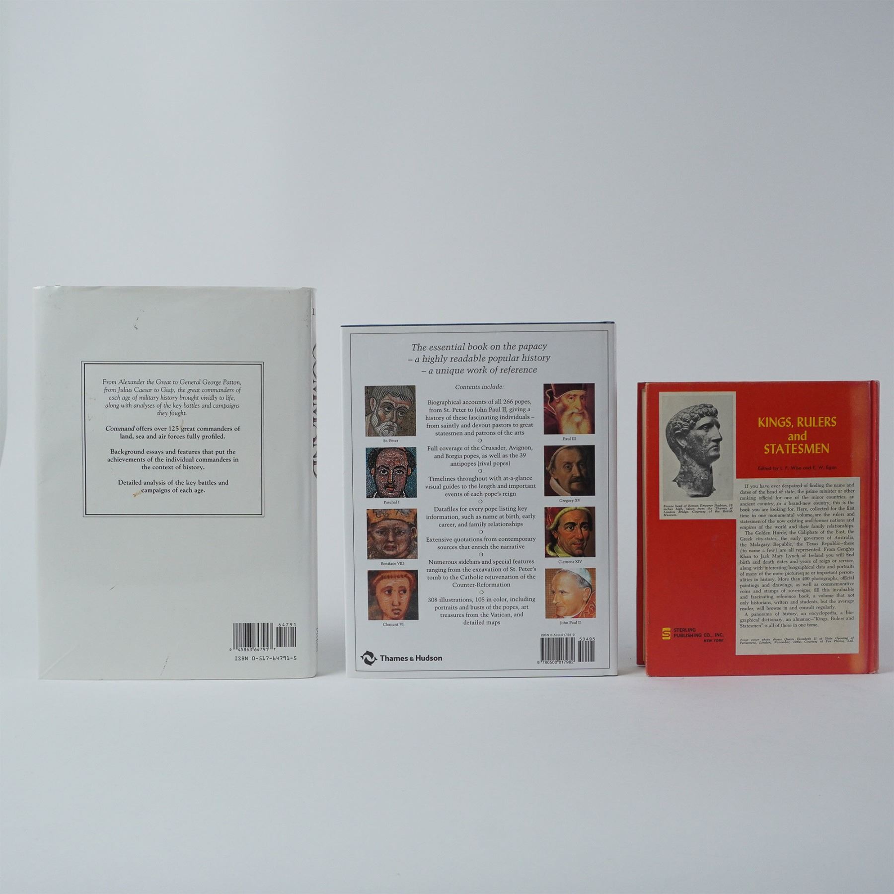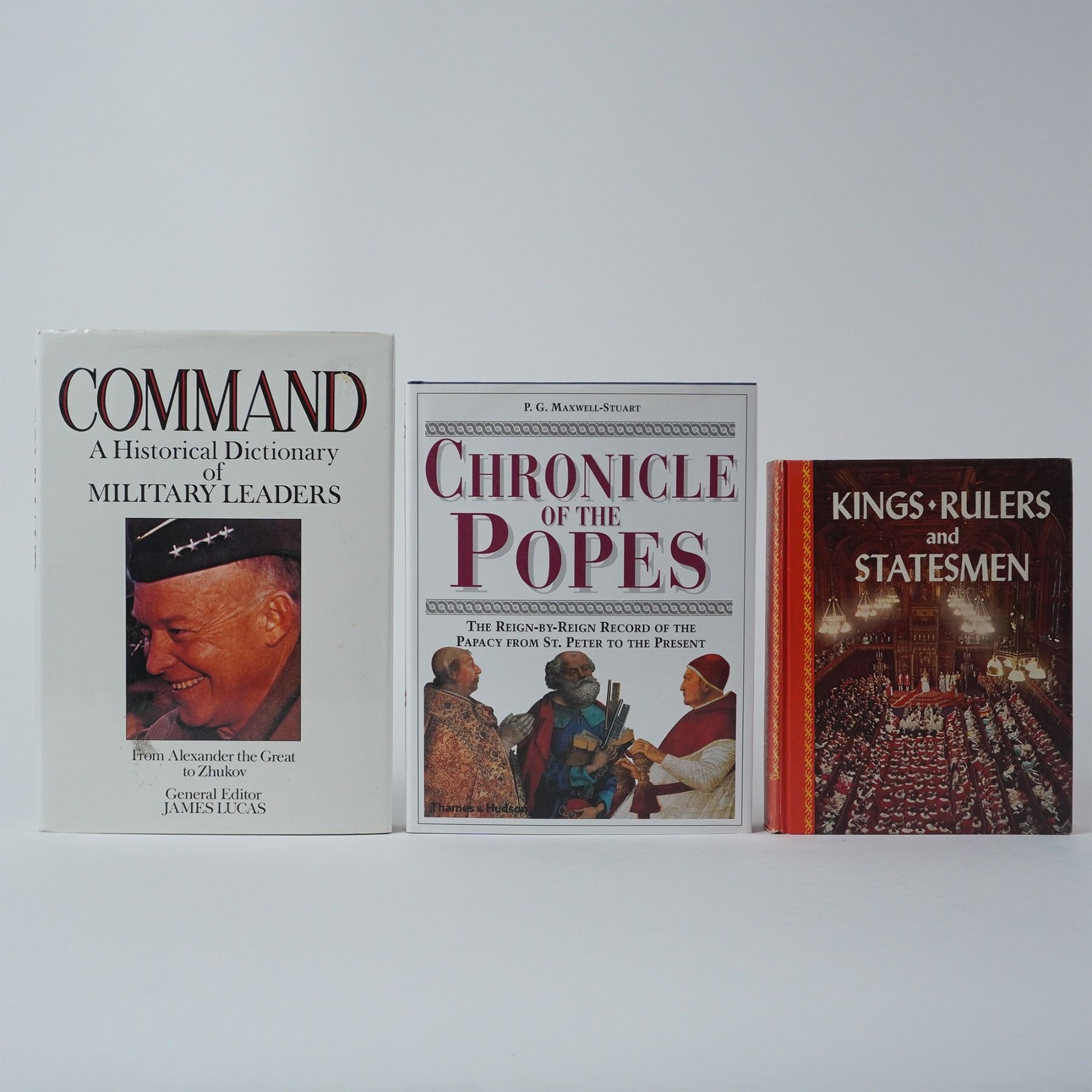 This collection of three hardcover books explores the lives and legacies of influential leaders throughout history. Command: A Historical Dictionary of Military Leaders by James Lucas examines the strategic minds of great military commanders from Alexander the Great to Zhukov. Chronicle of the Popes by F.G. Maxwell-Stuart provides a detailed reign-by-reign account of the papacy from St. Peter to the present. Kings, Rulers, and Statesmen presents a visual and historical journey through the reigns of monarchs and political figures worldwide. A must-have collection for history enthusiasts, scholars, and collectors of political and religious history. Largest book measures 11.25"H.
