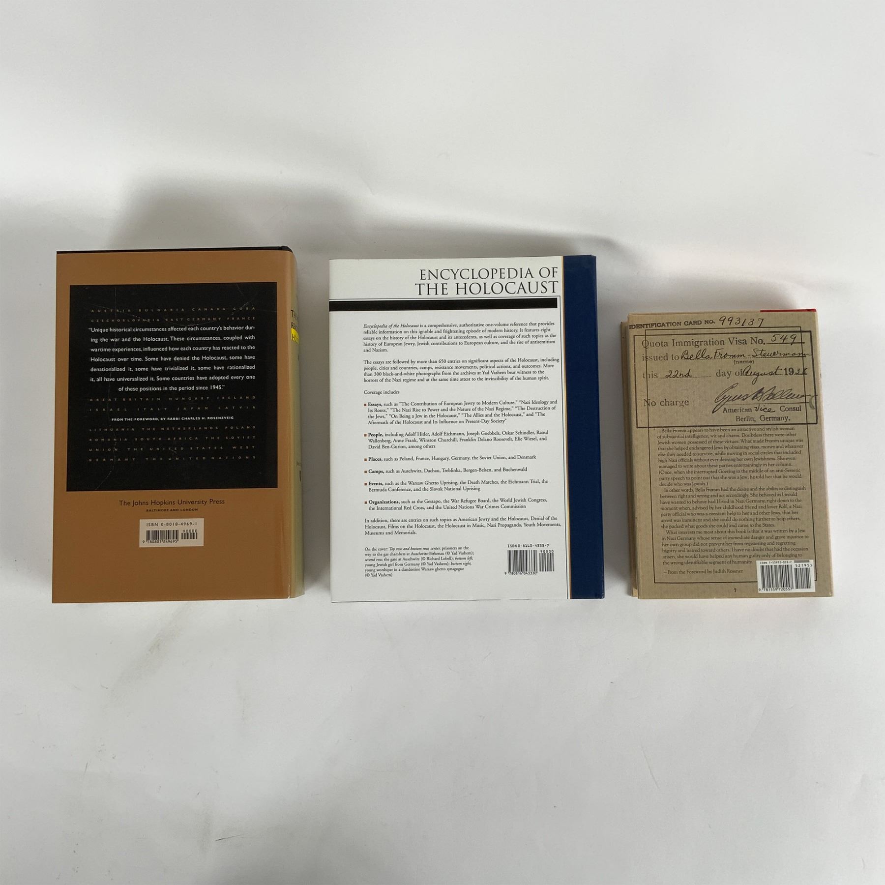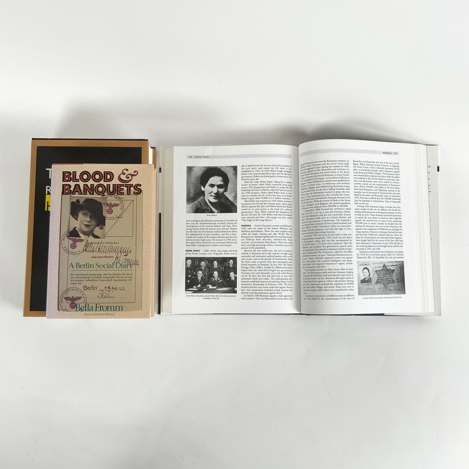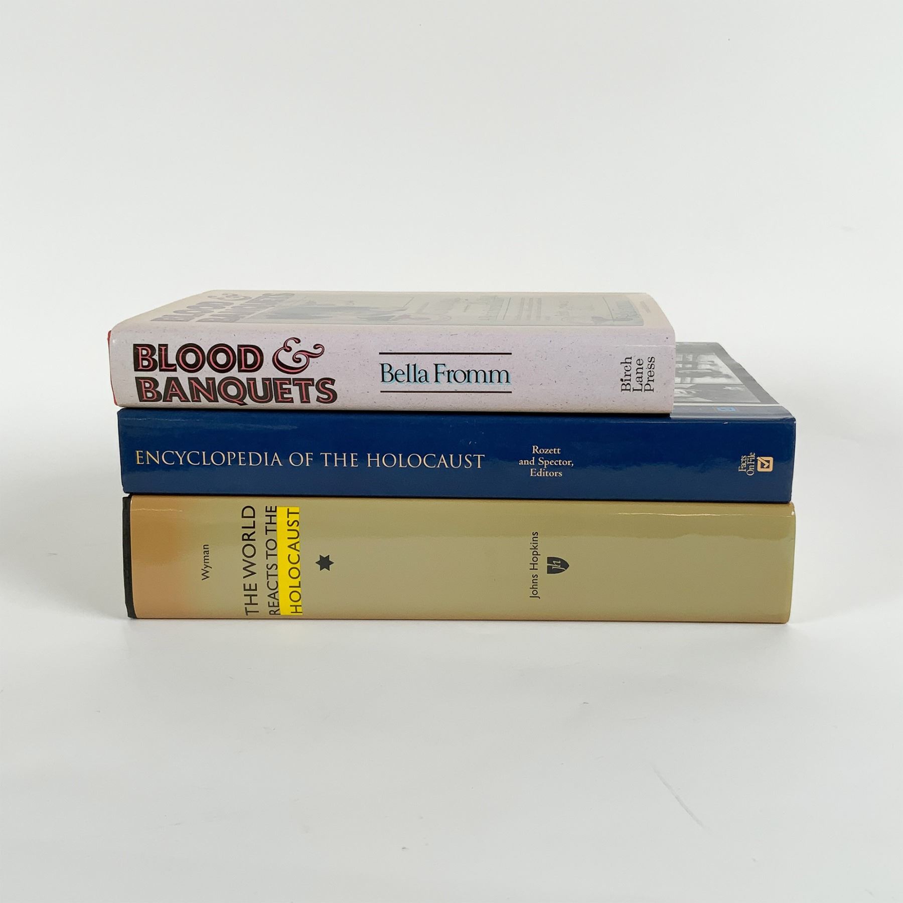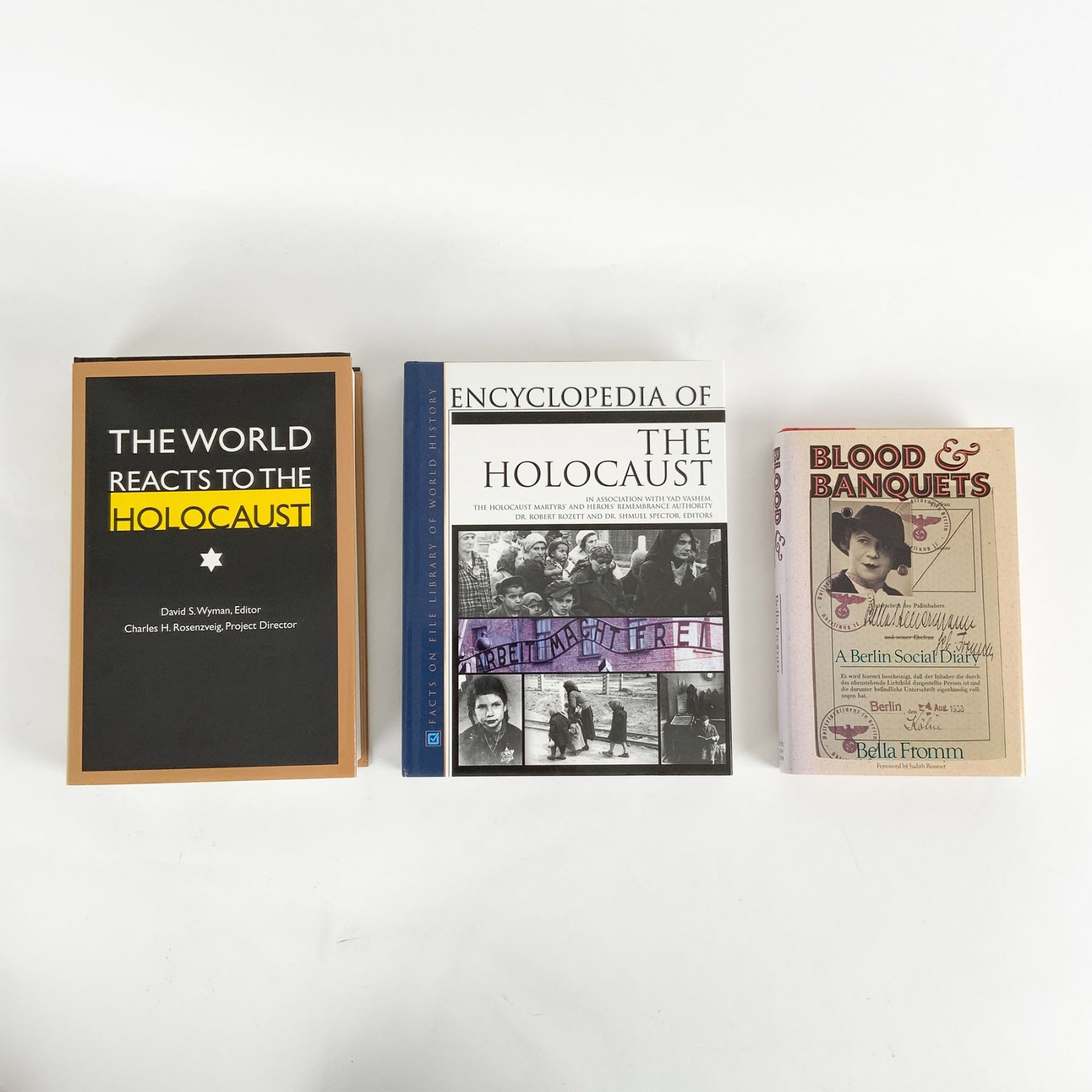 A collection of three hardcover books on Holocaust history and analysis, offering valuable insights into the events, global reactions, and personal narratives from this period. Includes Blood & Banquets by Bella Fromm, The World Reacts to the Holocaust by Wyman (Johns Hopkins University Press), and Encyclopedia of the Holocaust, edited by Rozett and Spector. These works provide extensive historical documentation, survivor accounts, and scholarly perspectives. Largest book measures 11.25"H.