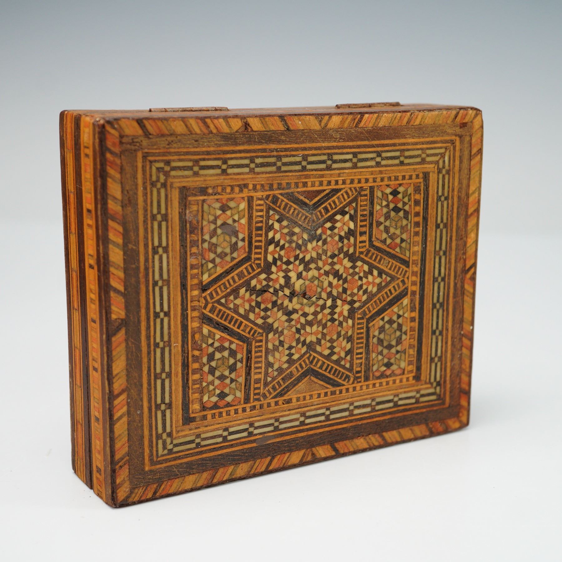 Decorative boxes including a Middle Eastern style marquetry inlaid wood box featuring a geometric star pattern composed of multicolored veneers, a brightly enameled metal box with red, black, and turquoise decoration accented with stylized floral and geometric motifs, and a simple handcrafted wooden box with hinged lid and plain surfaces. Each piece displays a distinct cultural and artistic tradition, with the inlaid example reflecting intricate craftsmanship, the enamel box showcasing vibrant color and design, and the plain wooden box embodying utilitarian charm.