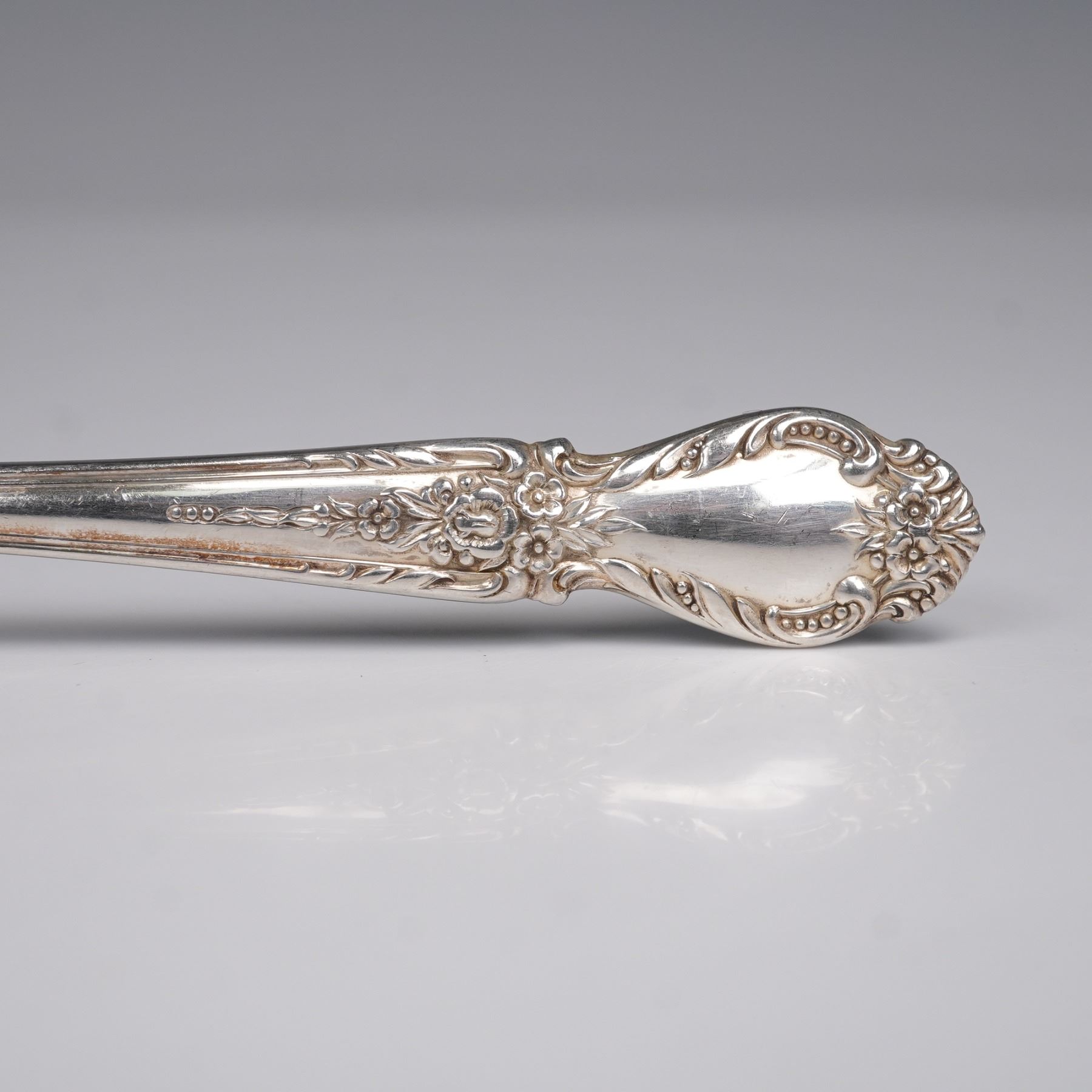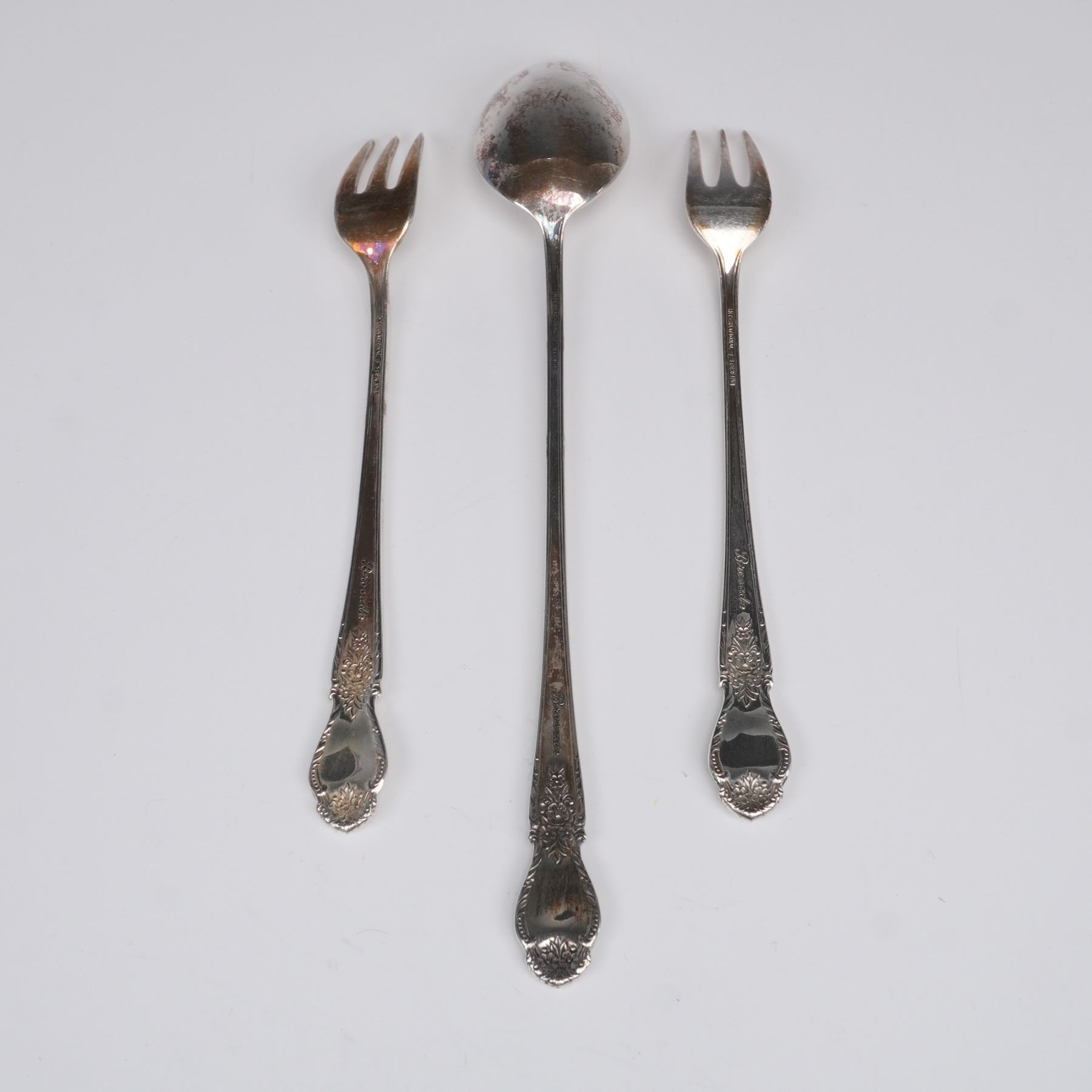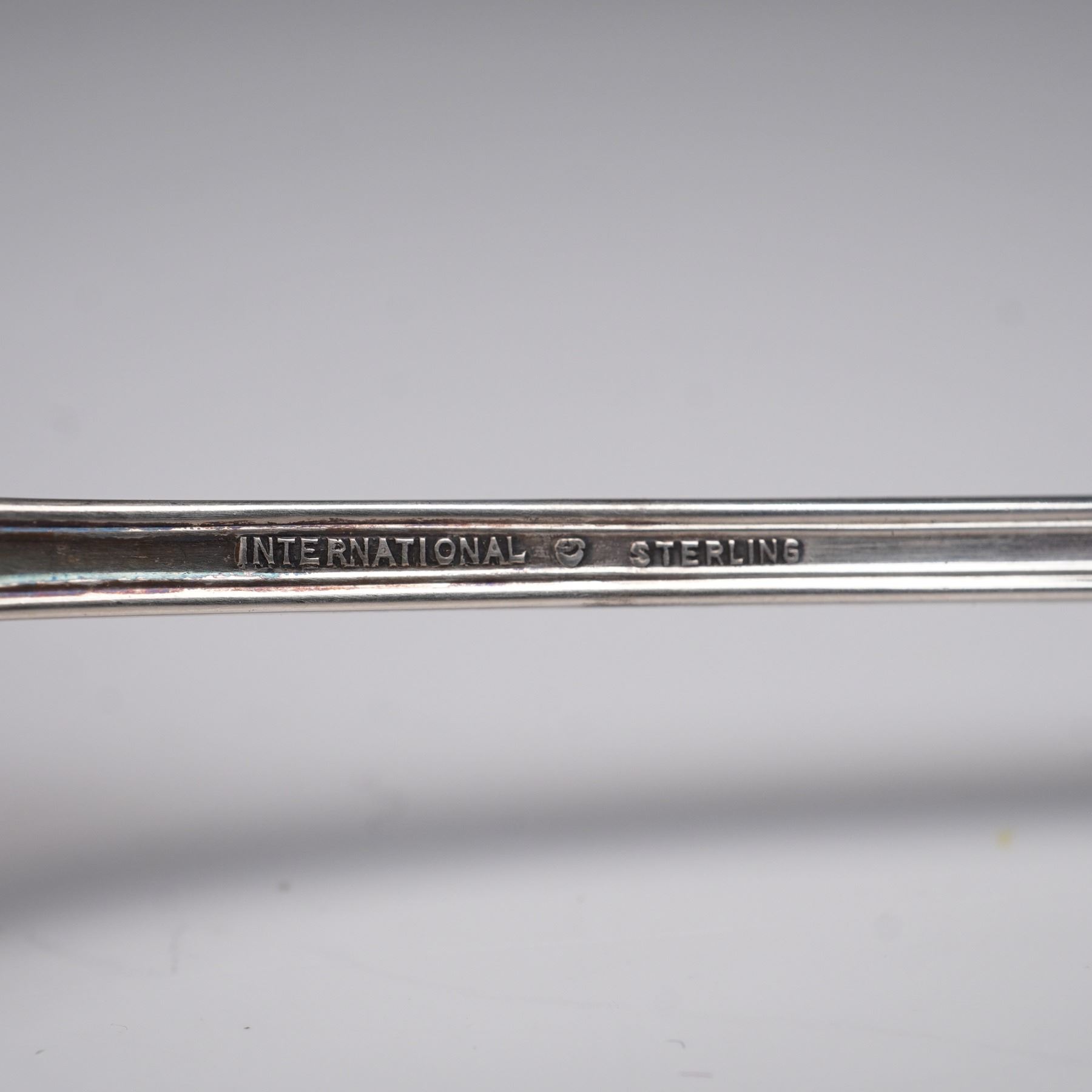 Set of three International Sterling silver flatware pieces in the Brocade pattern, introduced in 1950. The lot includes one iced tea spoon and two cocktail/seafood forks, each decorated with the elegant floral and scroll motif that defines this mid-century design. All pieces are marked International Sterling on the reverse. A refined addition to a Brocade flatware service. Net silver 2.1 troy oz.