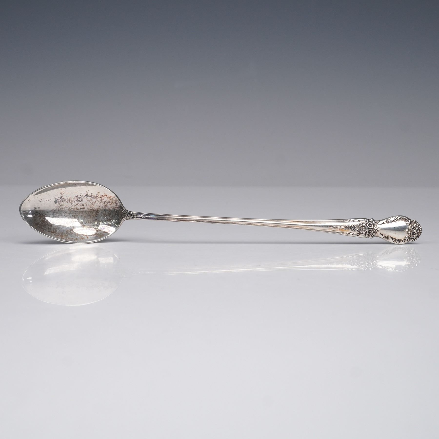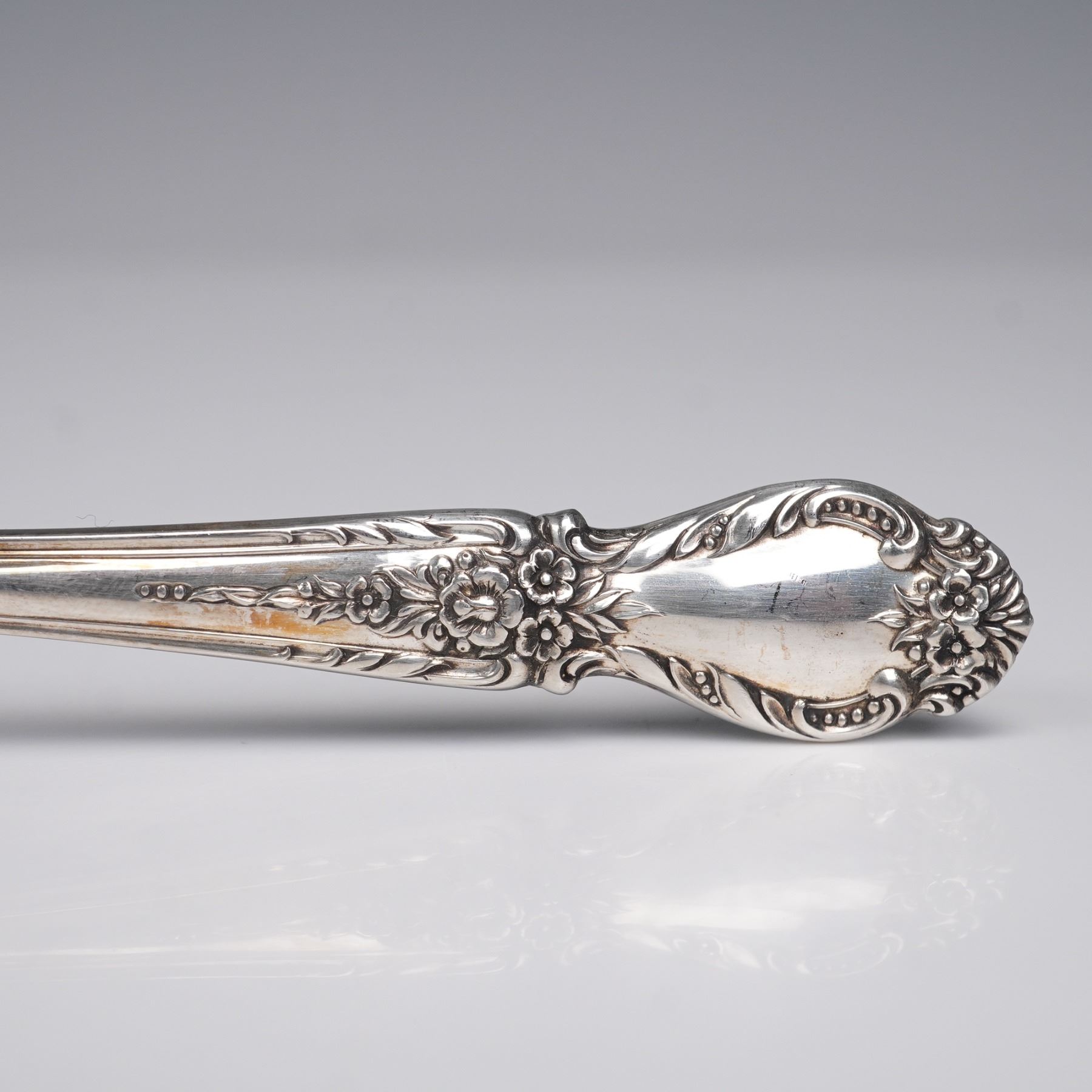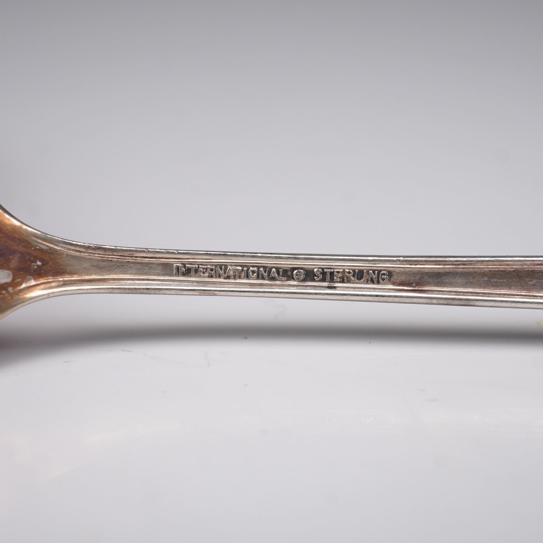 Set of three International Sterling silver flatware pieces in the Brocade pattern, introduced in 1950. The lot includes one iced tea spoon and two cocktail/seafood forks, each decorated with the elegant floral and scroll motif that defines this mid-century design. All pieces are marked International Sterling on the reverse. A refined addition to a Brocade flatware service. Net silver 2.1 troy oz.