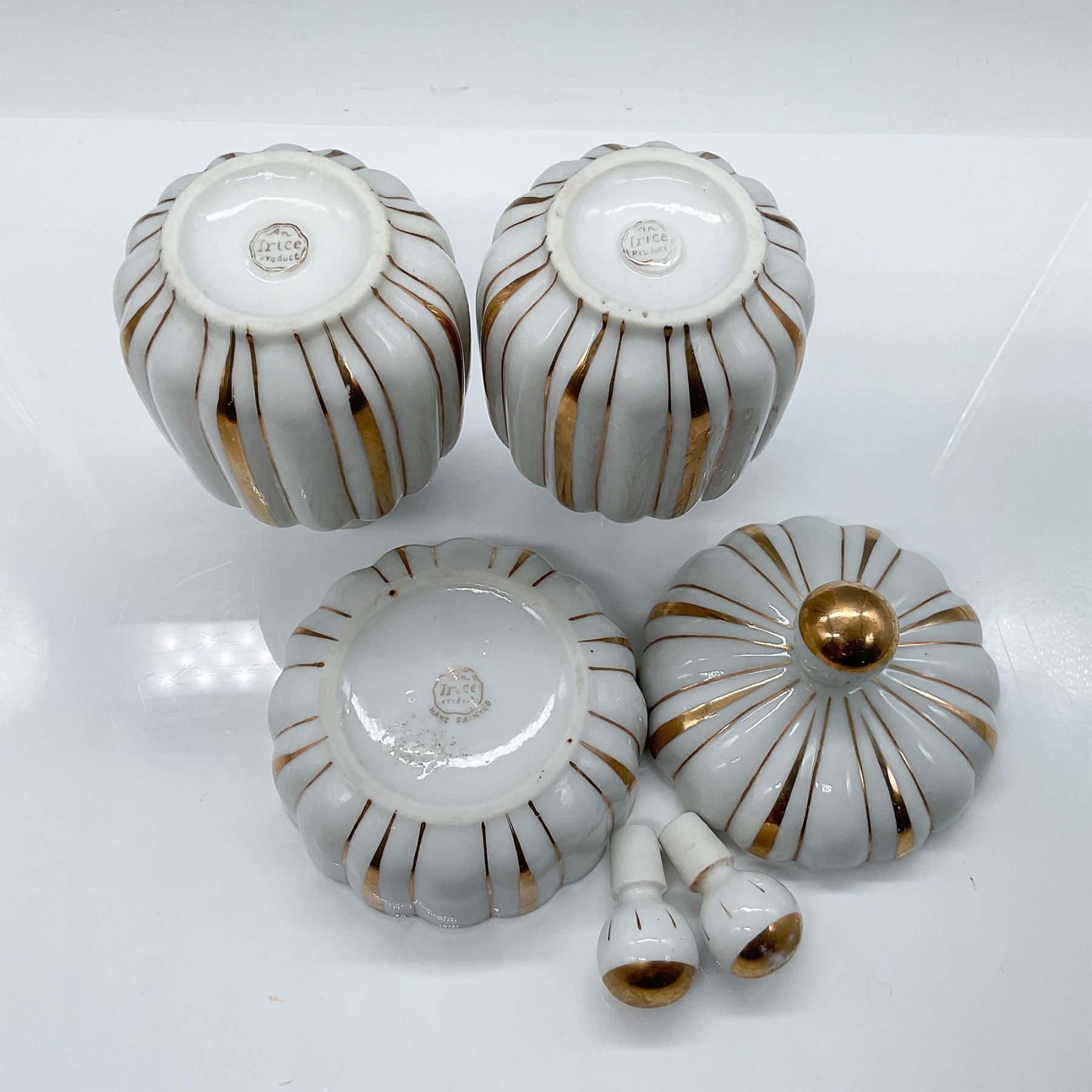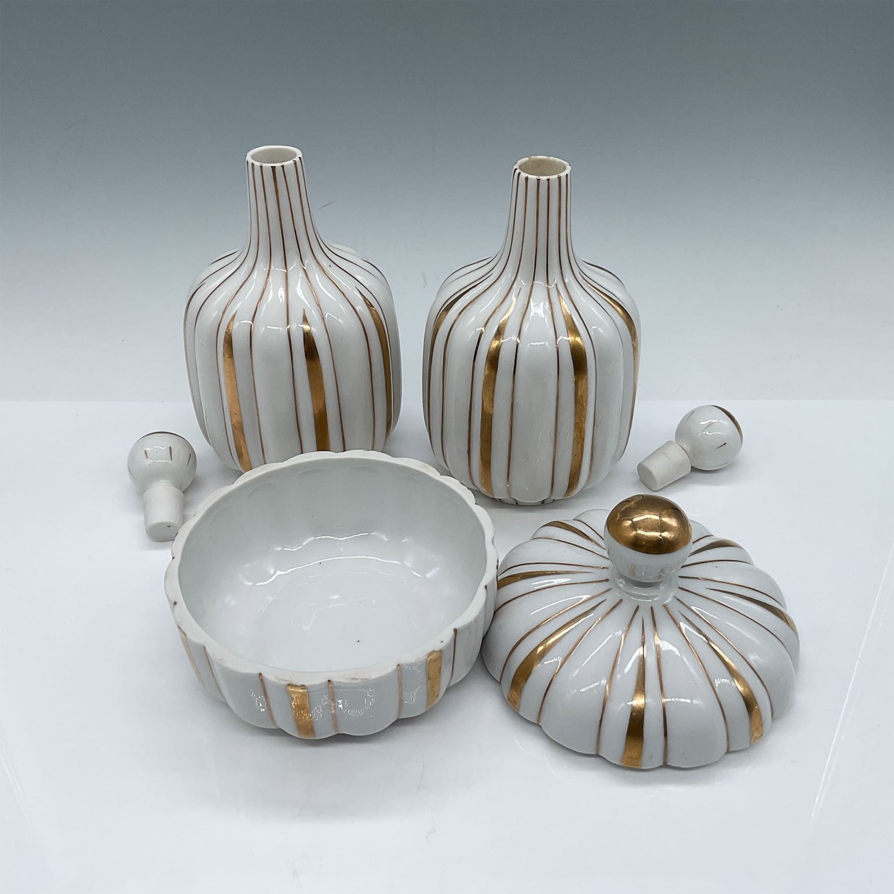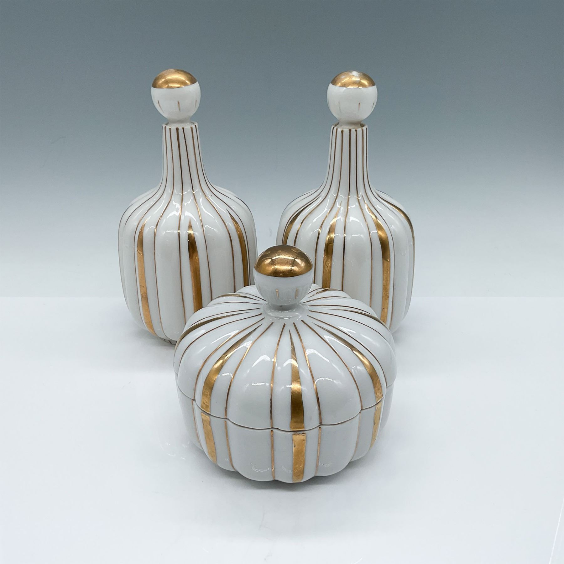 A set of three matching Irice ceramic pieces featuring elegant gilded gold accents on white. Includes two bottles with stoppers, each standing 6"H, and a lidded box with a pumpkin-shaped design. Marked on the bases, "An Irice Product." A charming addition to vintage décor collections or vanity sets.