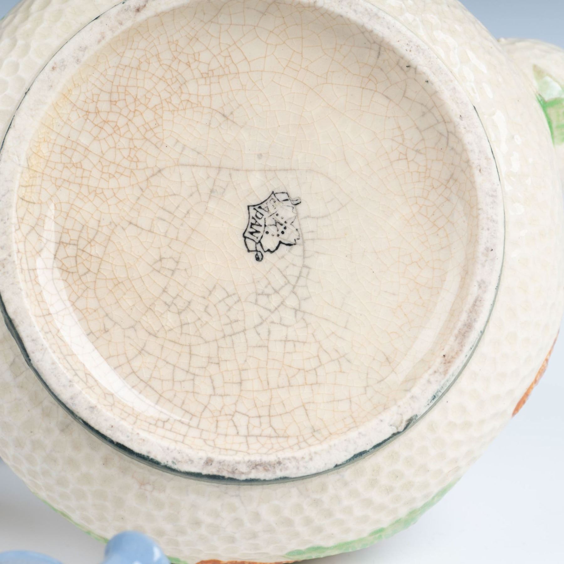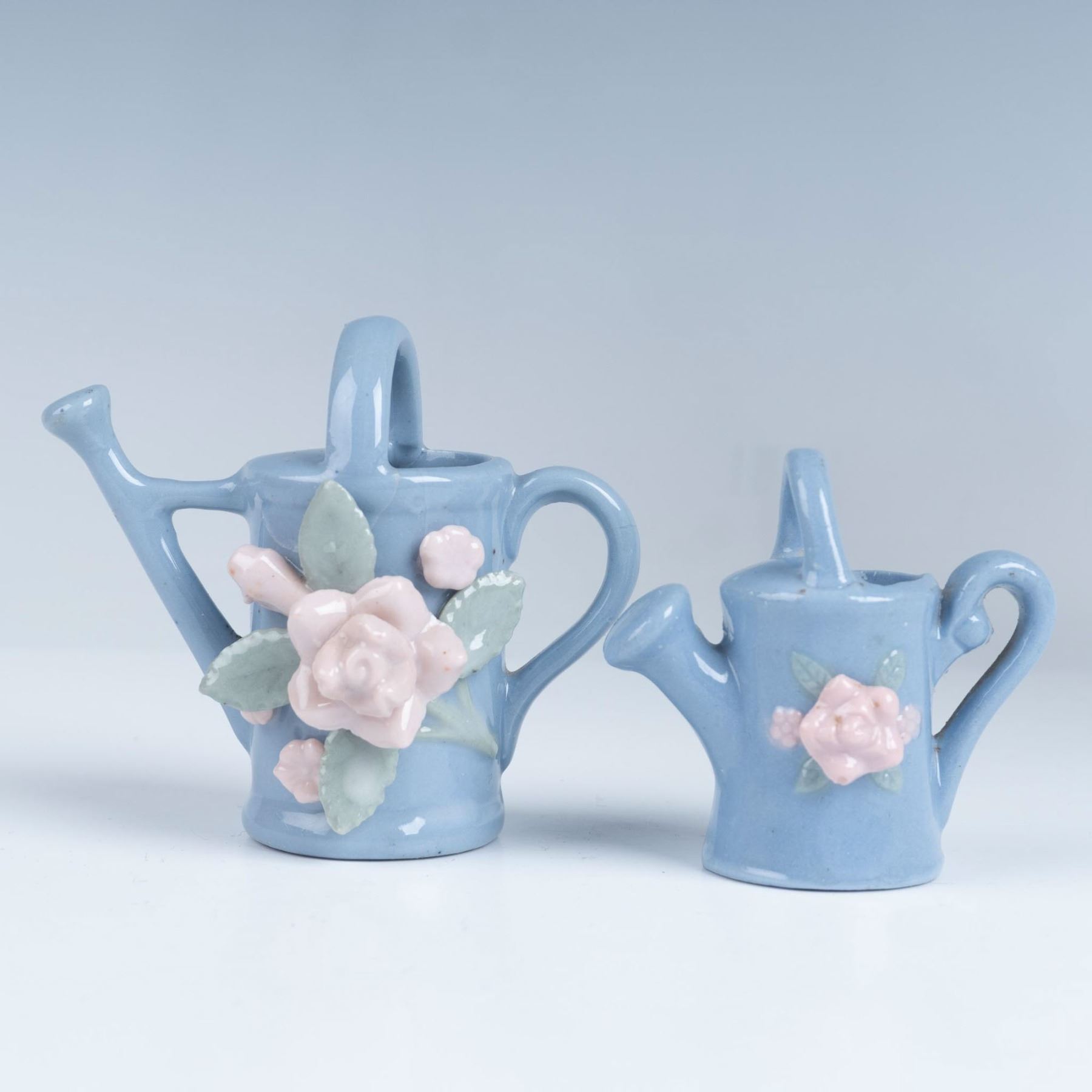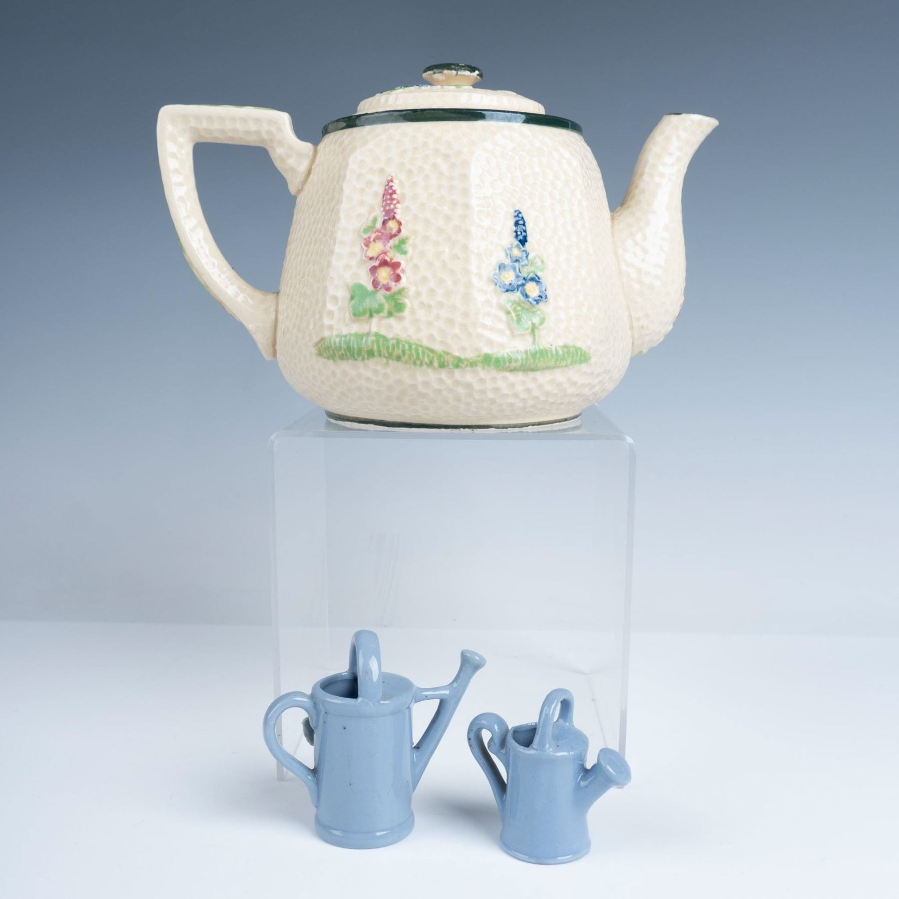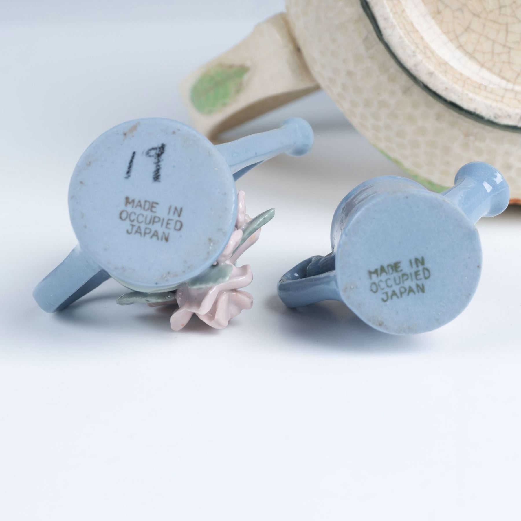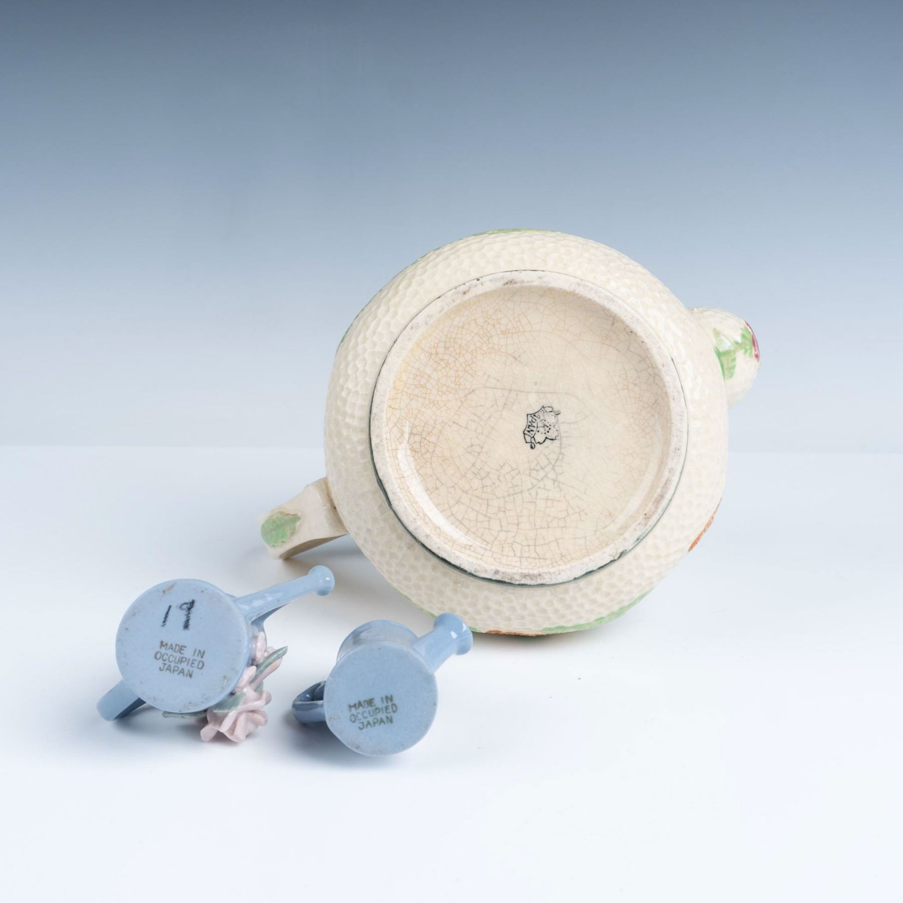 This delightful set includes a teapot featuring a honeycomb texture and adorned with flowers, accompanied by two mini watering jugs with applied pink roses. Japan K backstamp on teapot. Made in Occupied Japan marking on the watering cans, indicating that they were produced in Japan during the Allied occupation following World War II, specifically between 1945 and 1952. Largest (Teapot): 8.25"L x 5.5"W x 5"H.