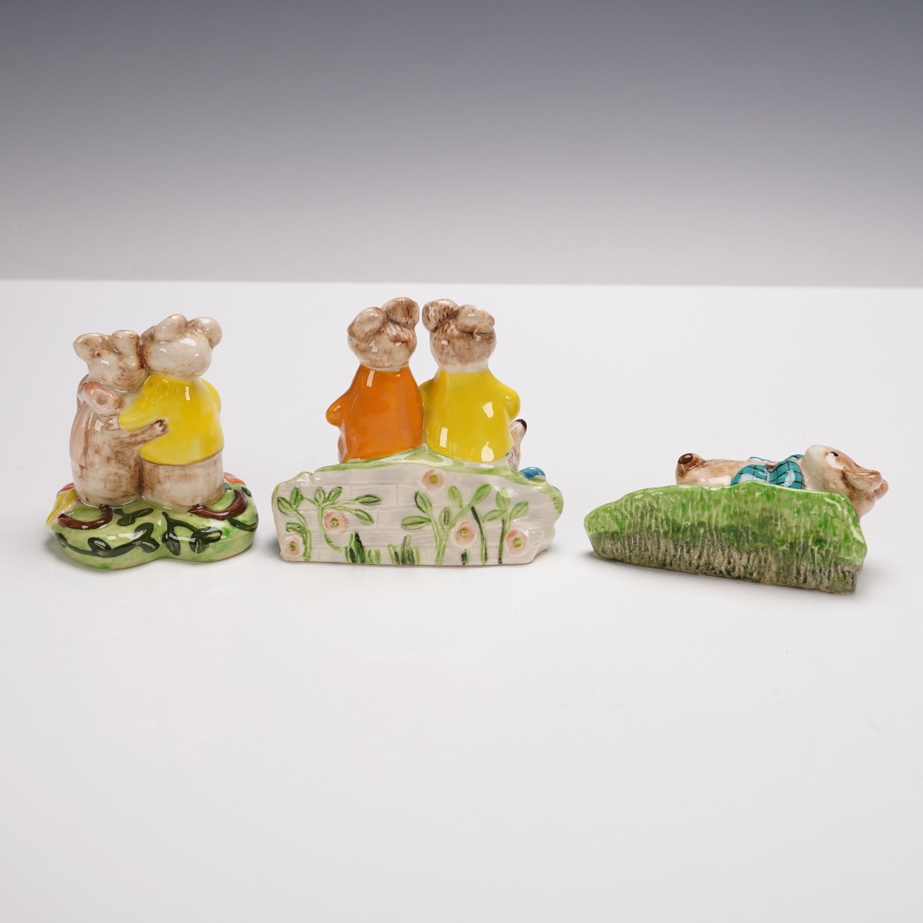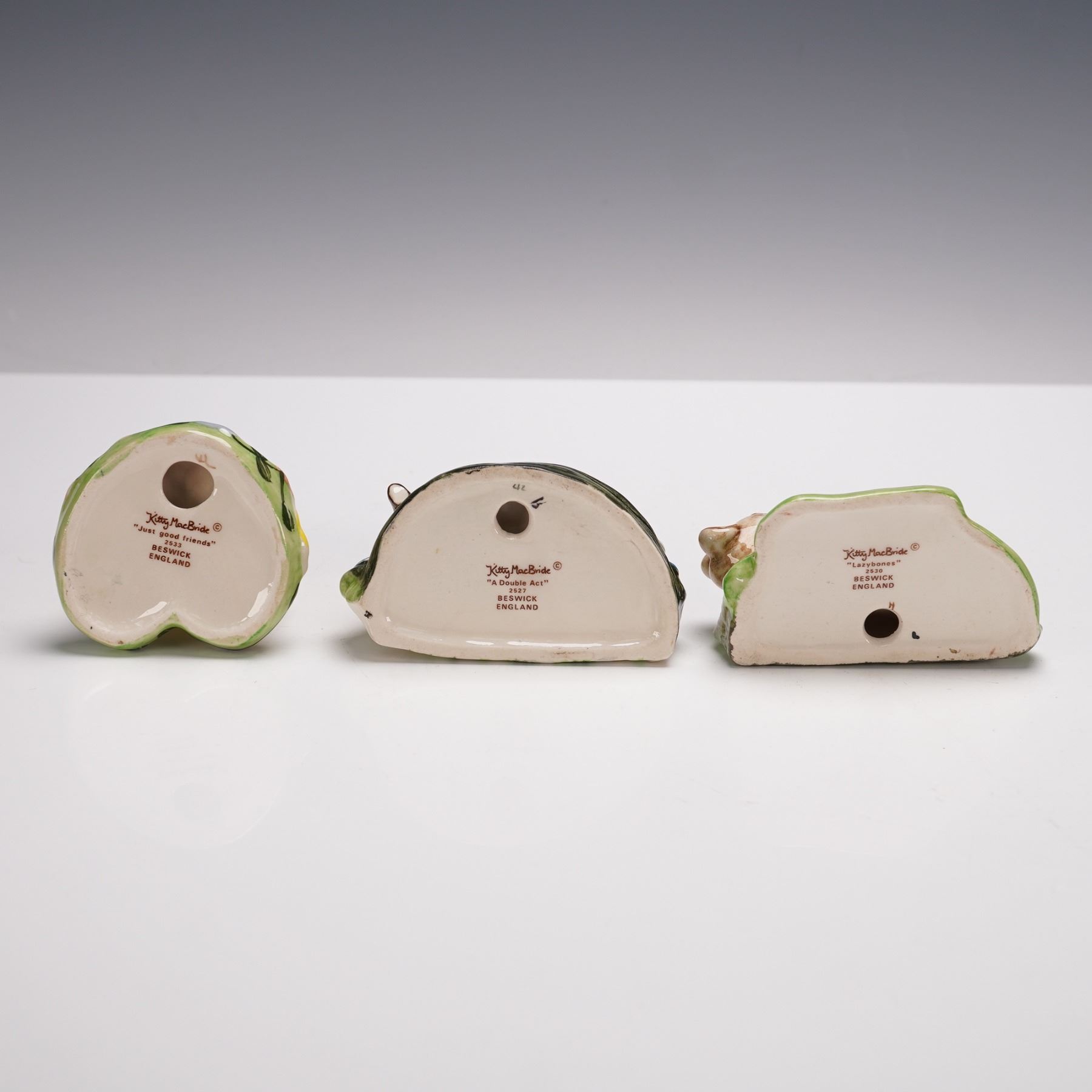 Including "Just Good Friends" (2533) depicting two mice embracing among colorful flowers, "A Double Act" (2527) featuring a pair of mice standing side by side in bright jackets with floral accents at their feet, and "Lazybones" (2530) showing a reclining mouse in a checked shirt resting on grass beside garden tools. Each piece is marked Kitty MacBride, Beswick, England.