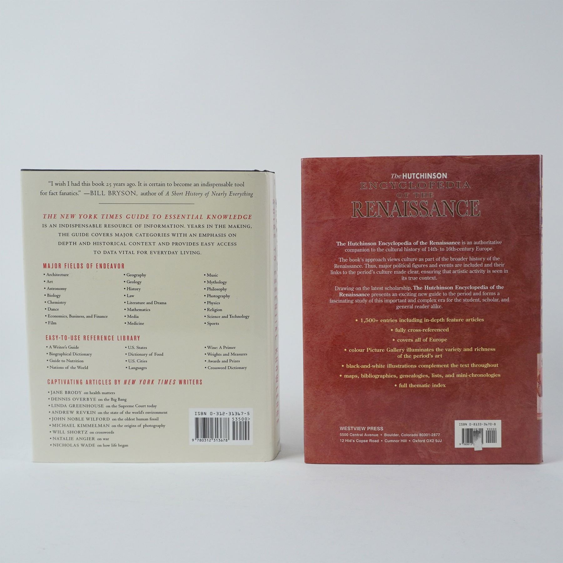 This collection of three books provides a comprehensive look at world history, cultural achievements, and essential knowledge. The New York Times Guide to Essential Knowledge is a reference book covering a wide range of topics, from science to history and culture. The History of the World: A 1000-Year Chronicle of Time presents an illustrated journey through major historical events and civilizations. The Hutchinson Encyclopedia of the Renaissance explores the art, philosophy, and innovations of the Renaissance period. A valuable collection for history enthusiasts, researchers, and lifelong learners. Largest book measures 17.75"H.