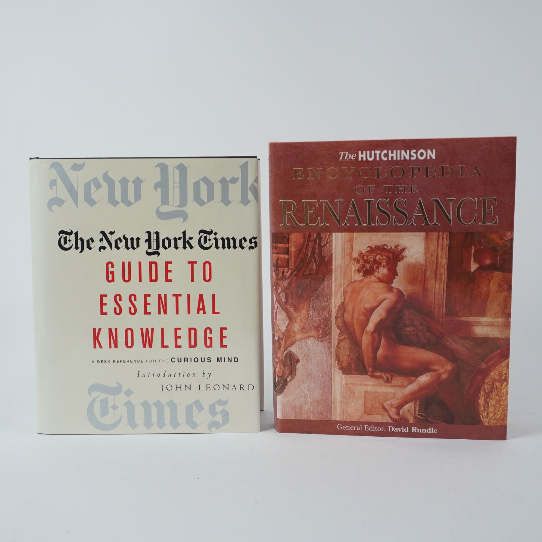 This collection of three books provides a comprehensive look at world history, cultural achievements, and essential knowledge. The New York Times Guide to Essential Knowledge is a reference book covering a wide range of topics, from science to history and culture. The History of the World: A 1000-Year Chronicle of Time presents an illustrated journey through major historical events and civilizations. The Hutchinson Encyclopedia of the Renaissance explores the art, philosophy, and innovations of the Renaissance period. A valuable collection for history enthusiasts, researchers, and lifelong learners. Largest book measures 17.75"H.