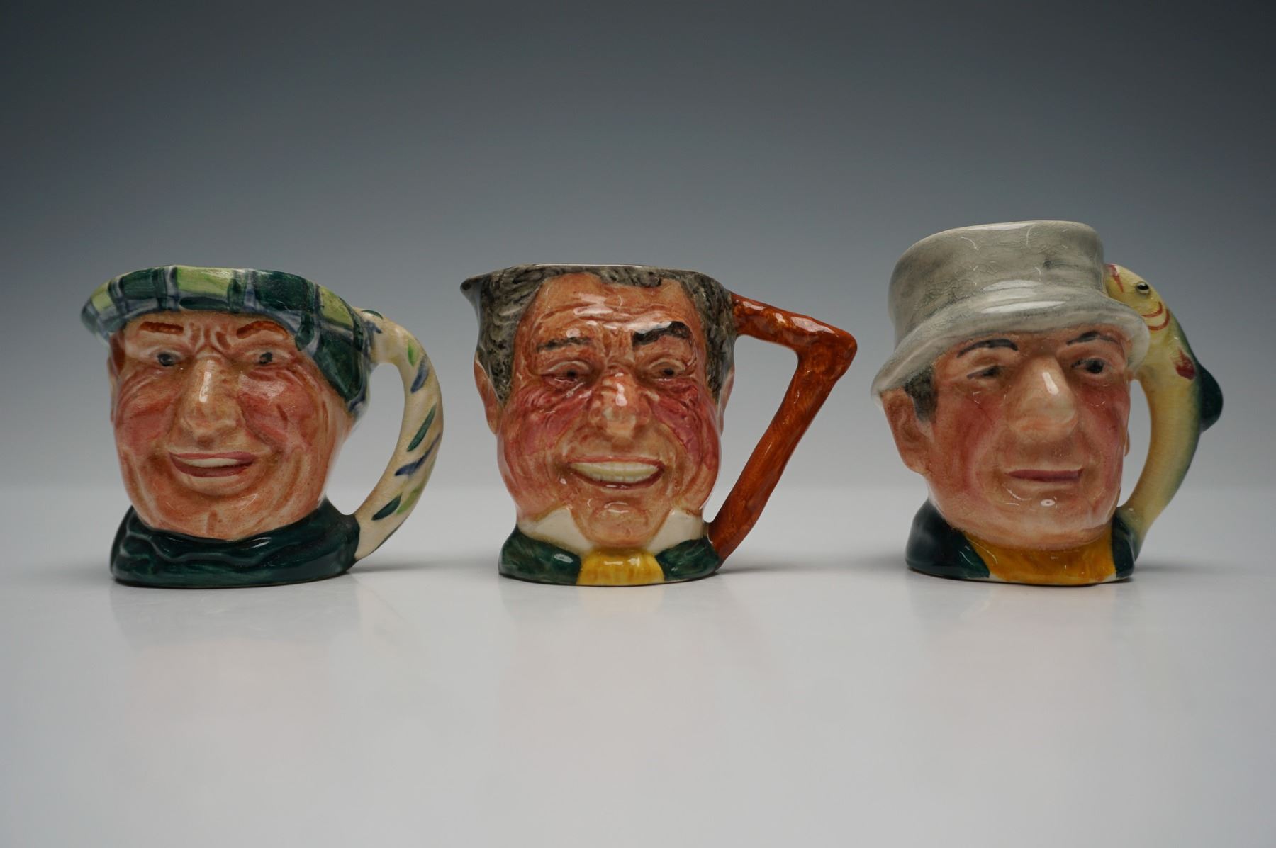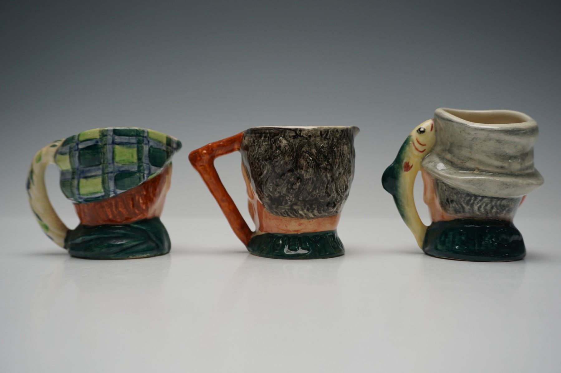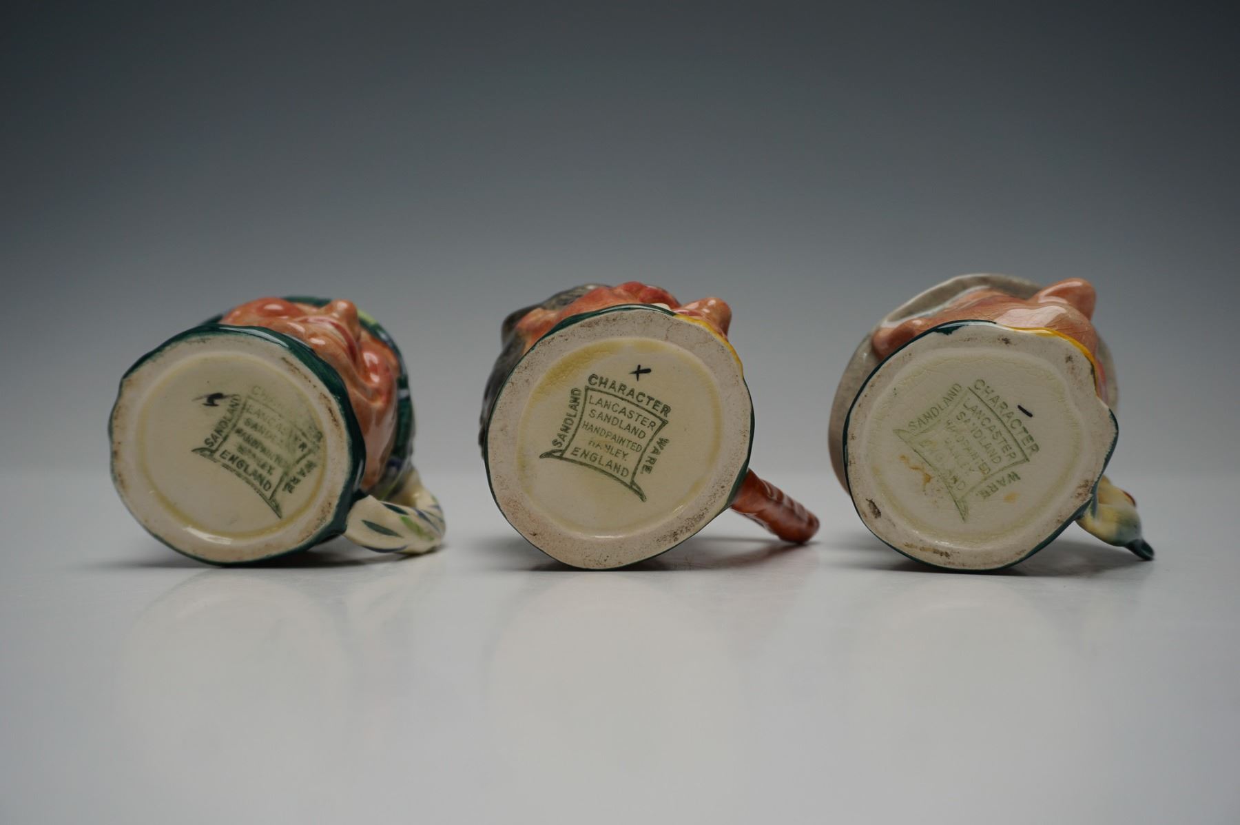 Charming set of three hand-painted character toby jugs by Sandland, Lancaster, made in Staffordshire, England. Each mug showcases expressive detailing and vibrant colors, depicting notable character designs with intricately sculpted handles. The bases are marked with Sandland Character Lancaster England and feature hand-painted accents. A delightful addition for collectors of toby jugs and vintage English pottery. Set includes Jolly Boy, Fisherman and Paddy. Lancaster Sandland backstamp on all.