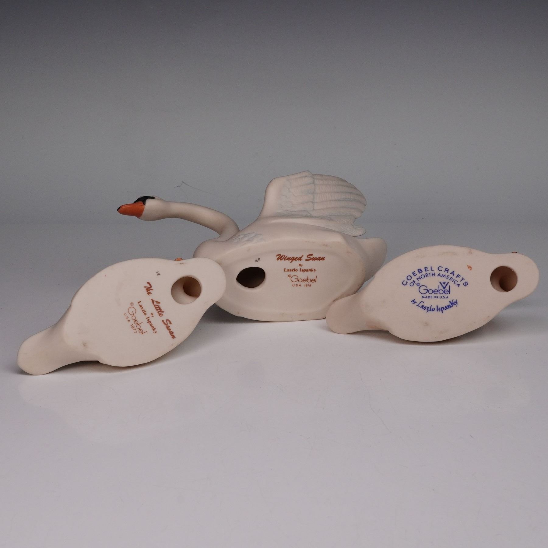 A charming set of three Goebel porcelain swan figurines designed by Laszlo Ispansky. This grouping includes the elegant Winged Swan with detailed open wings and two smaller swans, one titled The Little Swan. Each piece is finished in a soft bisque matte glaze with hand-painted orange beaks and delicate feather detailing. Marked on the underside with Goebel stamps and artist's signature. A lovely representation of Ispansky's artistry for Goebel Crafts of North America.